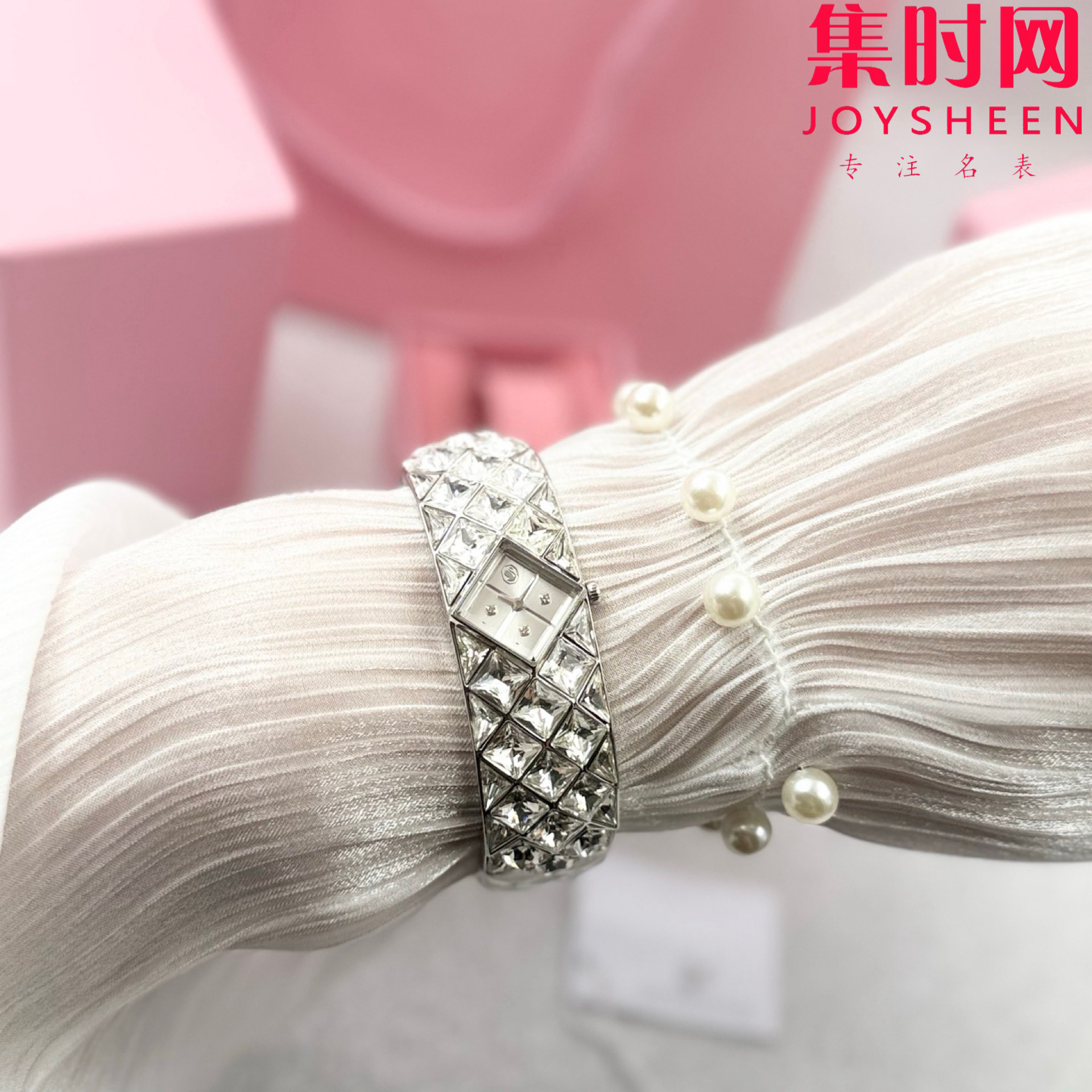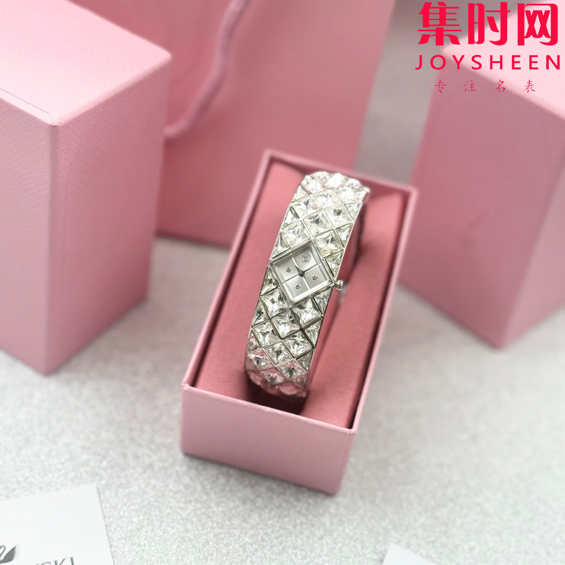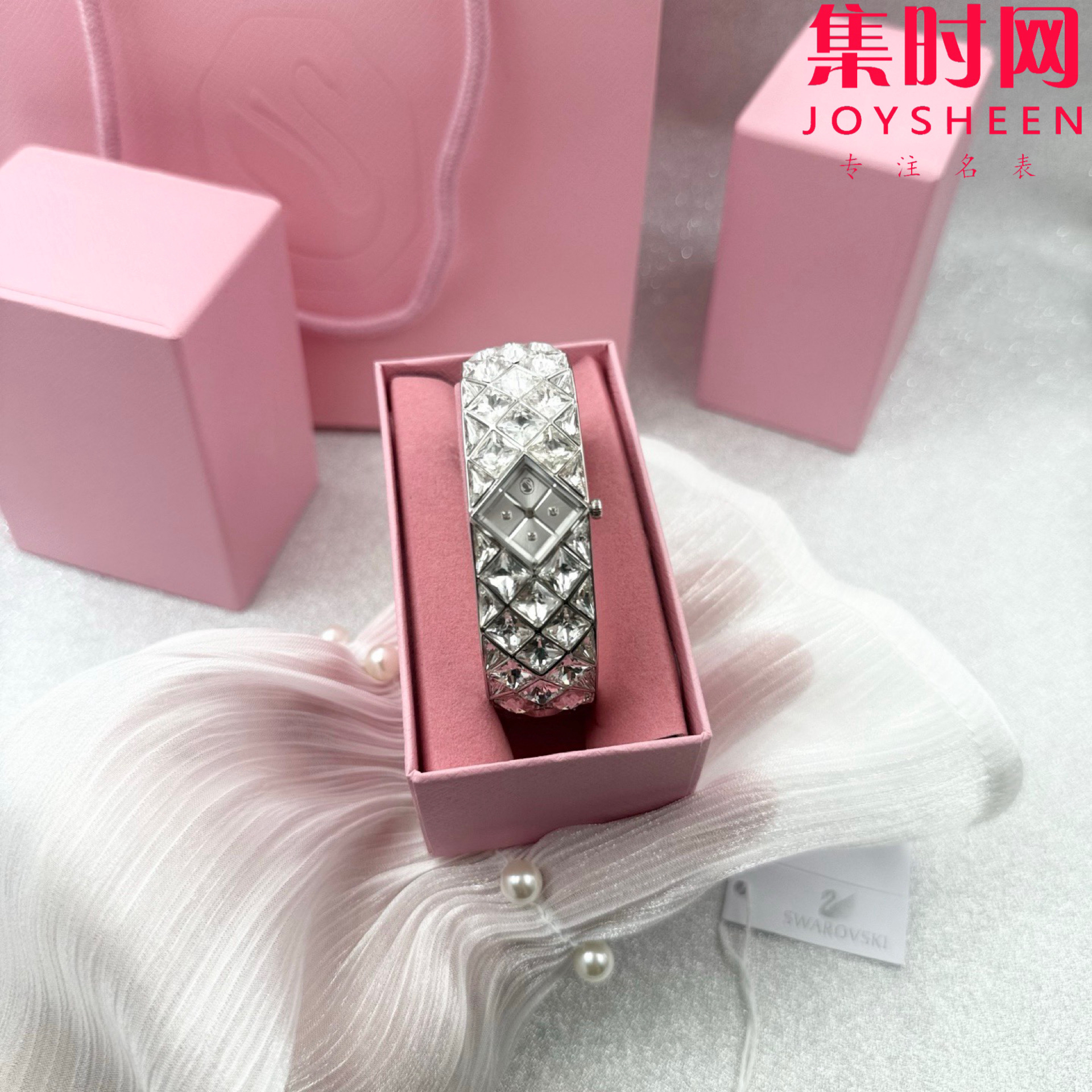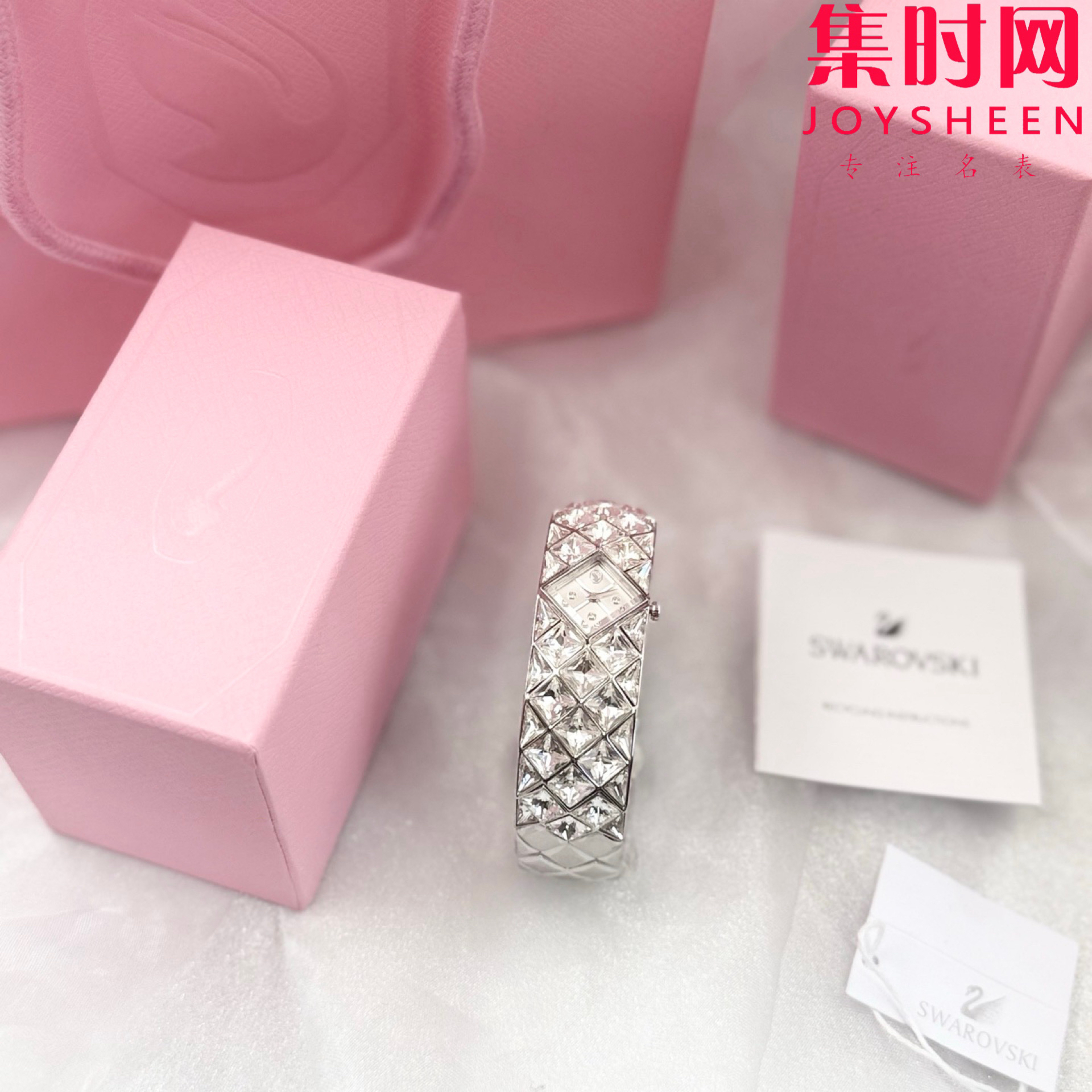 施华洛世奇新款 精致闪耀 女士手环满天星腕表 表盘似藏银河✨ 日常穿搭、重要场合,戴上即行走的精致种草机,秒让手腕成焦点,谁戴谁美,轻松拿捏氛围感,把浪漫闪耀都“戴”手上!这款手镯式腕表镶嵌 47 颗水晶,精美展现 Curiosa 系列的奢华格调,彰显施华洛世奇的璀璨传承与 savoir-faire。以不锈钢设计致意复古时代经典,20 毫米(宽)x 20.5 毫米(长)的表壳巧妙地镶嵌在令人惊艳的手链套装中,并饰有三角形切割和花式切割仿水晶。表盘的四分之一刻度处也镶嵌仿水晶。12 点钟位置饰有代表性的天鹅标志,是您出席精致场合的闪耀搭配!