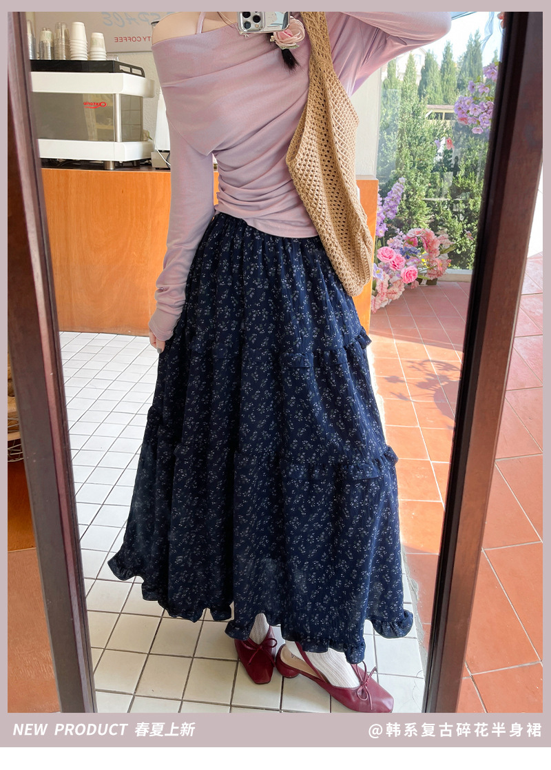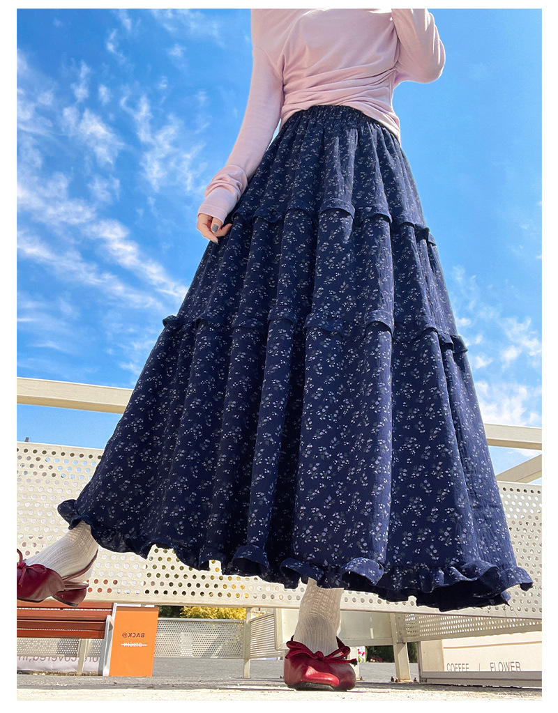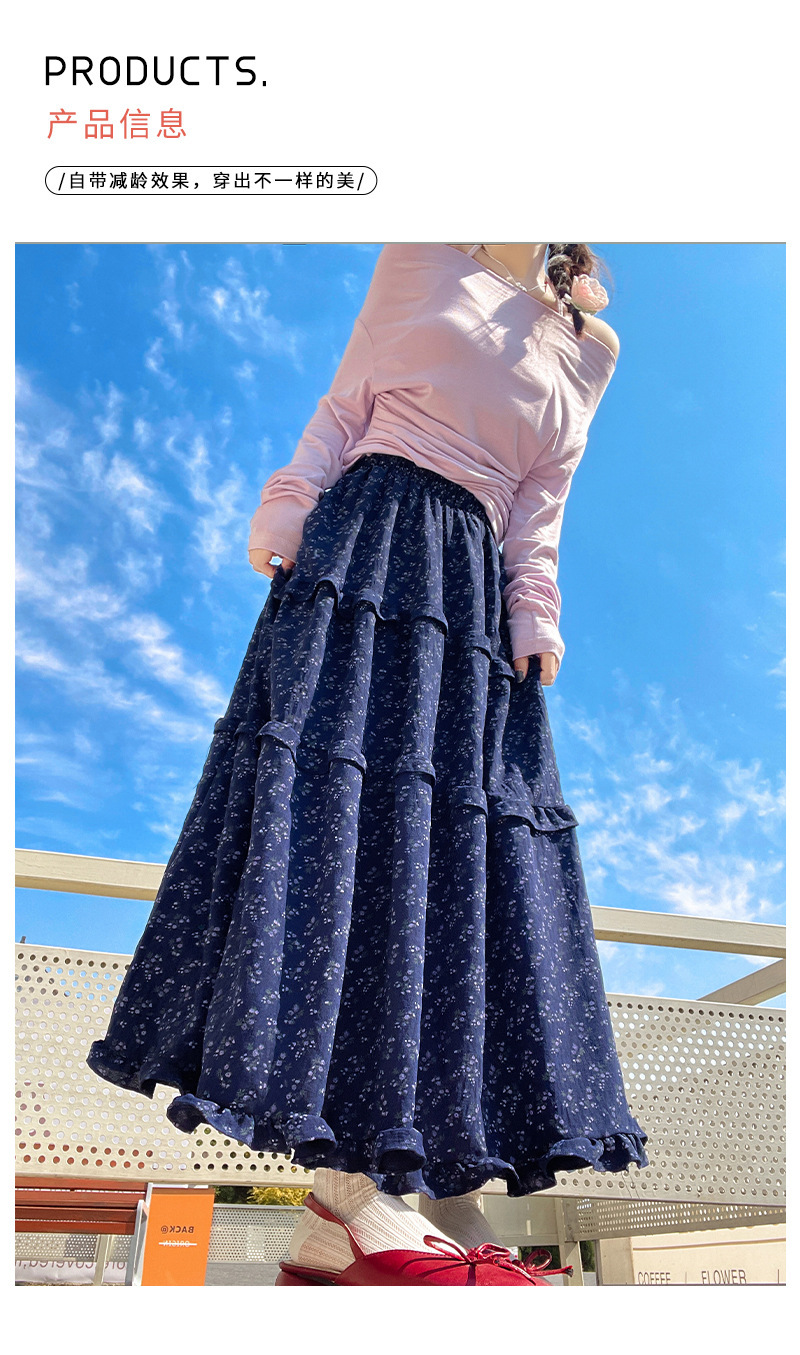 「气质款!碎花·蛋糕裙」半身裙女春秋冬新款韩式复古蓝色碎花闲慵懒风长裙子高腰a字裙