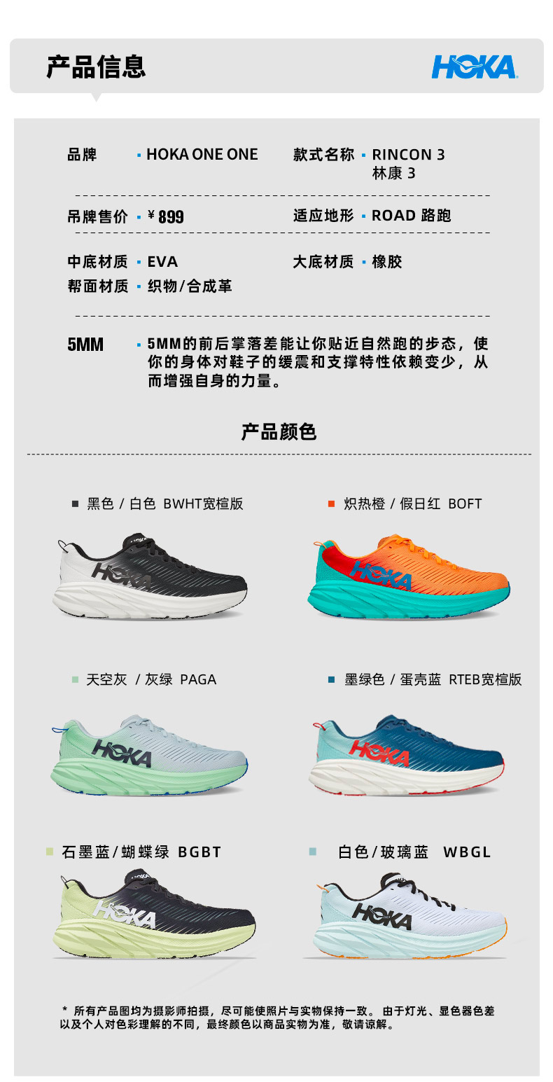 HOKA ONE ONE男女林康3减震公路跑步鞋Rincon3透气轻便防滑运动鞋
