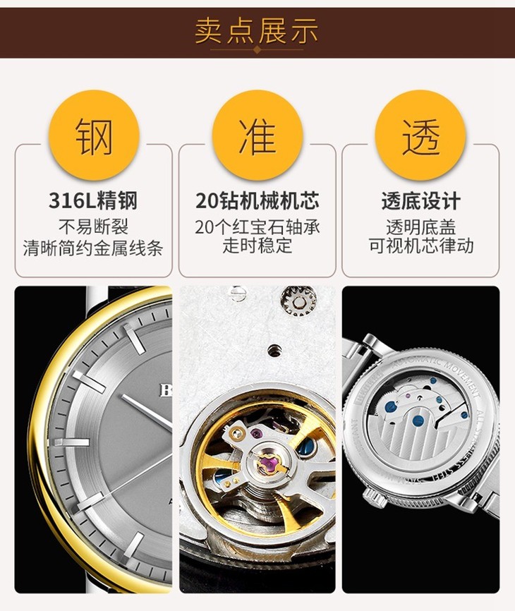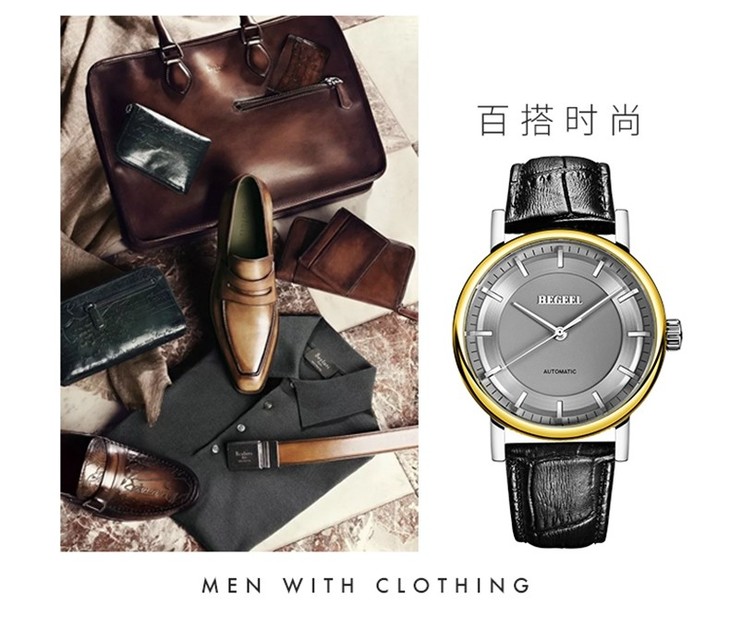 BEGEEL/宾爵 商务经典牛皮带防水全自动机械表男士手表 B73204MAJPY带授权招加盟代理