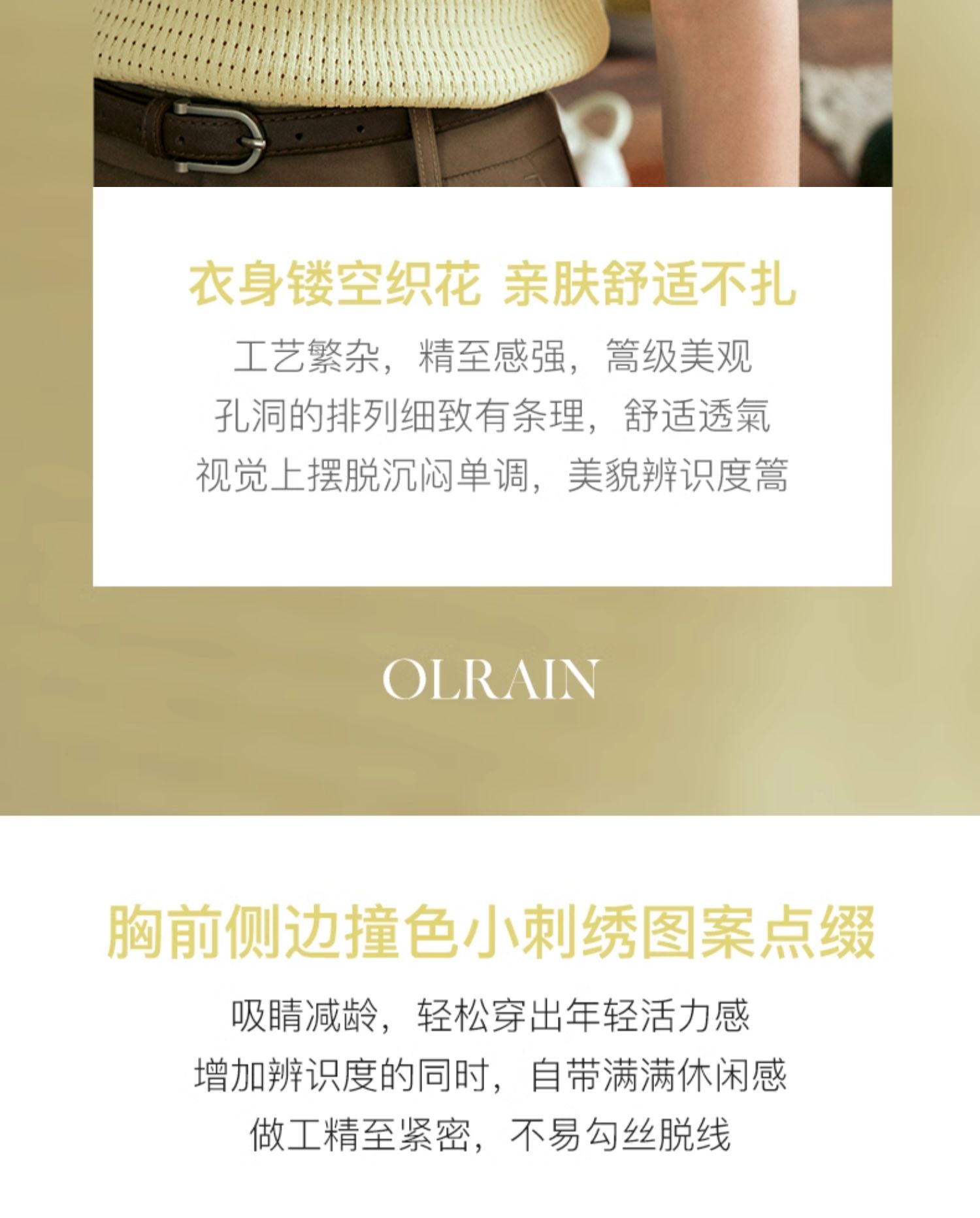 - “精致”是欧芮儿olrain品牌文化的核心,欧芮儿认为,精致的女人,不但要外在动人,更要内在迷人,内外兼修,有魅力、有气质、有内涵,自信而不自傲,优雅而不矫揉,自有万种风情而不轻浮,更不故作矜持。