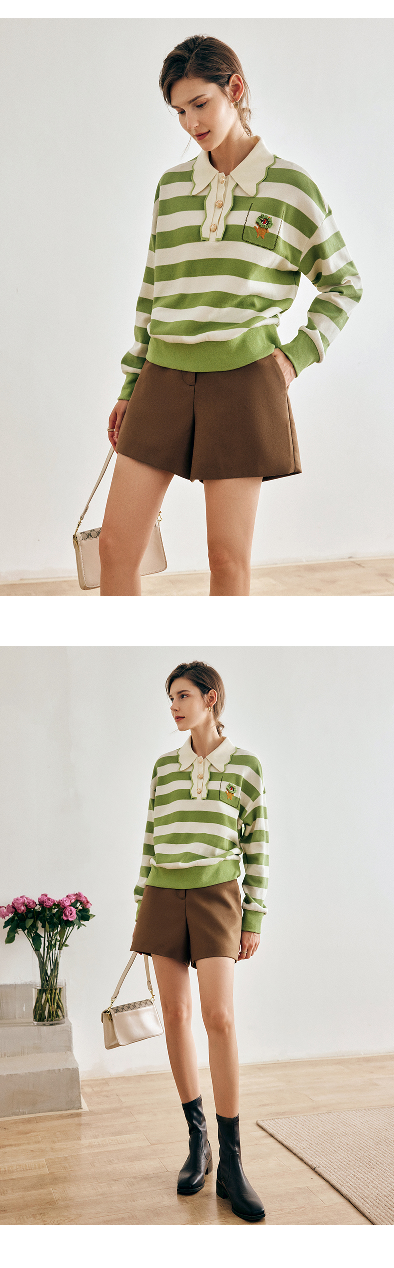 OLrain欧芮儿法式polo领条纹T恤女夏季2025年新款刺绣海军风上衣
