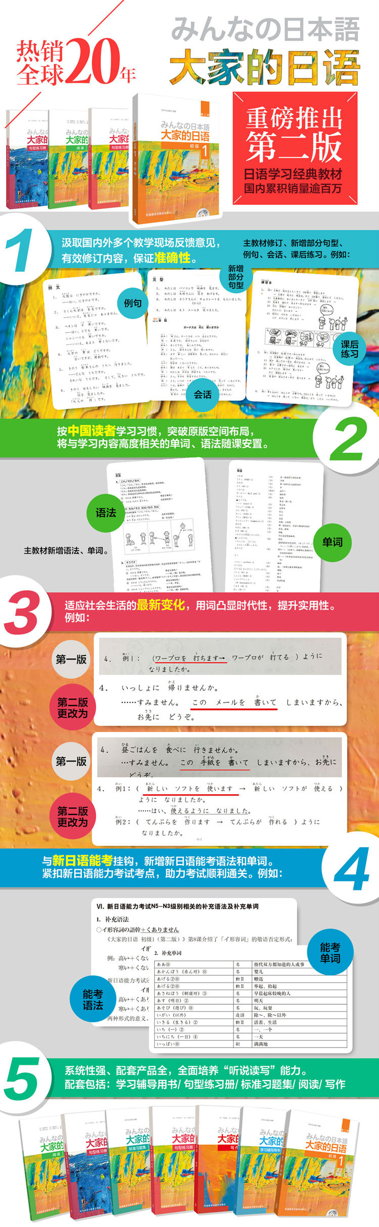 大家的日语(第二版)和新日语能力考试套装(专供网店)包括:大家的日语(第二版)(初级)(1)(配MP3光盘1张)大家的日语(第二版)(初级)(2)(配MP3光盘1张)5周突破新日语能力考试文字词汇N3(配Mp3光盘)5周突破新日语能力考试听解N3(配MP3光盘)5周突破新日语能力考试读解N35周突破新日语能力考试语法N3
