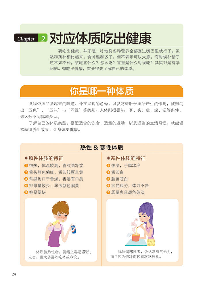 作 者 序 把吃出来的病吃回去 推 荐 序 吃对了,跟大病小病说再见 推 荐 序 用食物为自己做自疗 导 读 如何使用本书 索 引 常见病笔画速查表 Part 1 疾病食疗养生 Chapter 1 食物是你*好的医生 18 懂得“挑食”才健康 19 认识食物“五味” 20 认识食物“五色” 22 认识食物“四性” Chapter 2 对应体质吃出健康 24 你是哪一种体质 26 8大体质就要这样吃 Chapter 3 常见食物聪明吃 28 健康加分的饮食组合 31 过量有碍健康的饮食组合 36 吃东西小心配错饮料 38 单一食材注意事项 Chapter 4 营养素的15种保健功效 Chapter 5 四季养生食疗法则 44 春季滋补养生 45 夏季清热解毒 46 秋季滋阴润肺 47 冬季温润补元 84 荨麻疹 远离过敏原,提升免疫力 ● 鲜橙菠萝汁 循环系统疾病 86 高血压 钠摄取量每日2~2.4克 ● 香芹炒豆干 ● 焗烤土豆西红柿盅 ● 茄汁糖醋鱼 90 冠心病 多吃蔬果、高纤食品 ● 五谷红枣饭 93 心肌梗死 采取低胆固醇饮食 ● 腐皮炒菠菜 96 心肌炎 少量多餐,均衡饮食 ● 花生酱拌西芹 肝胆科疾病 98 乙型病毒性肝炎 脂肪摄取每日 35~45克 ● 时蔬炒豆腐 ● 西红柿炒蛋 ● 香煎白带鱼 102 脂肪肝 控制总热量,减少脂肪 摄入 ● 鲜蔬糙米粥 ● 枸杞蒸蛋 ● 蚝油生菜 106 胆结石 低糖、低脂、低胆固醇 ● 核桃拌香蕉 ● 草莓芦笋手卷 ● 金香菠萝拌三文鱼 Part 2 60种常见病饮食宜忌 呼吸系统疾病 50 感冒 选择软、流质食物 ● 姜汁红薯甜汤 ● 姜丝炒冬瓜 ● 苋菜香炒咸蛋 54 哮喘 减少食品添加剂的摄入 ● 糖醋洋葱鸡* 56 支气管炎 均衡饮食,补充营养 ● 胡萝卜番石榴汁 消化系统疾病 58 胃炎 避免刺激、酸甜、难消化的 食物 ● 香甜莲藕汁 ● 蛋香芦荟粥 ● 豆腐蛋黄粥 62 胀气 避免容易产气的食物 ● 香蕉木瓜汁 65 便秘 多喝水,摄取高纤食物 ● 凉拌牛蒡魔芋丝 68 痔疮 饮食温和,口味清淡 ● 沁凉西瓜果醋饮 71 腹泻 选择富含水溶性膳食纤维的 食物 ● 鲜美三文鱼粥 皮肤科疾病 74 青春痘 饮食清淡,多吃蔬果 ● 凉拌鲜蔬沙拉 ● 鲜果苦瓜汁 ● 美颜葡萄柚果冻 78 湿疹 摄取均衡完整的营养 ● 丝瓜茶汤 81 过敏 饮食均衡,服用益生菌 ● 青柠香烤三文鱼 CONTENTS 目 录 110 尿毒症 避免食用加工食品 ● 翡翠圆白菜卷 ● 爽口藕饴 ● 香炸三蔬 泌尿系统疾病 114 肾结石 摄取足量水分和钙质 ● 黄瓜烩海参 117 泌尿系感染 少糖、多蔬果 ● 西红柿黄瓜蔬菜卷 甲状腺疾病 120 甲状腺功能亢进 减少碘摄取 ● 豌豆角炒鸡柳 ● 韭菜炒鱿鱼 ● 胡萝卜小排粥 124 甲状腺功能低下 低热量饮食 ● 海带排骨汤 骨关节疾病 126 骨质疏松症 补充钙质 ● 红薯叶味噌汤 ● 油菜炒丁香鱼 ● 开阳芥蓝 风湿免疫系统疾病 130 类风湿性关节炎 营养均衡 ● 白菜豆腐三文鱼汤 ● 香煎鱼 ● 海带豆腐汤 精神神经系统疾病 134 偏头痛 三餐定时定量 ● 麻酱凉拌紫茄 ● 麻婆豆腐 ● 核桃莲藕甜汤 138 中风 选择多元不饱和脂肪酸食物 ● 牡蛎汤 ● 翡翠菠菜鲷鱼卷 ● 豆酥鳕鱼 142 坐骨神经痛 均衡饮食,控制热量 ● 红豆糙米饭 145 帕金森综合征 适量摄取坚果 ● 草莓杏仁冻 148 阿兹海默症 补充鱼类,避免刺 激品 ● 清蒸豆腐三文鱼 造血系统疾病 150 贫血 摄取足够营养,不偏食 ● 绿菠猪肝汤 ● 蛤蜊蒸蛋 ● 香芹炒牛* 154 白血病 选择新鲜食材,不生食 ●●焗烤彩椒金*鱼 ● 清炖西红柿排骨汤 ● 松子炒饭 代谢与内分泌系统疾病 158 高脂血症 少饱和脂肪酸, 多 蔬果 ● 五味鲳鱼 ● 蒜烧鳗鱼 ● 凉拌紫茄 162 糖尿病 少油、少盐、少糖、高纤 ● 牛蒡炒*丝 ● 果香麦粥 ● 核桃苹果牛奶 166 痛风 补充水分,多吃碱性食物 ● 芹菜蔬果汁 ● 圆白菜胡萝卜汁 ● 清炒丝瓜 CONTENTS 妇科疾病 170 痛经 不偏食,避免生冷食物 ● 山药红豆汤 ● 红枣山药排骨汤 ● 芦笋西红柿牛奶 174 子宫内膜异位症 远离油炸食物 ● 西蓝花炒鱼片 ● 三文鱼炒西芹 ● 栗子烧白菜 178 女性更年期综合征 多元均衡饮食 ● 豆浆燕麦粥 ● 菠萝苹果优酪乳 ● 山药桂香荞麦面 182 白带异常 营养均衡,饮食清淡 ● 高纤红薯糙米饭 ● 橙香鸡*鲜蔬卷 ● 黑木耳炒蛋 男科疾病 186 阳痿 补充营养素 ● 韭菜炒干贝 ● 苋菜炒羊* ● 葡萄优酪乳 190 前列腺炎 补充水分,远离烟酒 ● 牡蛎盖饭 儿科疾病 193 麻疹 避免刺激性食物 ● 牛*香拌四季豆 195 水痘 补充维生素A、B族维生素和 维生素C ● 鸡柳炒银芽 目 录 眼科疾病 197 近视 多吃黄绿色蔬菜 ● 枸杞子鳗鱼汤 ● 虾米炒空心菜 ● 乌贼鲜果沙拉 201 结膜炎 补充营养,避免辛辣食物 ● 鸡蛋奶冻 ● 土豆炒鸡* ● 百合拌金*鱼 205 白内障 多吃新鲜蔬果,补充水分 ● 枸杞子炒圆白菜 ● 鸡蓉玉米浓汤 ● 彩椒拌芦笋 209 青光眼 每次饮水不超过300毫升 ● 芝麻拌菠菜 耳鼻喉科疾病 212 过敏性鼻炎 均衡摄取6大类营 养素 ● 猪肝炒菠菜 ● 韭菜拌核桃 ● 罗勒玉米蛋饼 216 鼻窦炎 适量选择温性食物 ● 洋葱西蓝花浓汤 ● 苋菜香炒皮蛋 ● 清煮南瓜 牙科疾病 220 牙周病 不偏食,摄取足够营养 ● 西红柿乳酪三明治 ● 银鱼炒苋菜 ● 蜂蜜柠檬汁 224 口腔溃疡 避免辛辣、重口味食物 ● 香甜燕麦浆 ● 冬瓜三文鱼汤 ● 降火芦笋苦瓜汁 228 肺癌 多吃蔬果,适量饮用绿茶 ● 糖醋凉拌花椰菜 ● 芦笋炒三丝 ● 上海青炒香菇 232 肝癌 不可食用发霉食物 ● 清蒸鲜菇鳕鱼 ● 红枣百合炒豆苗 ● 小黄瓜炒猪肝