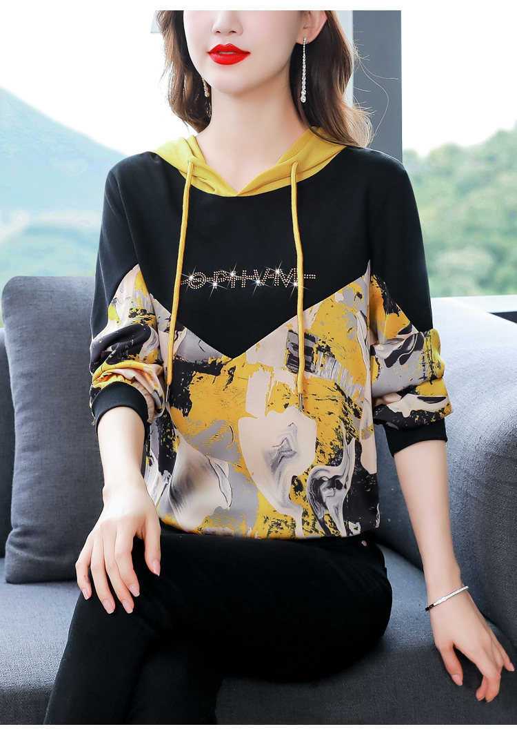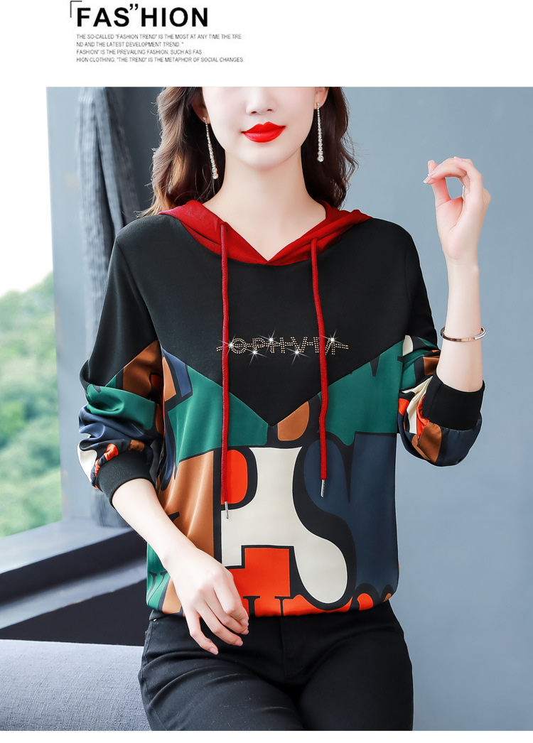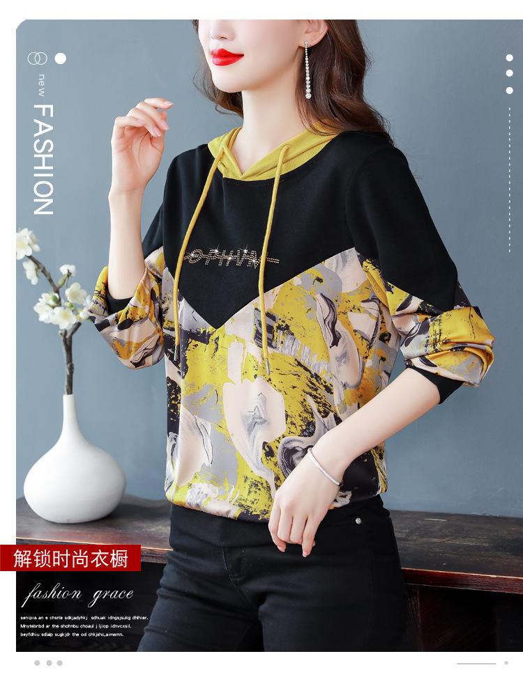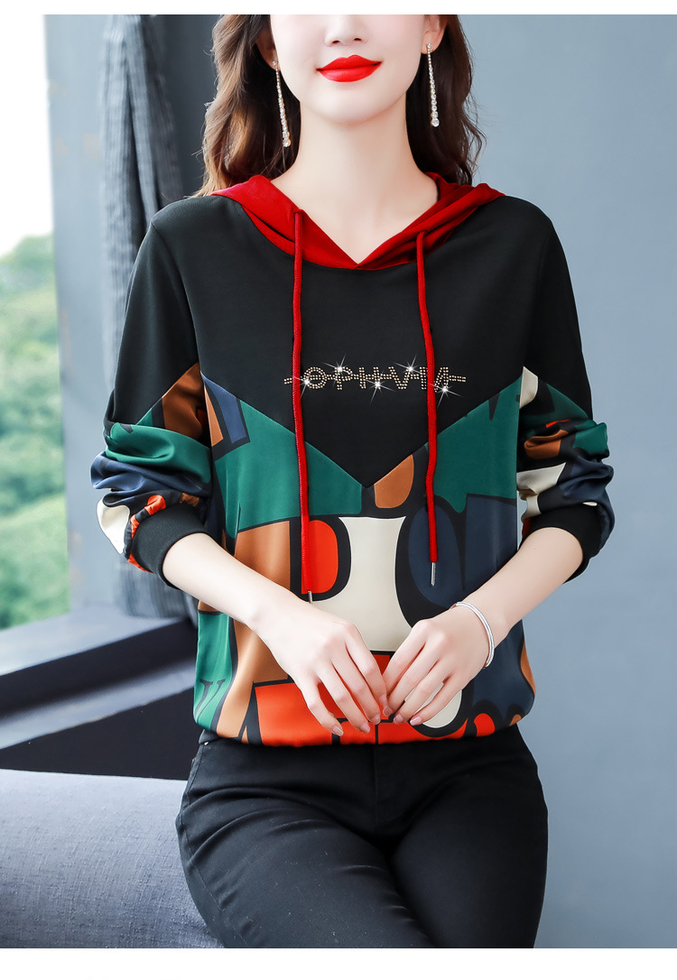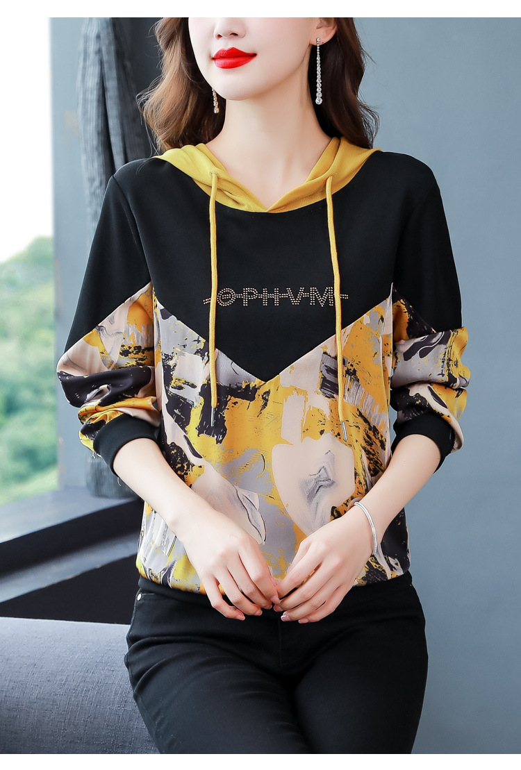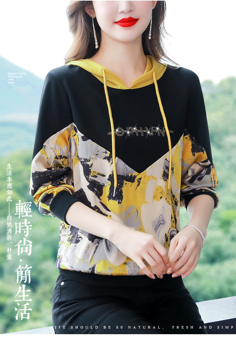 新款时尚缎面拼接镶钻连帽卫衣打底衫宽松显瘦上衣KQL-D31M912