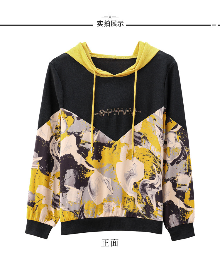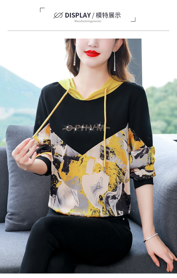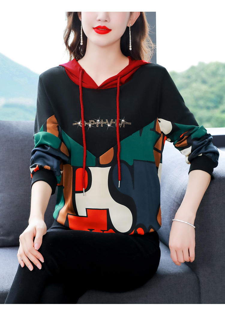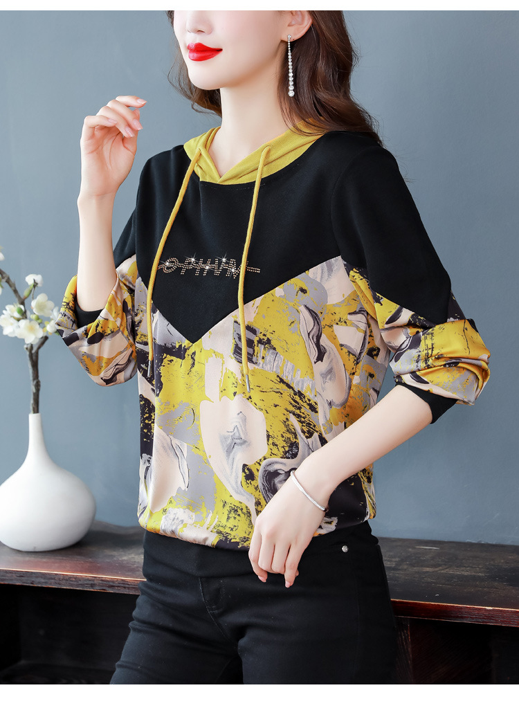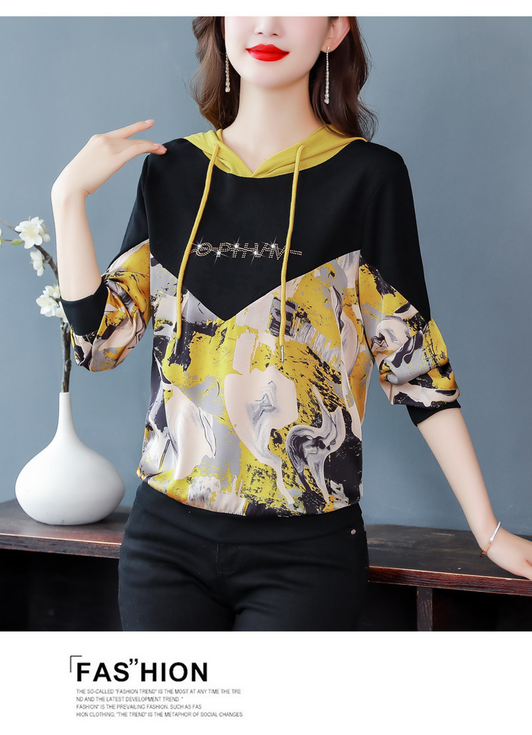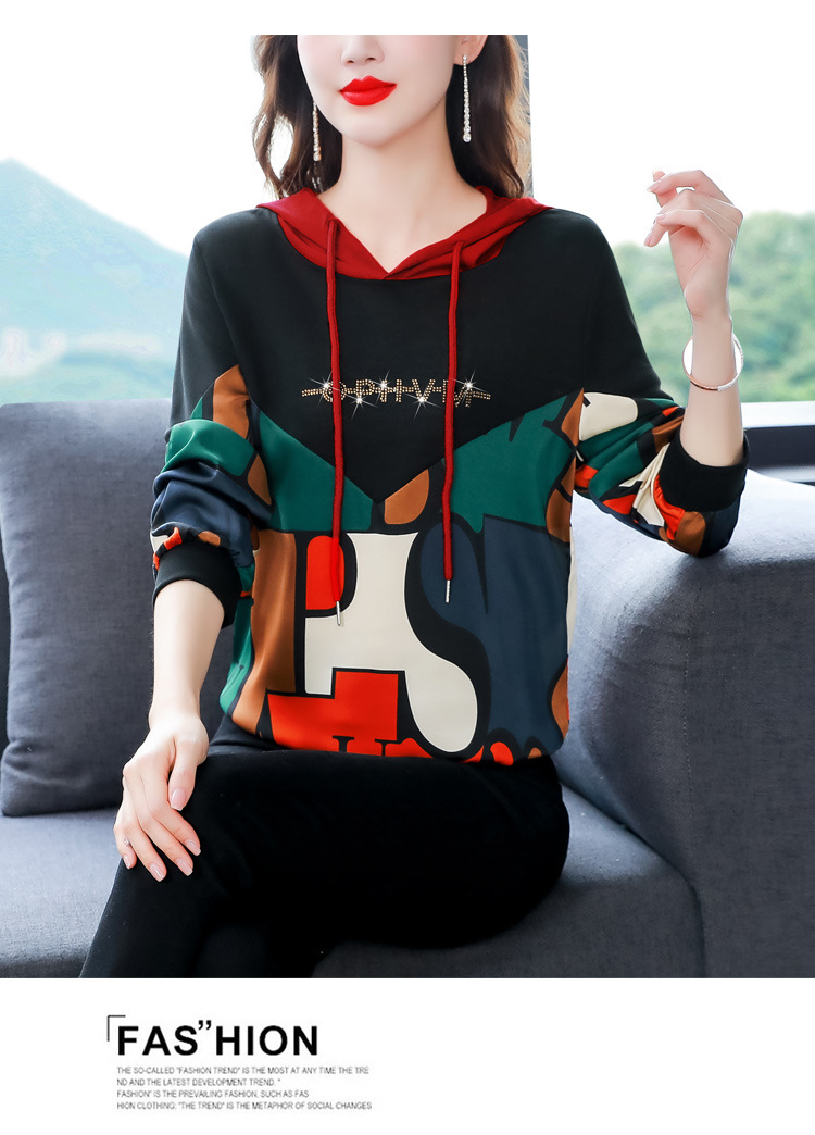 新款时尚缎面拼接镶钻连帽卫衣打底衫宽松显瘦上衣KQL-D31M912