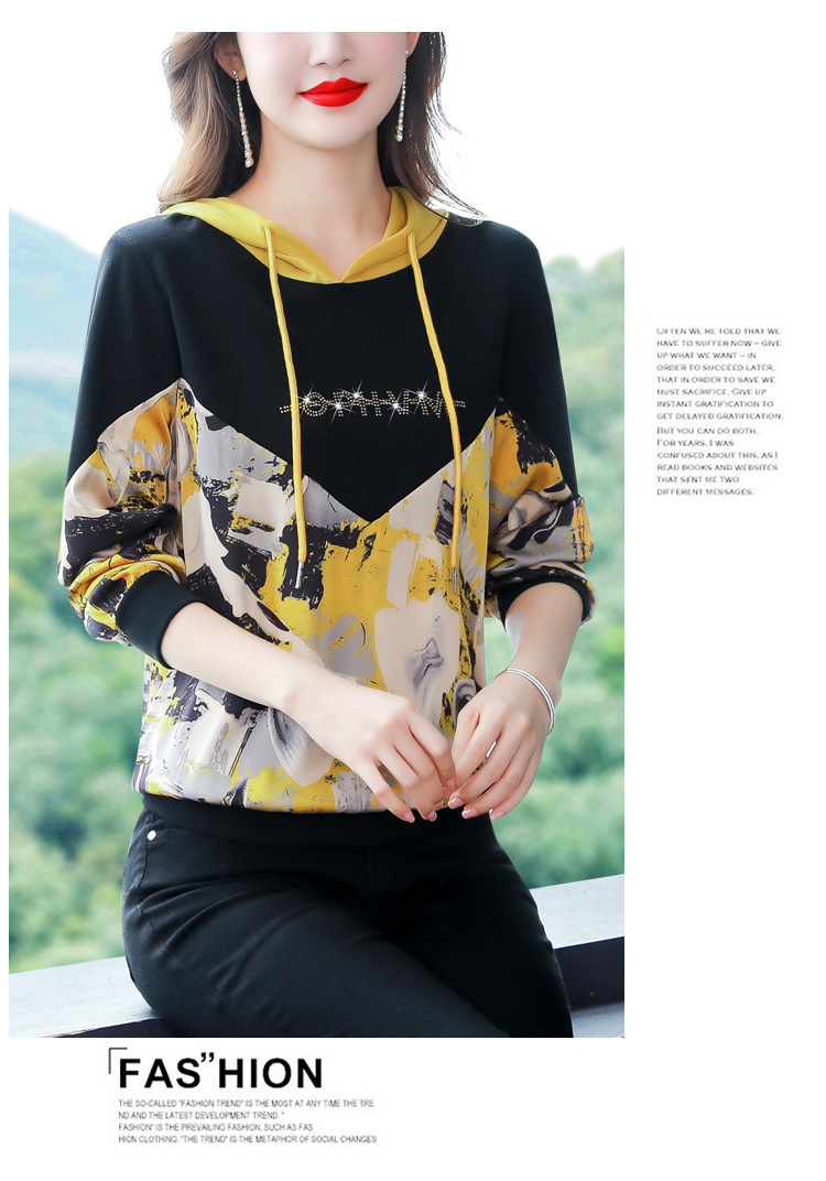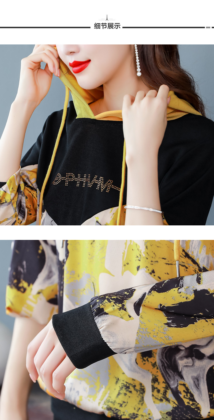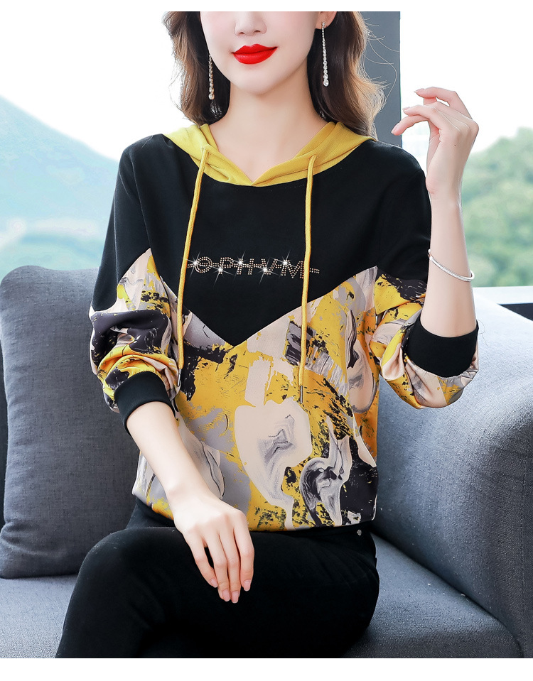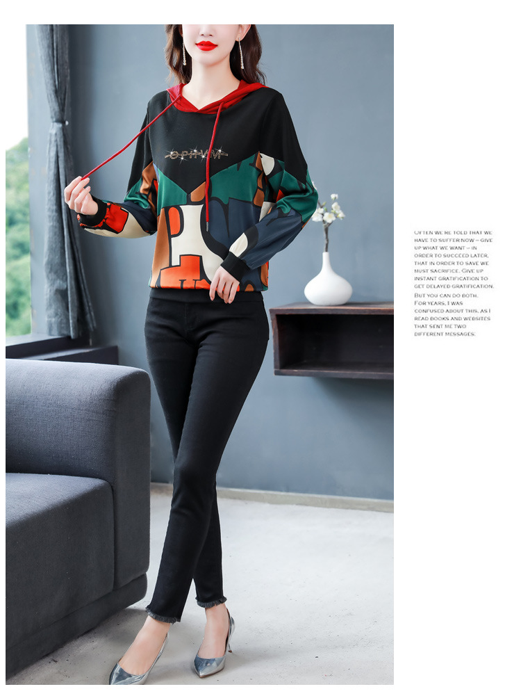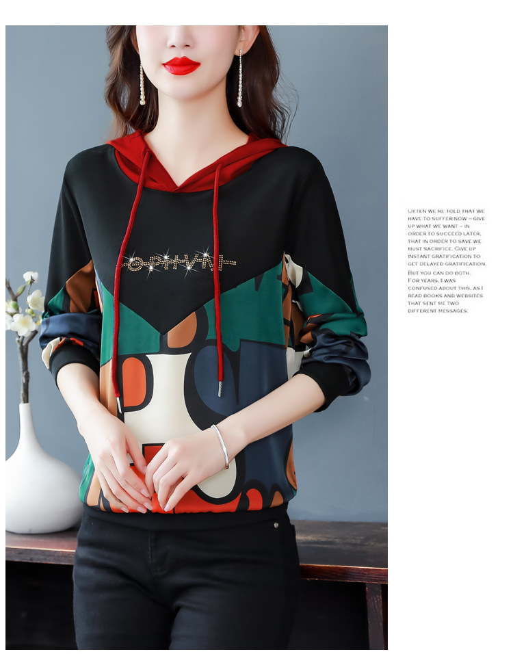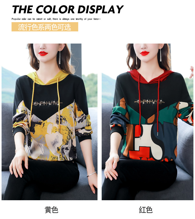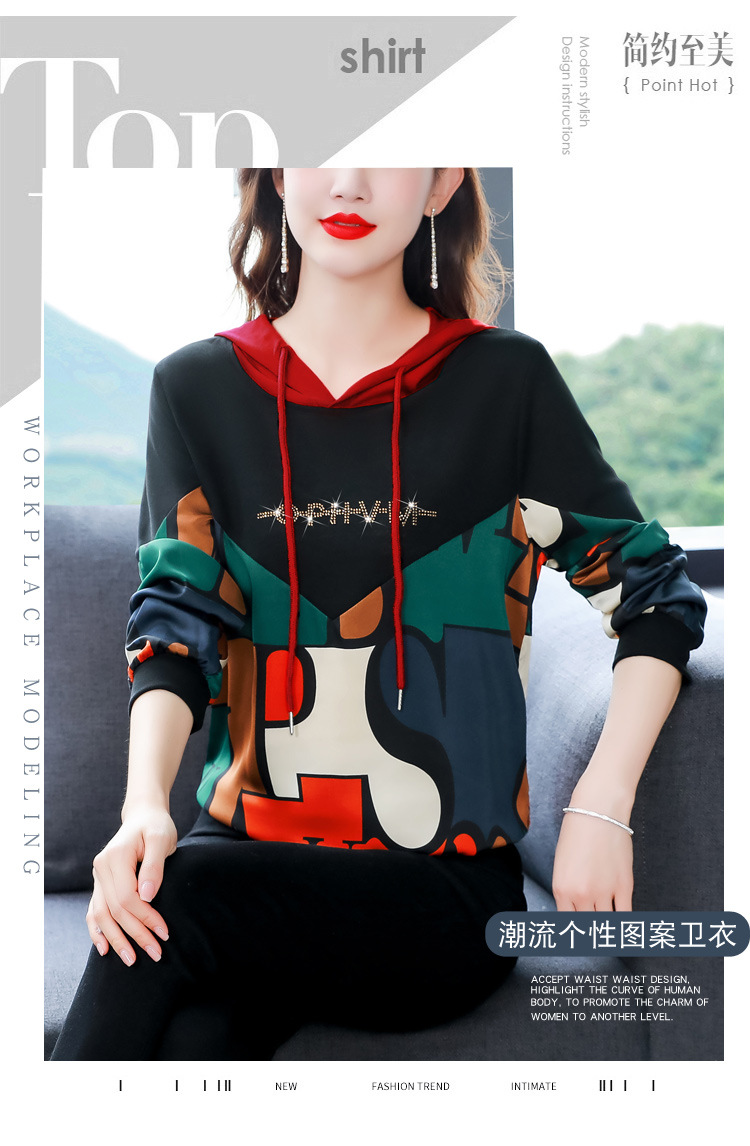 新款时尚缎面拼接镶钻连帽卫衣打底衫宽松显瘦上衣KQL-D31M912