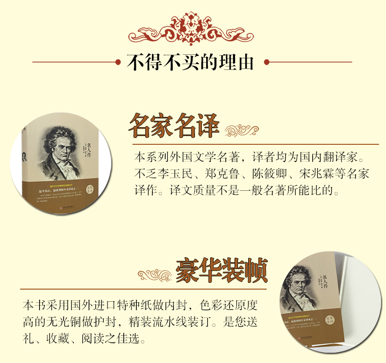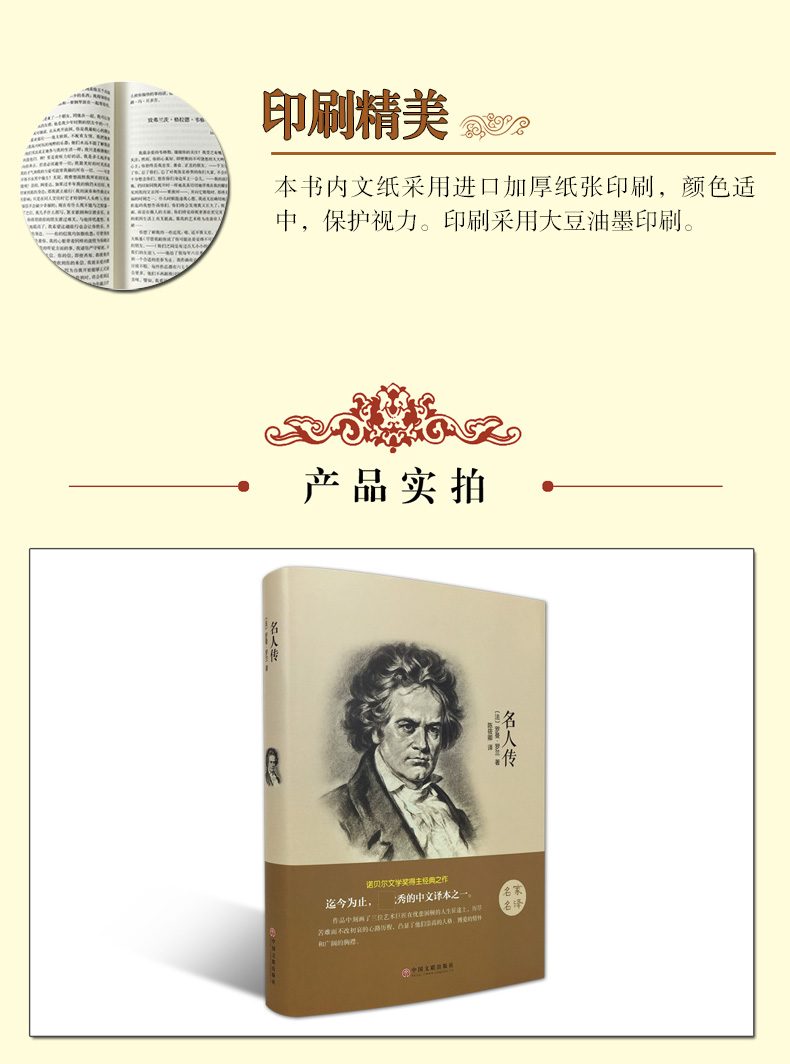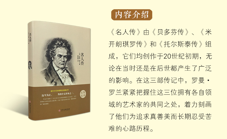 《名人传》,是由19世纪末20世纪初法国著名的批判现实主义作家罗曼·罗兰(1866~1944年)创作的人物传记作品,它包括《贝多芬传》(1903)、《米开朗琪罗传》(或译作米开朗基罗)(1906)、《托尔斯泰传》(1911)三部传记,传记共计字数268000。称为“三大英雄传记”,也被称为“巨人三传”。这本书也非常好地印证了一句中国人的古训:古今之成大事业者,非惟有超世之才,亦必有坚韧不拔之志。
