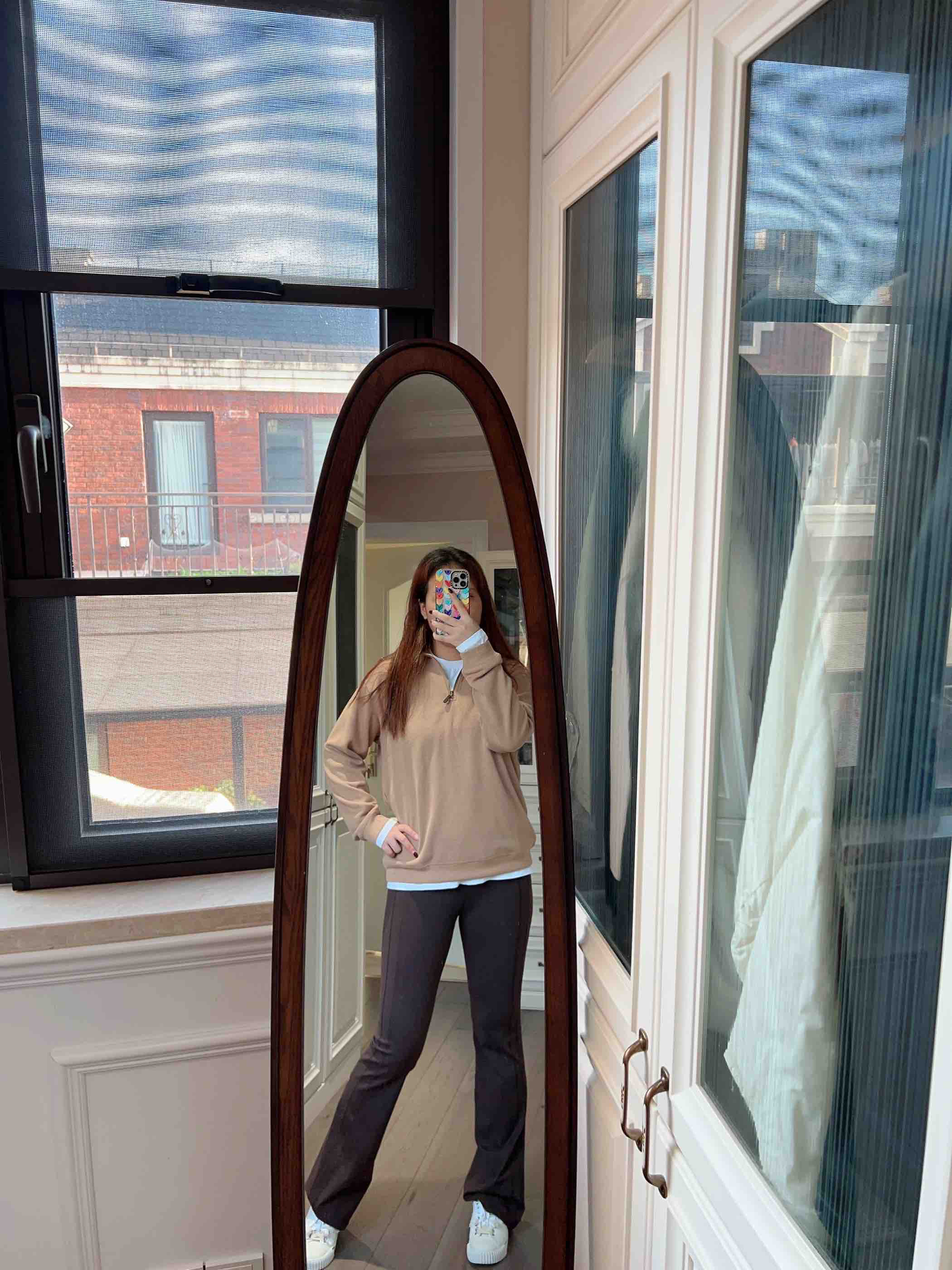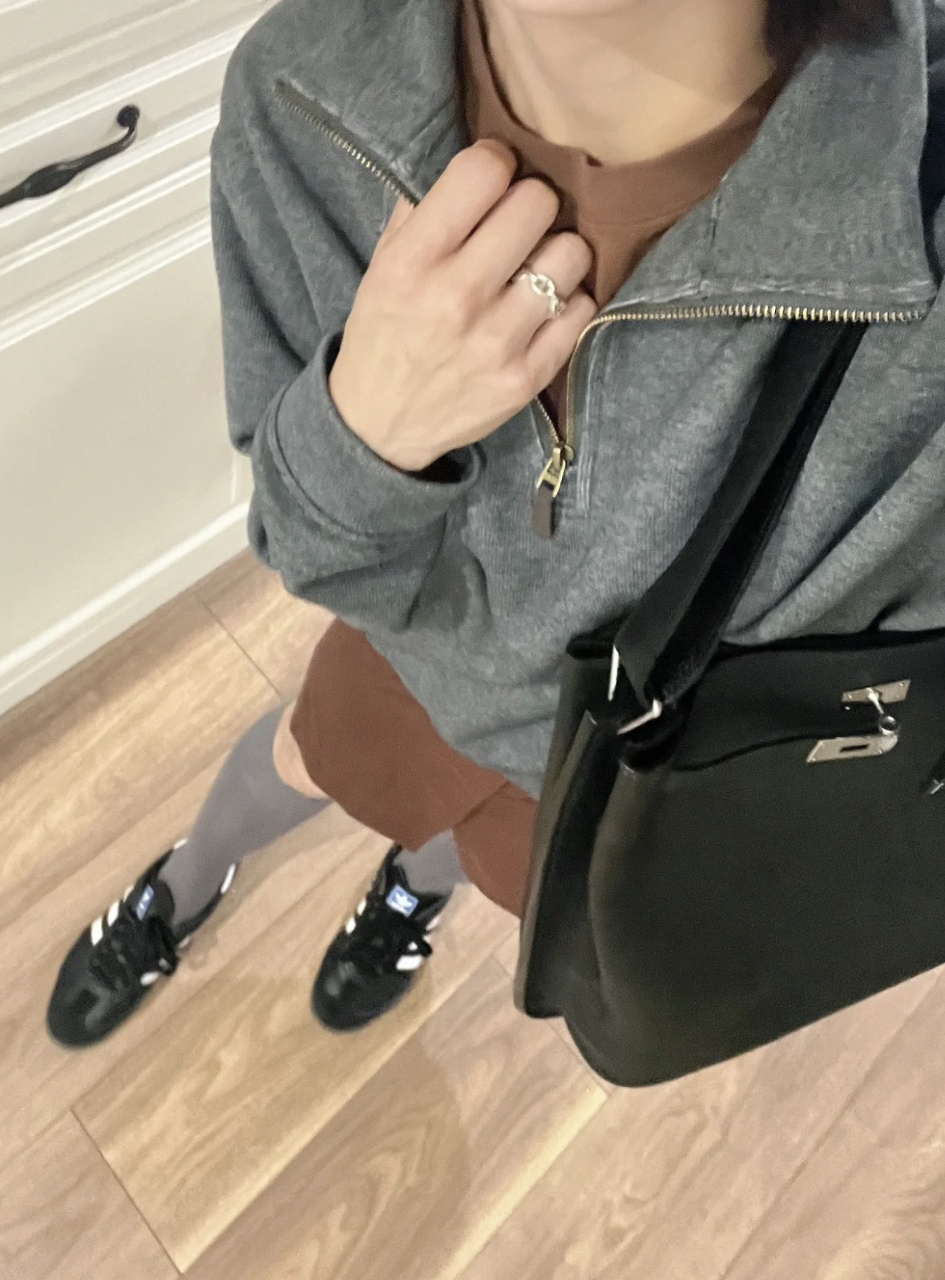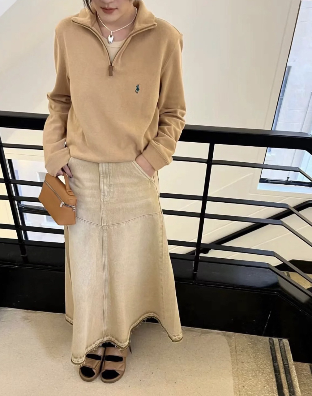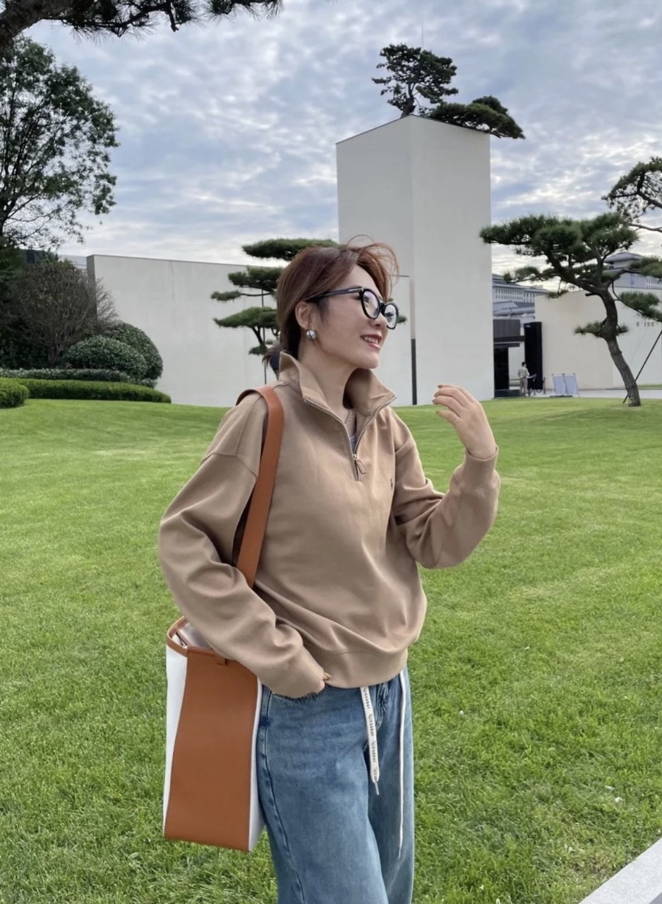 简冰同款驼色,确实。。。。有设计师那味儿了,近看表面是坑条针织棉,古铜色拉链头,下面有焦糖色拉链吊坠,标志性的马车标,依然来自德国针车,一根不断线,有肌肉有层次,袖口喝下摆跟大身同样的材质,不过收紧的螺纹,因此整件会更加松弛。