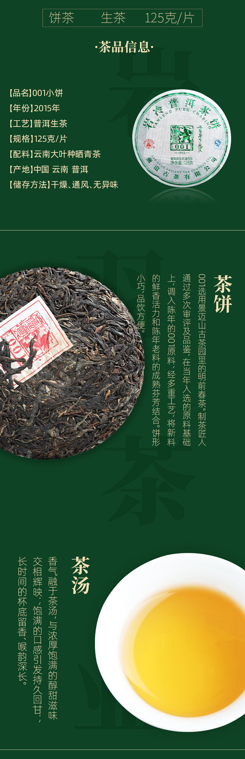 澜沧古茶2015年001小饼生茶景迈山古树纯料春茶干仓高香125g
