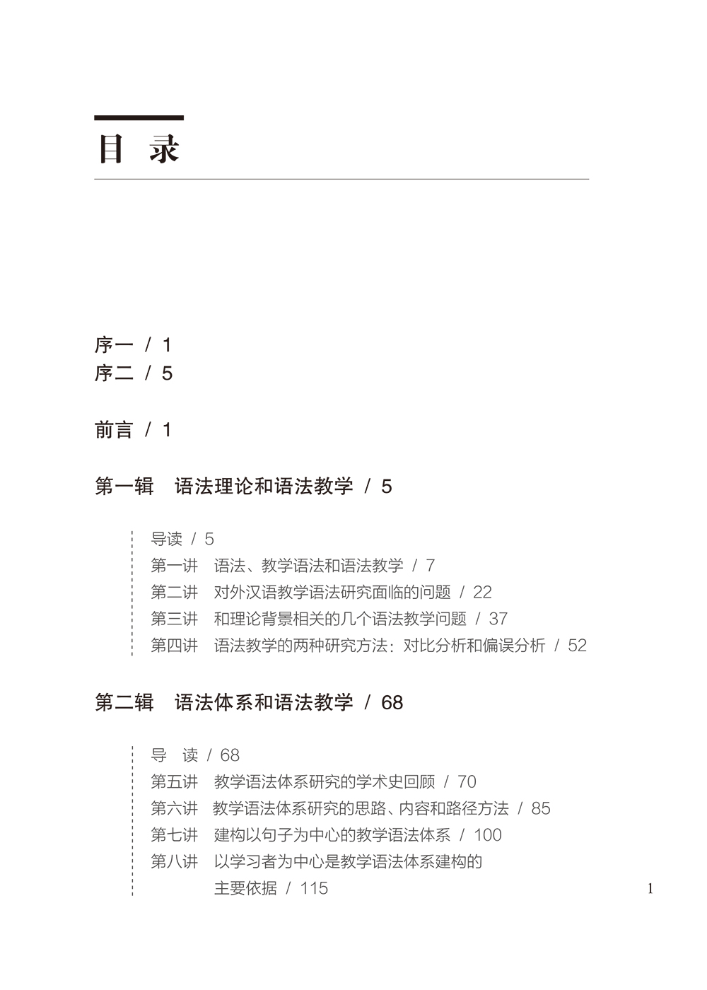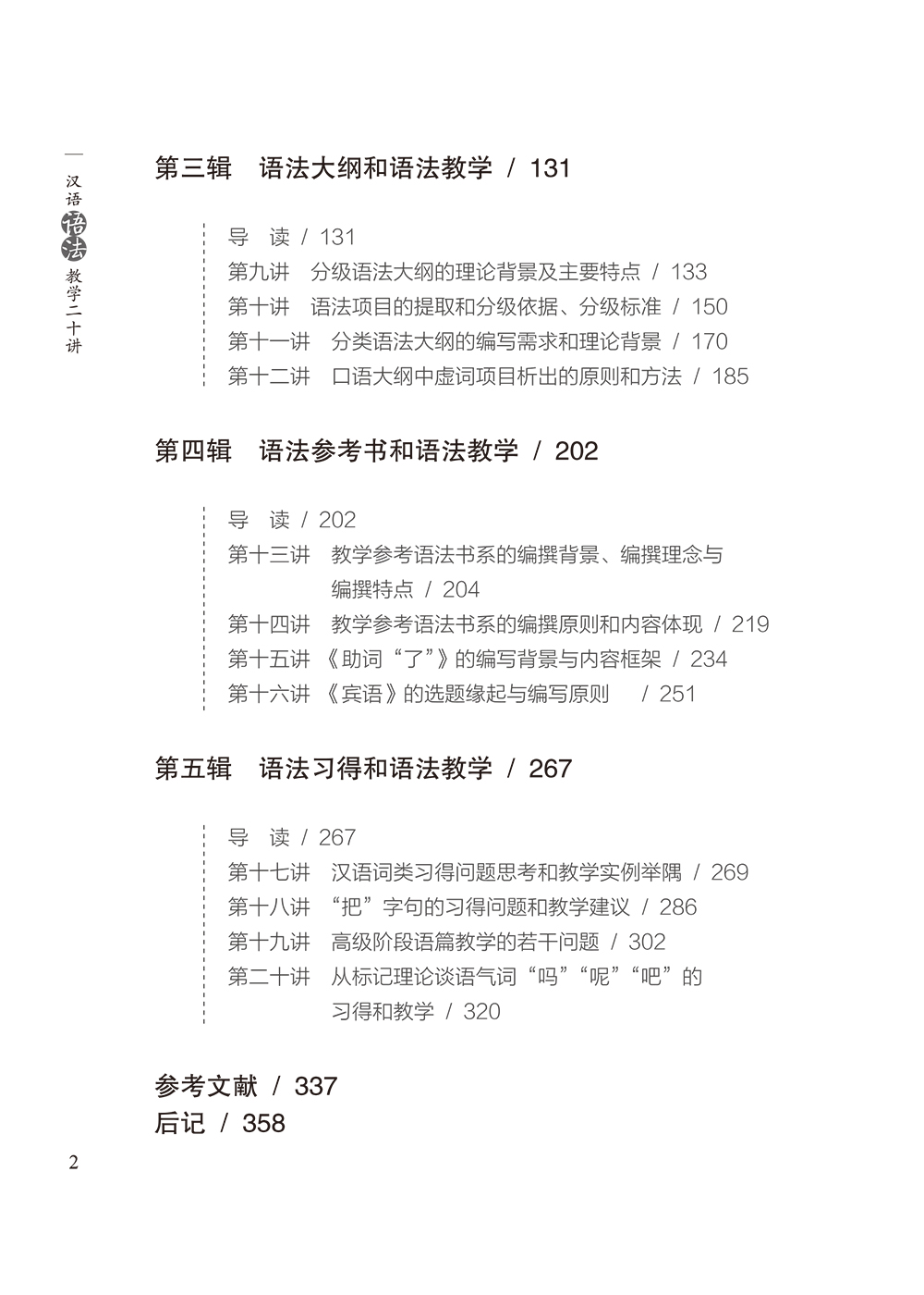 《汉语语法教学二十讲》全书共 20 讲,分为 5辑,每辑4讲。5辑的内容虽然各自独立,事实上还是有内在的联系的:语法理论是研究的指导思想,建构新的教学语法体系是研究的最终目标,语法大纲是语法体系的直接体现,语法参考书是对语法大纲中某些语法项目的详细分析和解释,服务目标人群的研究宗旨体现在学习者语法习得效果的提高上。