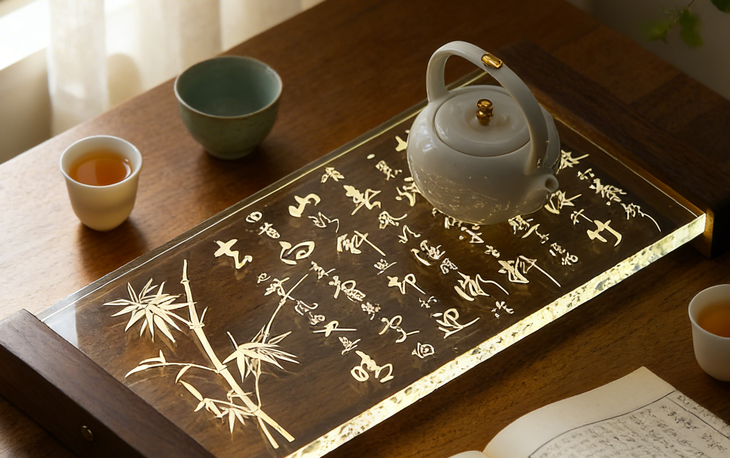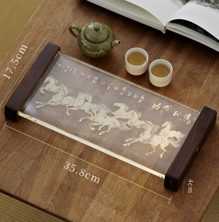 更妙的是,茶盘以光为笔,在水晶腹地雕入骏马或雅竹诗句,暗藏新年祝福——