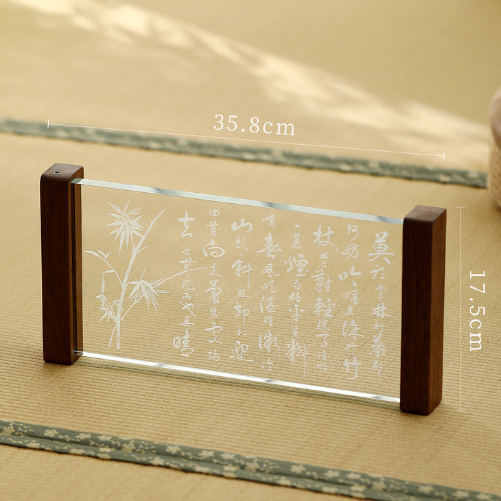 产品属性 品名:新中式两用屏风发光茶盘 款式:马到成功、竹报平安 材质:水晶玻璃、胡桃木 尺寸:35.8*17.5*4cm