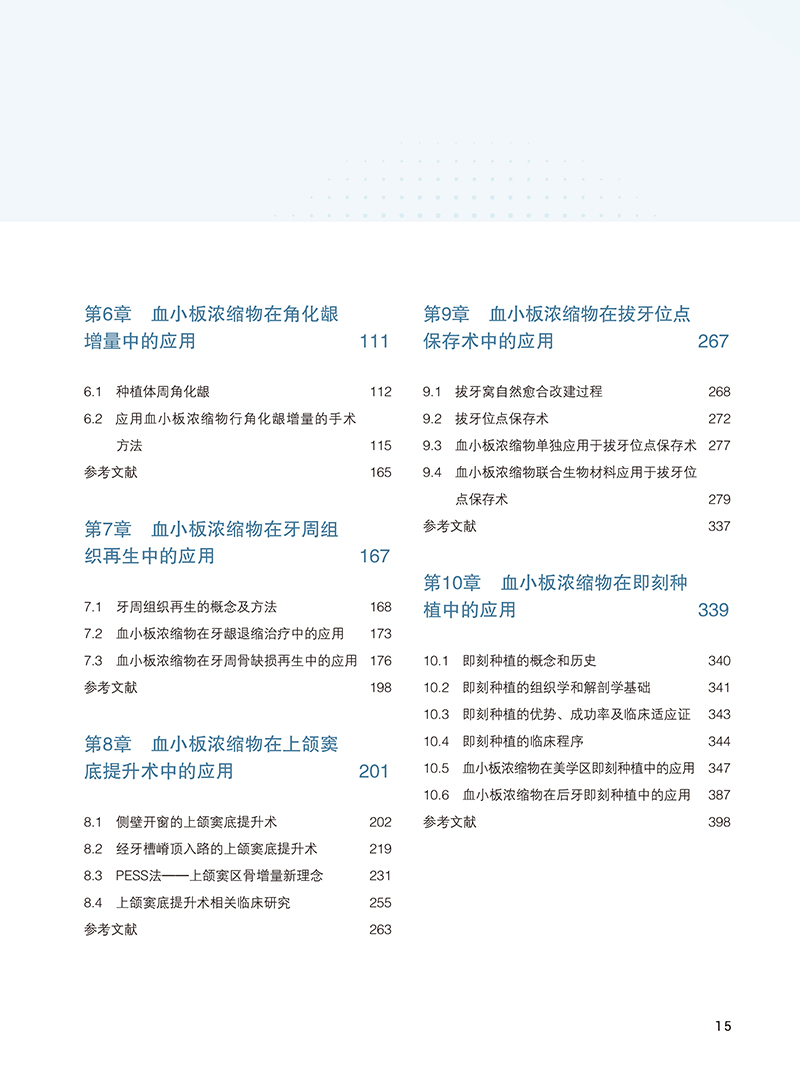 本书详细地介绍和探讨了血小板浓缩物(包括PRF、PRP、CGF等)在口腔医学领域的应用,从基础研究到临床实践的各个方面。全书共分12章,系统地讲述了血小板浓缩物的发展历程、微观结构特征,以及它们在促进软硬组织再生方面所发挥的关键作用。书中通过大量的临床案例和循证医学的证据,深入分析了血小板浓缩物在角化龈增量、牙周组织再生、上颌窦底提升等核心临床应用中的具体操作方法和疗效评估。本书由吉林大学口腔医院专家团队基于十余年科研与临床经验编写,为读者提供了详尽的操作指南和治疗策略。这些内容不仅有助于医生们高效地处理各种复杂的病例,还展示了血小板浓缩物技术在口腔再生医学领域的巨大潜力和应用前景。因此,本书成为了口腔临床医生在实践中不可或缺的实用参考书,为口腔再生医学的发展开辟了新的视角。