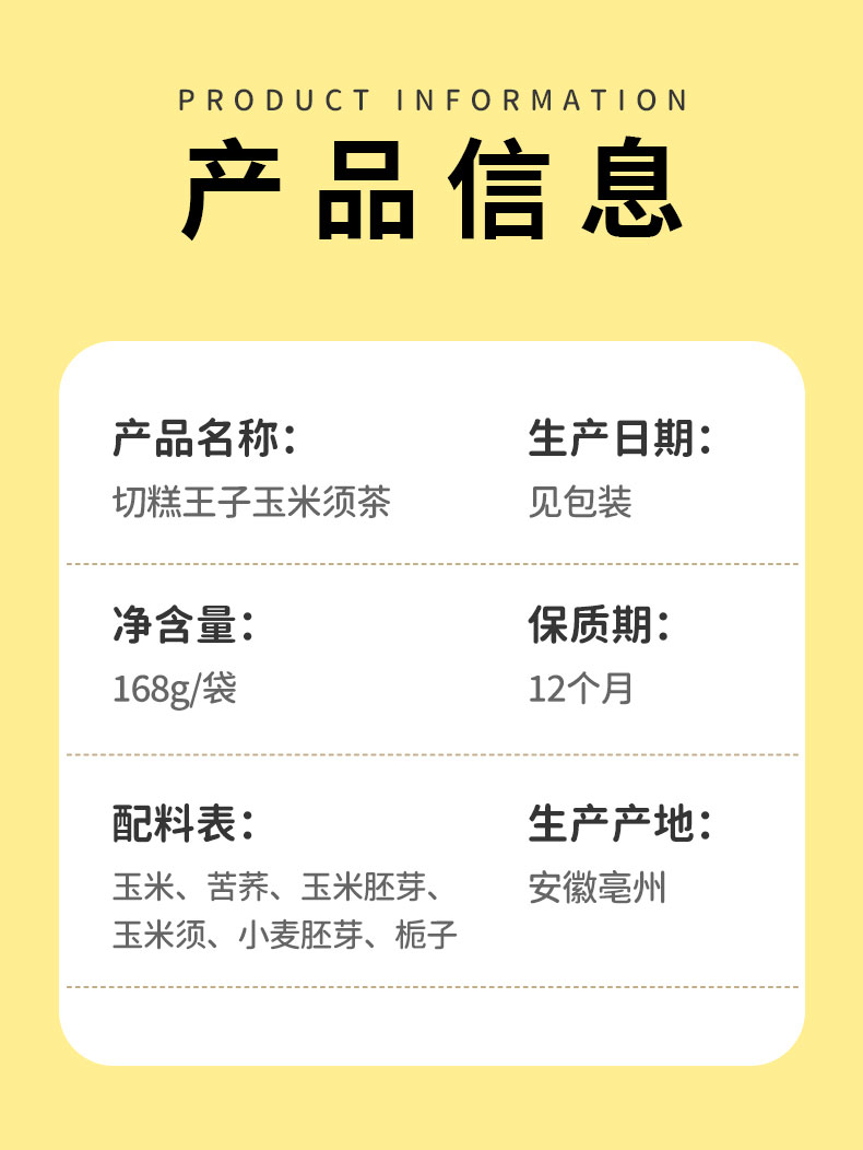 【配料】玉米、苦荞、玉米胚芽、玉米须、小麦胚芽、栀子