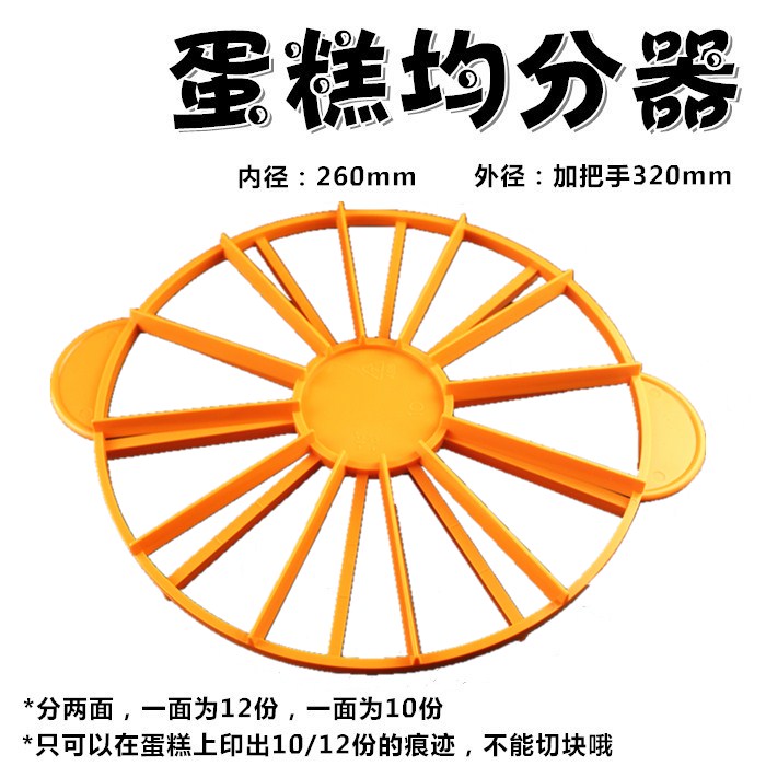 【说明】:还在为如何将蛋糕分成平均大小的蛋糕而发愁吗?快将它带回家吧,它会给你带来惊喜的。此款模只能印出10片或12片的形,具体还是要用刀来切,不能用于直接切蛋糕用。