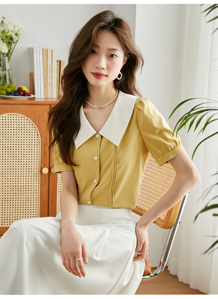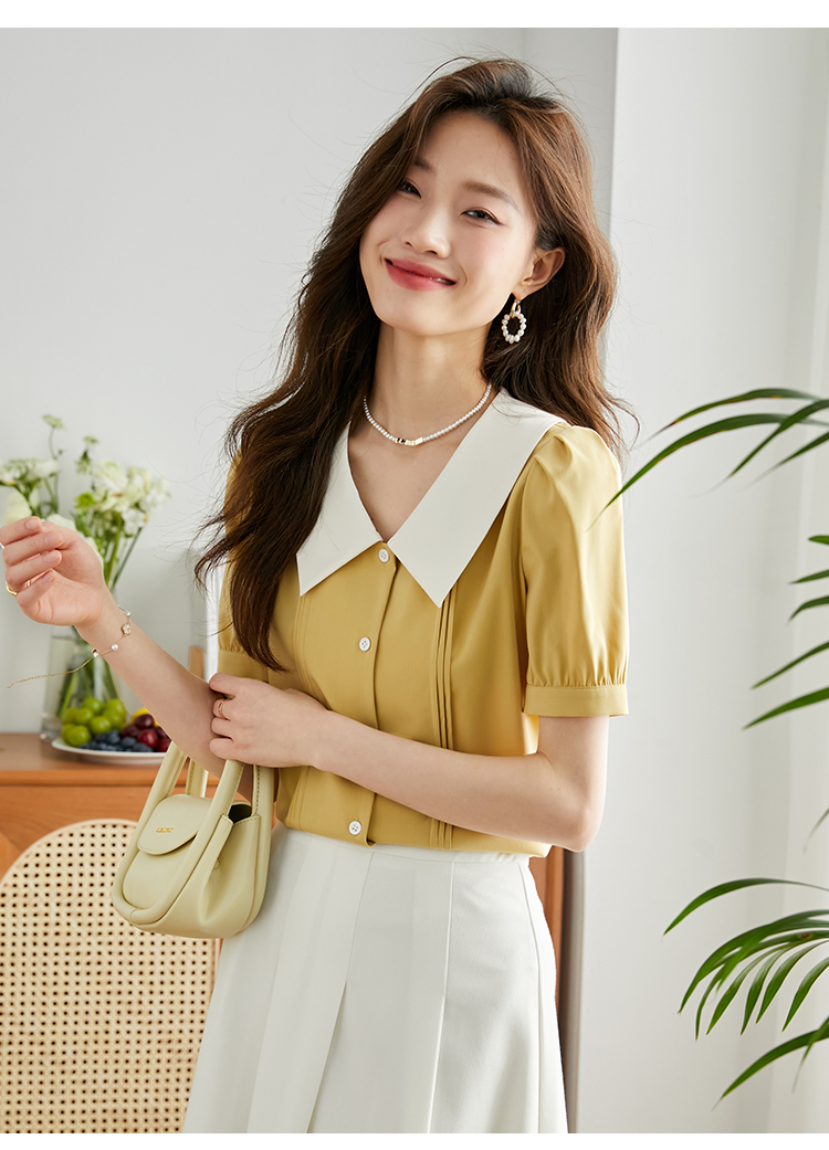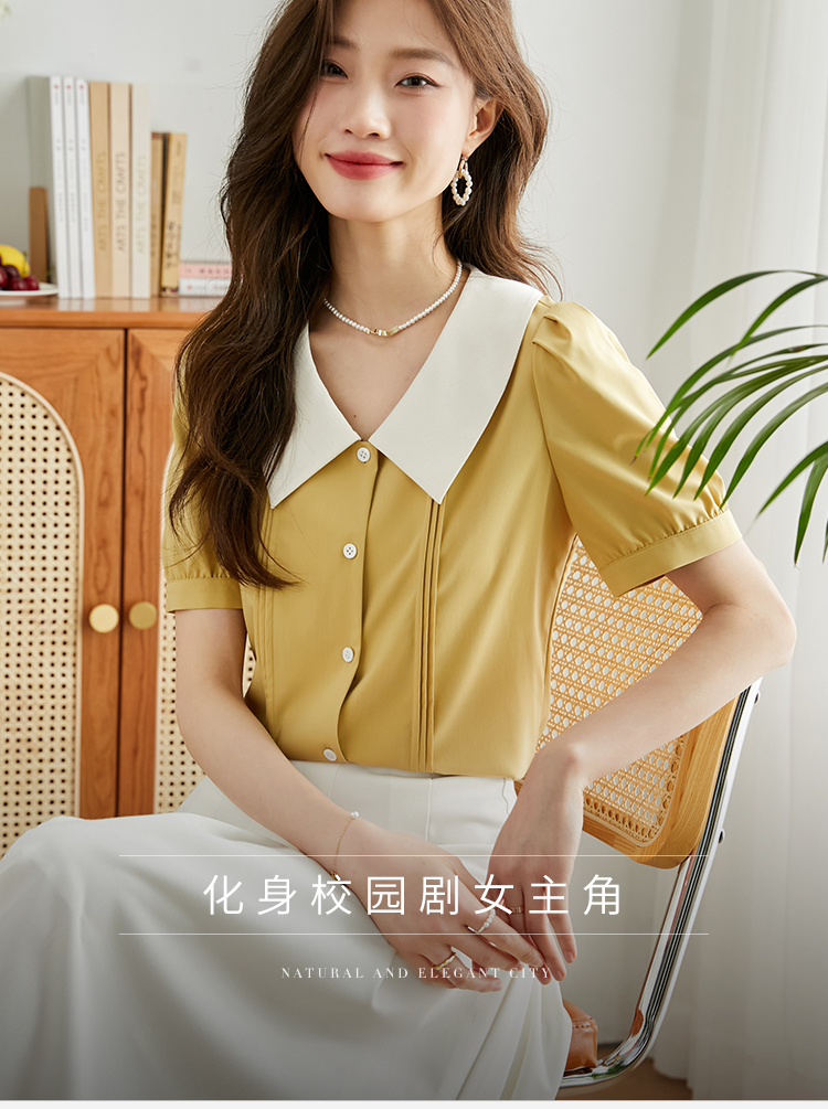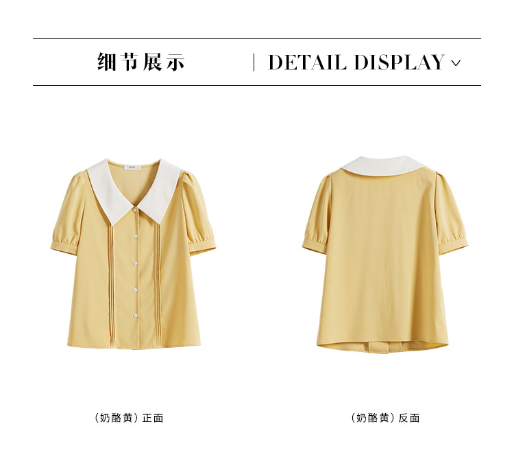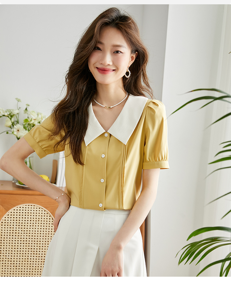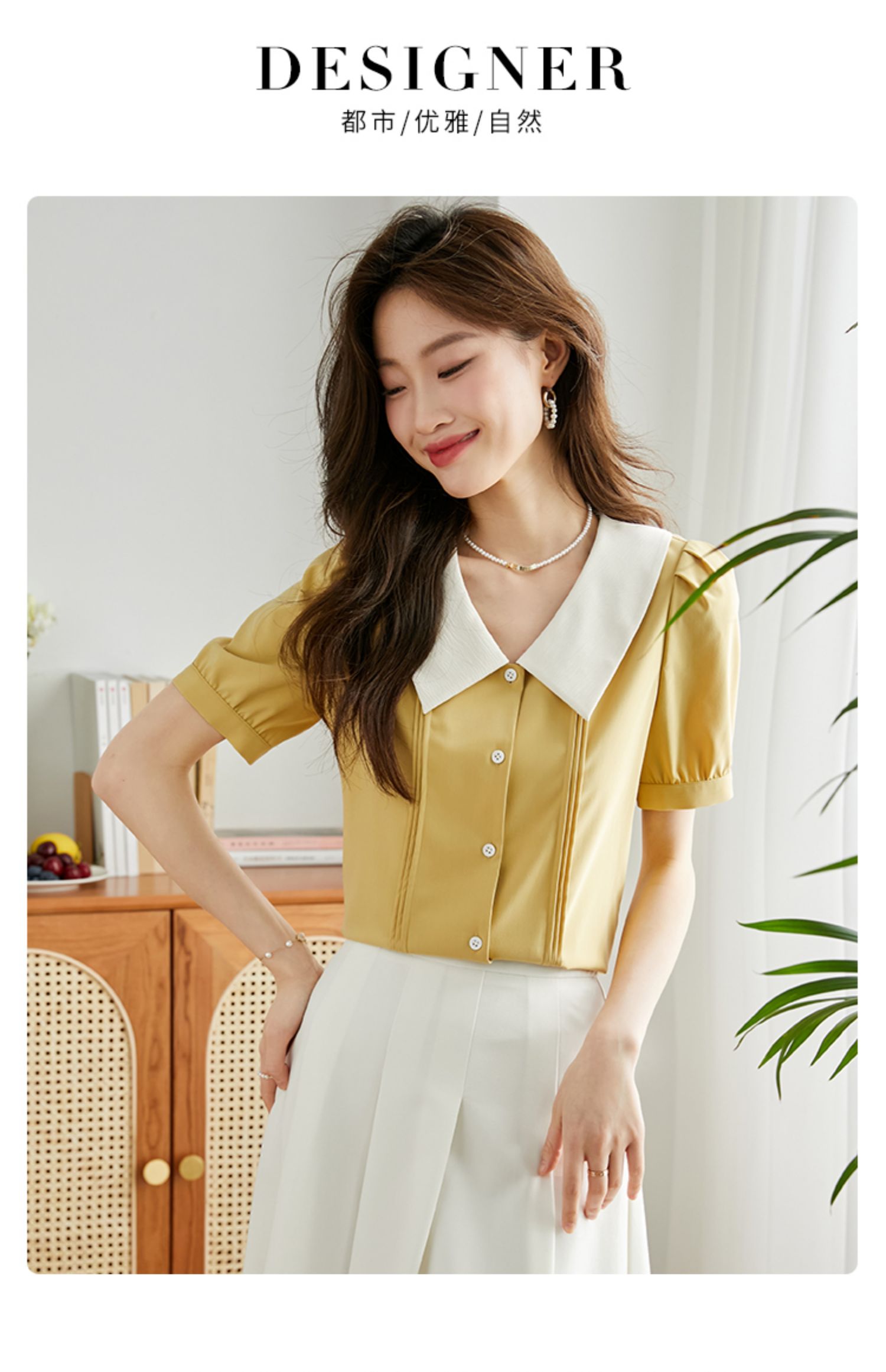 【专属特价】熙世界法式撞色娃娃领衬衫女夏季2025年新款文艺风别致泡泡袖上衣