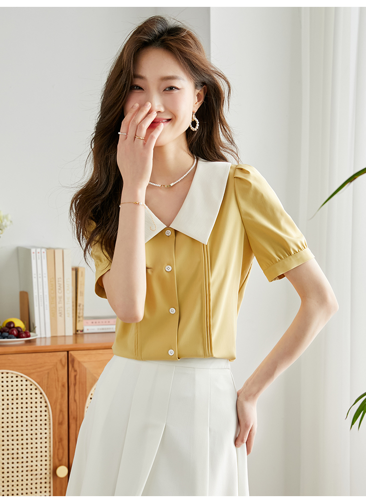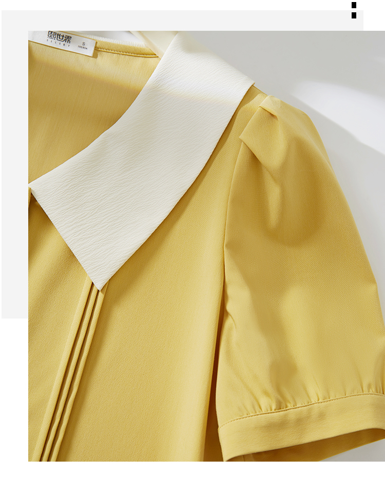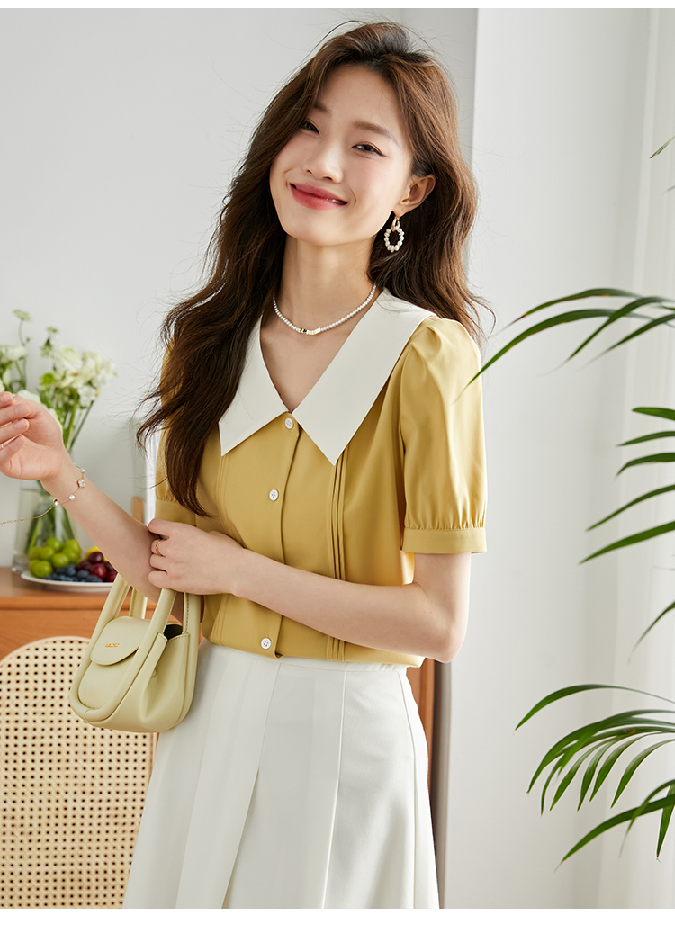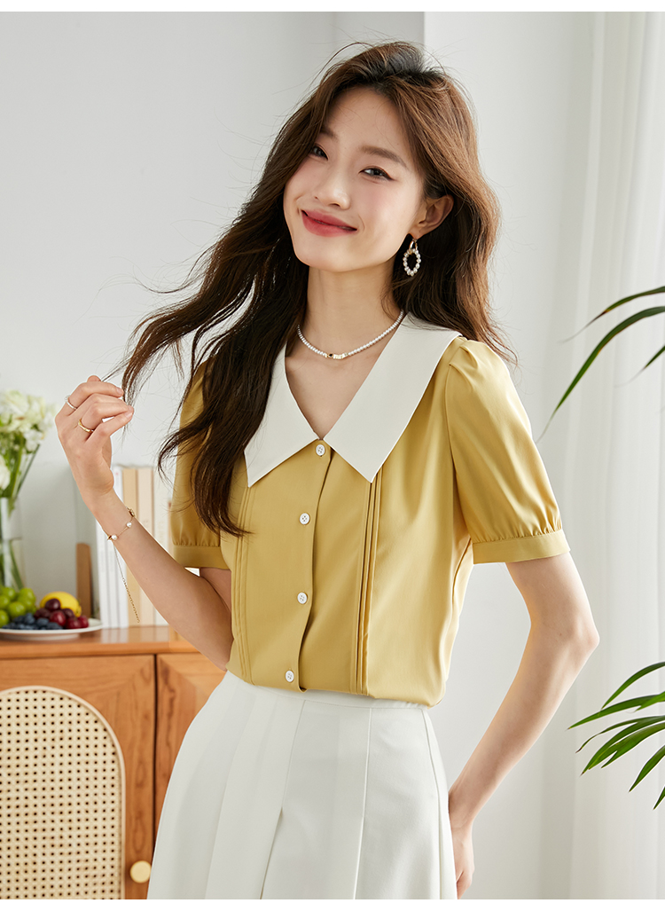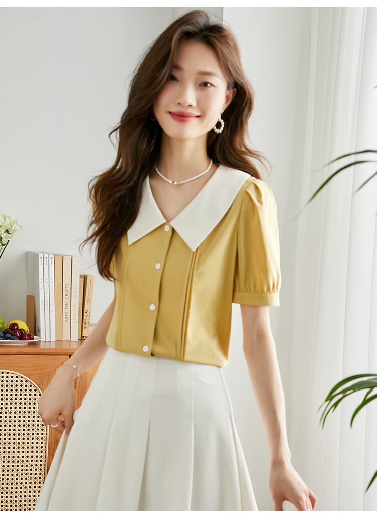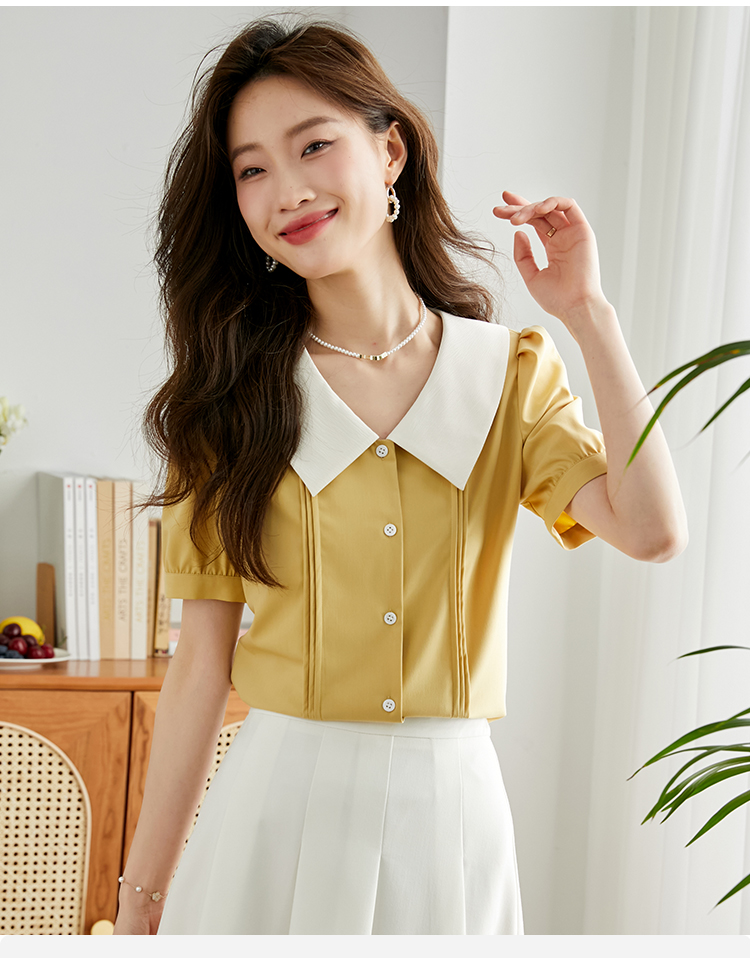 【专属特价】熙世界法式撞色娃娃领衬衫女夏季2025年新款文艺风别致泡泡袖上衣