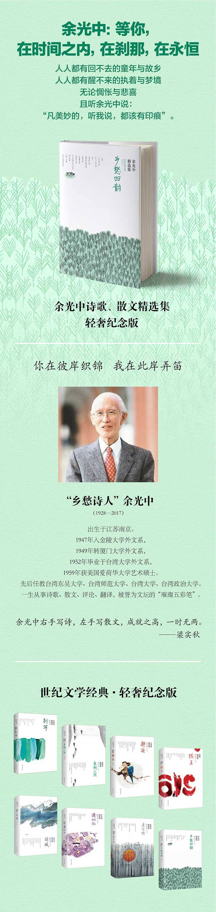 余光中先生是闻名华文文学界的诗人与散文大家。本书是他诗歌和散文代表作的精选集,余光中先生2015年*新修订。
