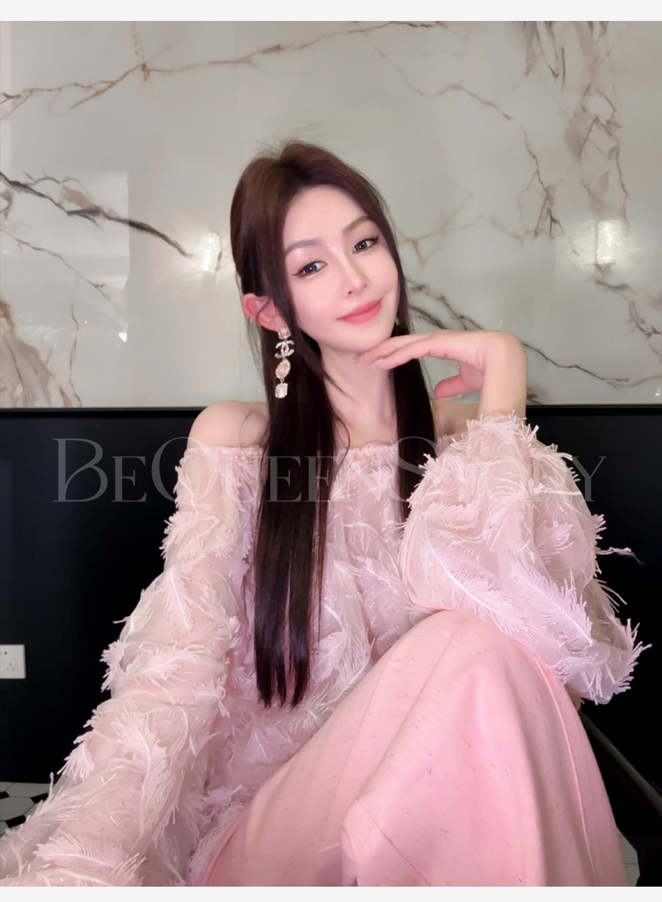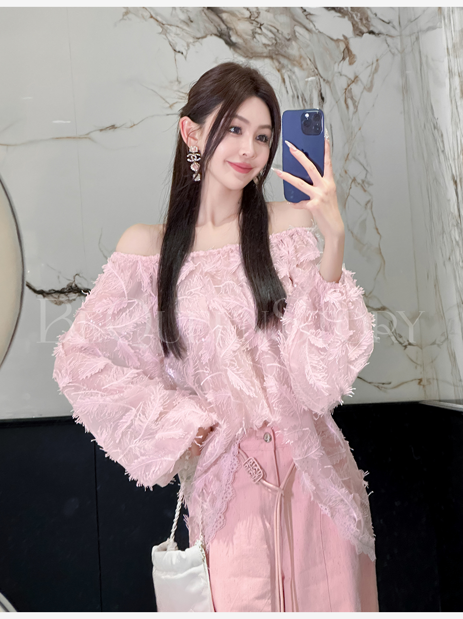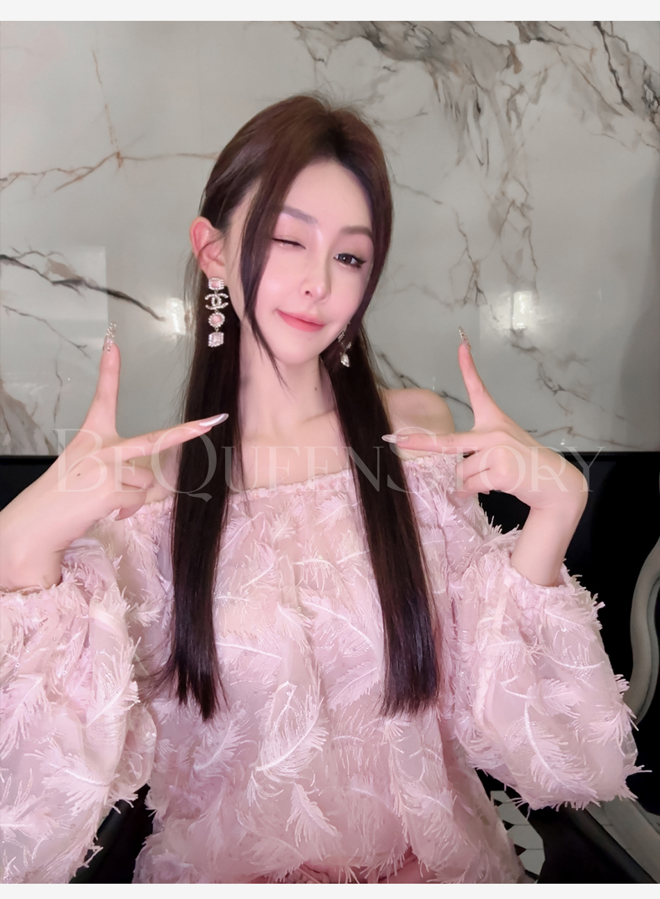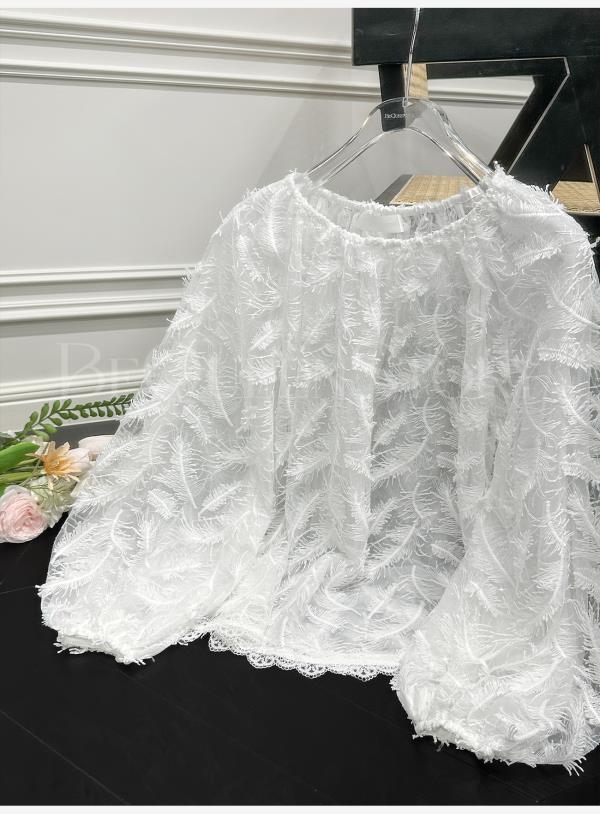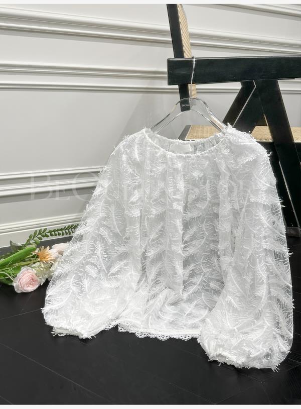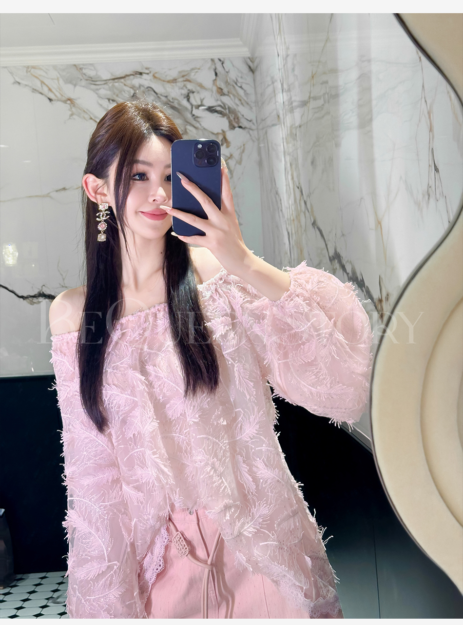 BeQueenStory【幻境羽翼】羽毛丝绣亮片圆领灯笼袖衬衫2025春装新款