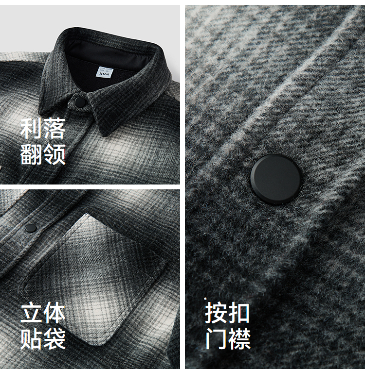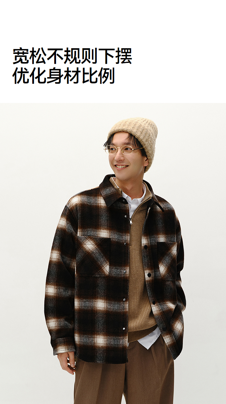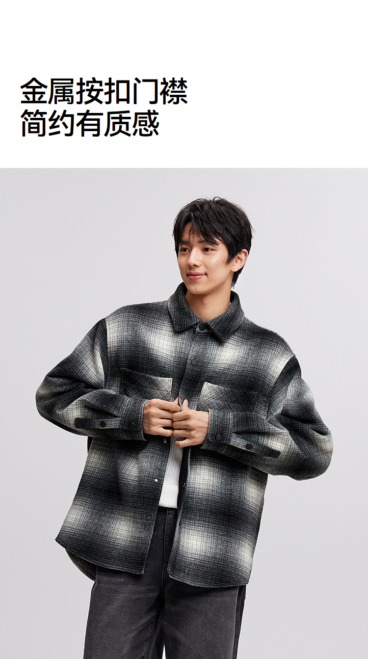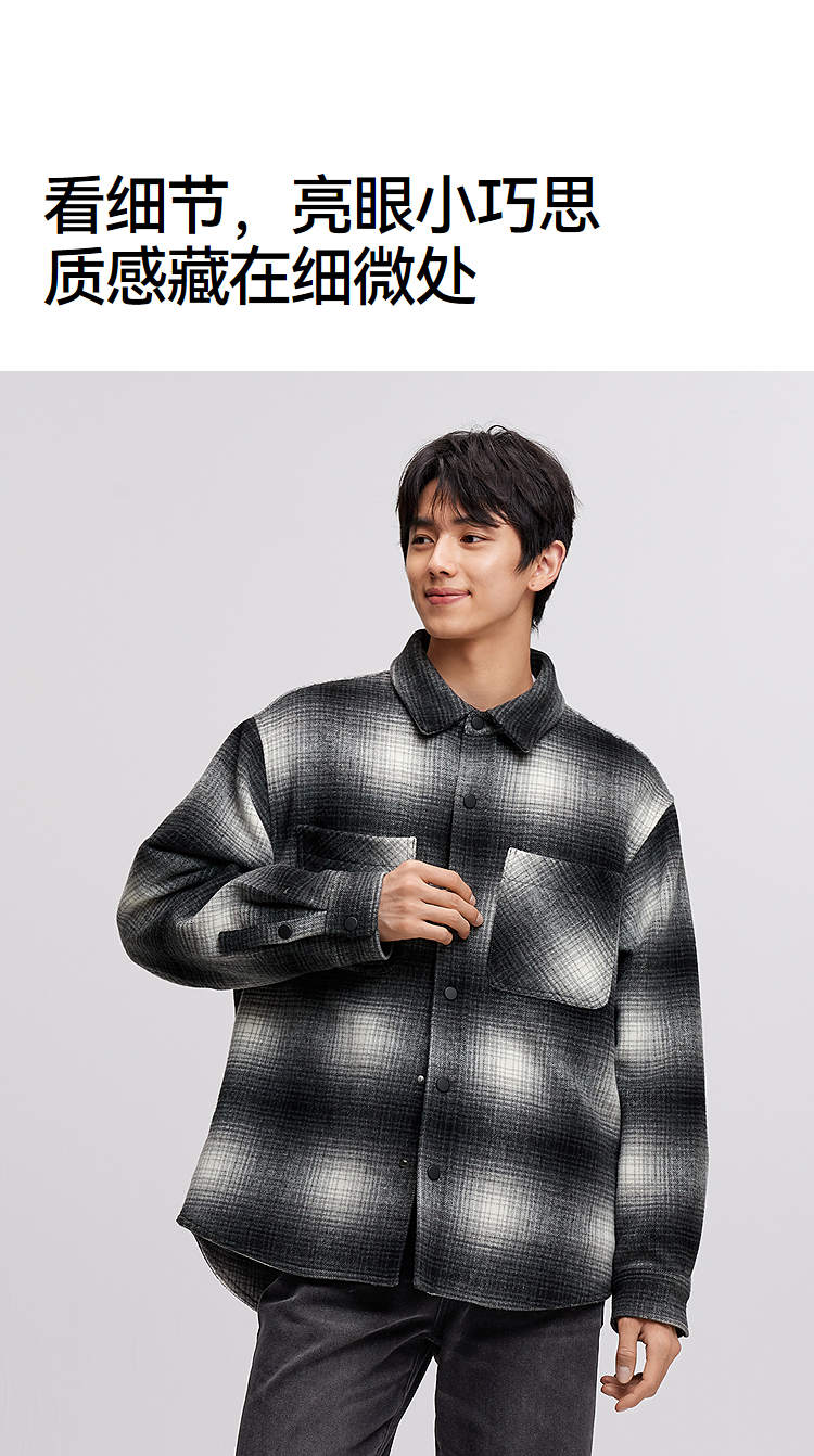 森马毛呢外套男冬季加绒格纹夹克经典复古百搭小宽松廓形翻领上衣
