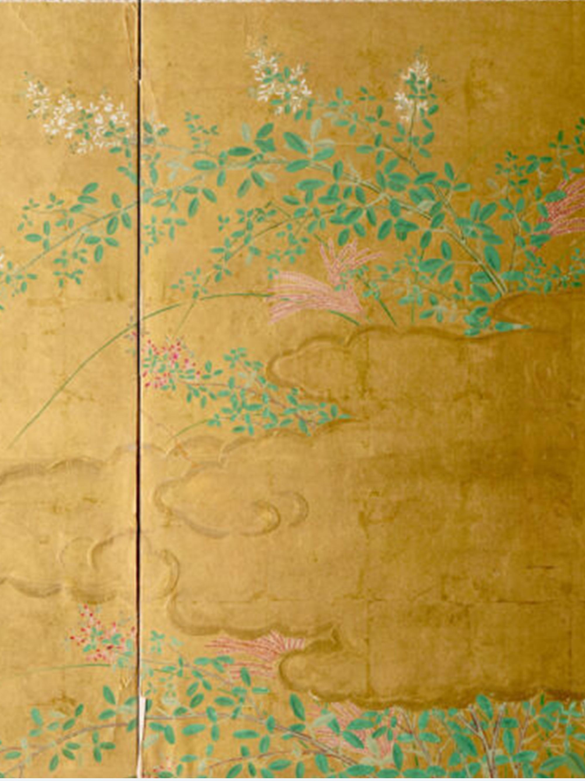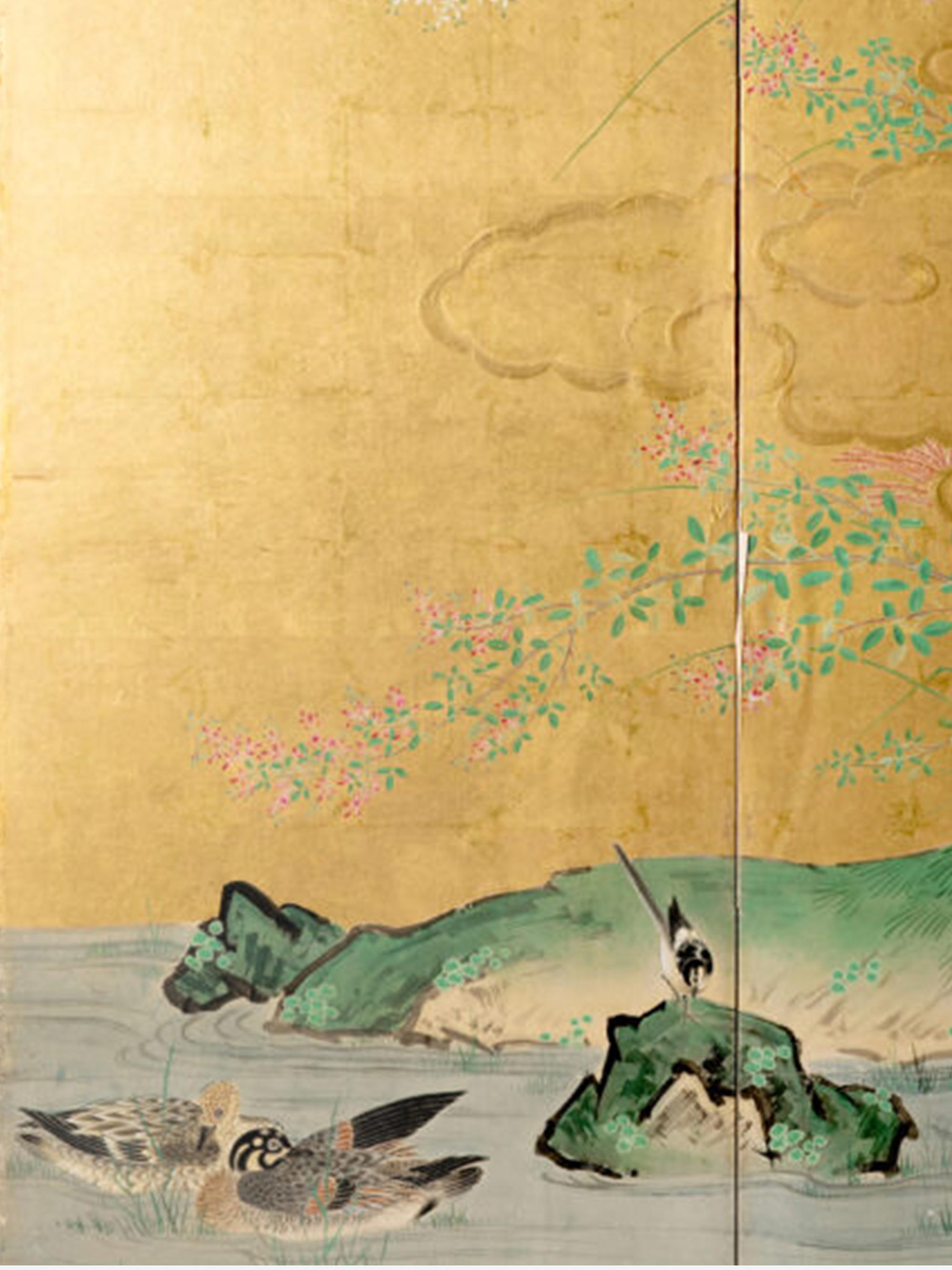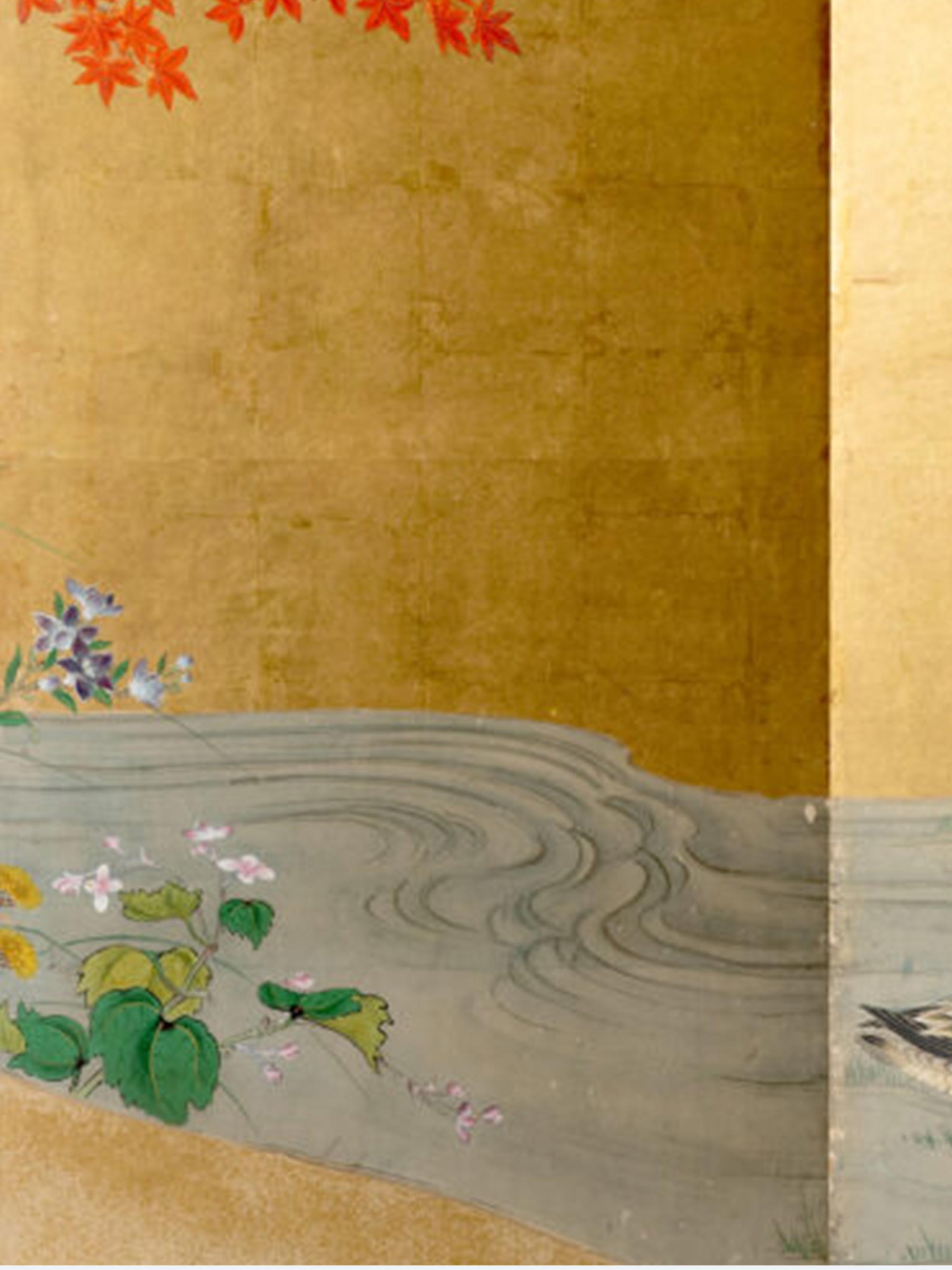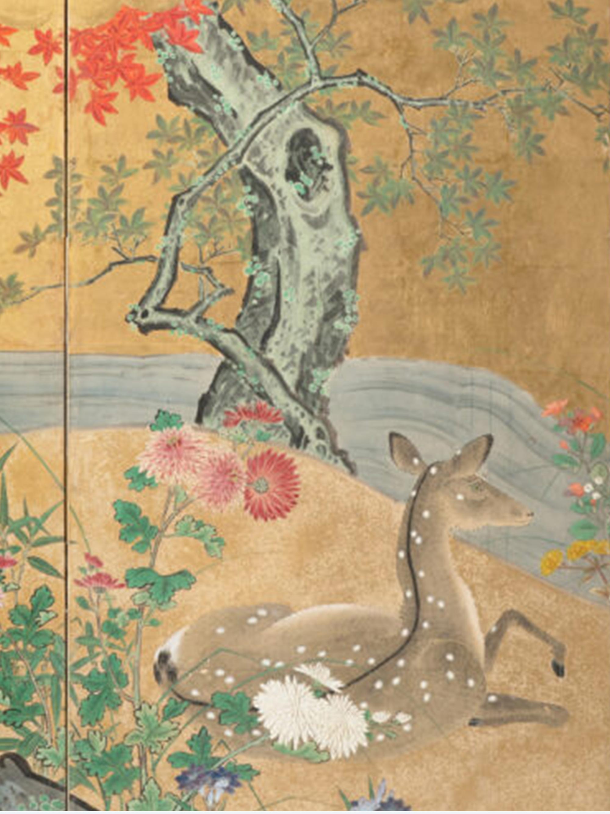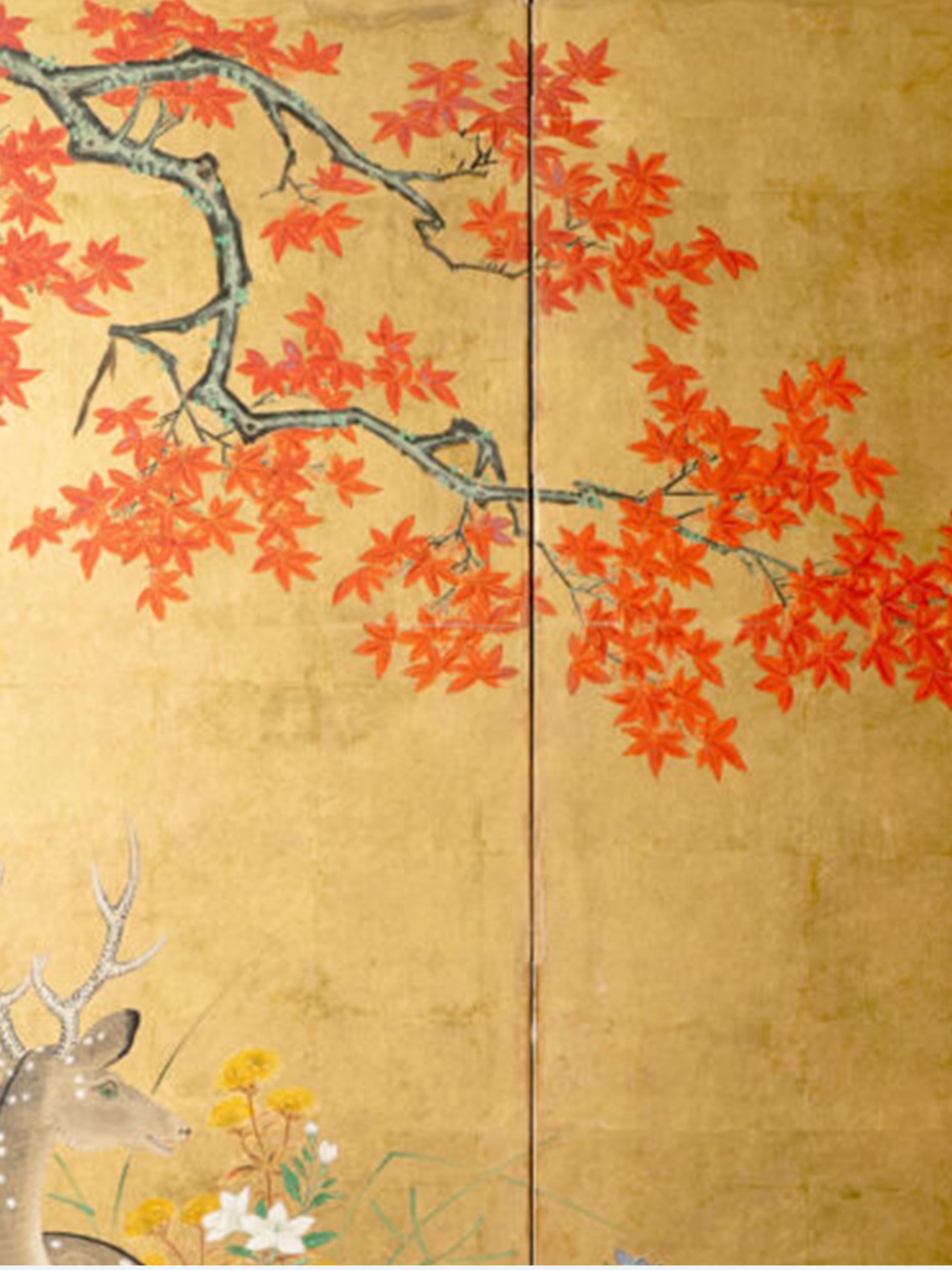 18世纪日本江户时代出品土佐画派风格「枫林鹿群」主题纸本设色金地六曲屏风