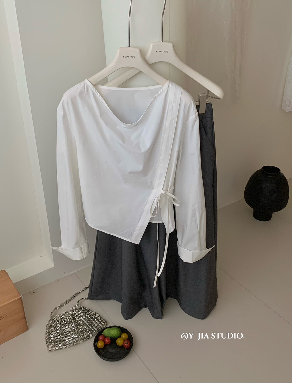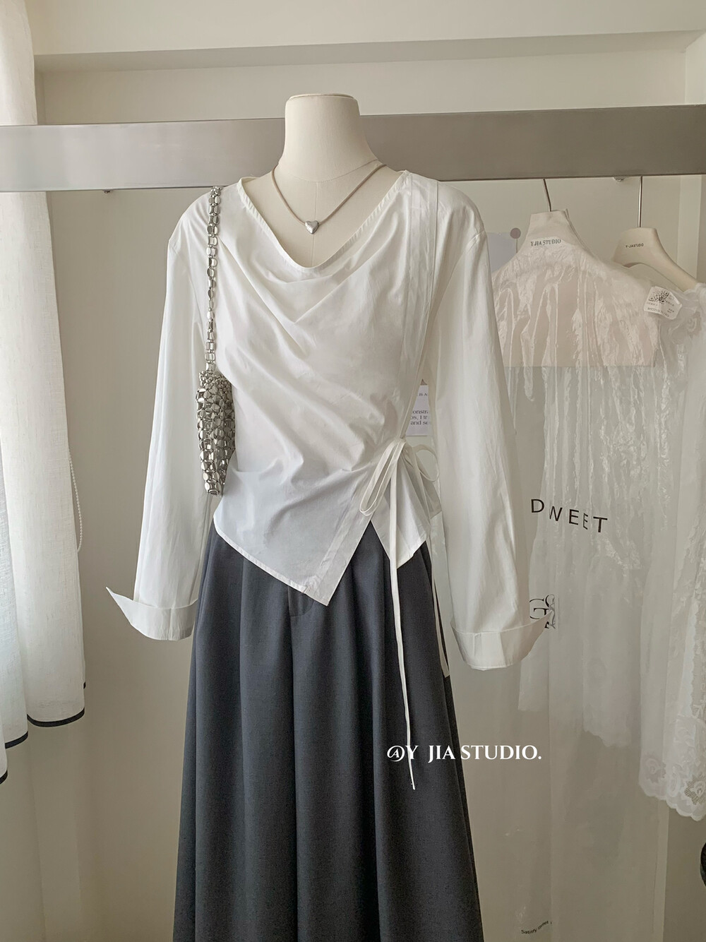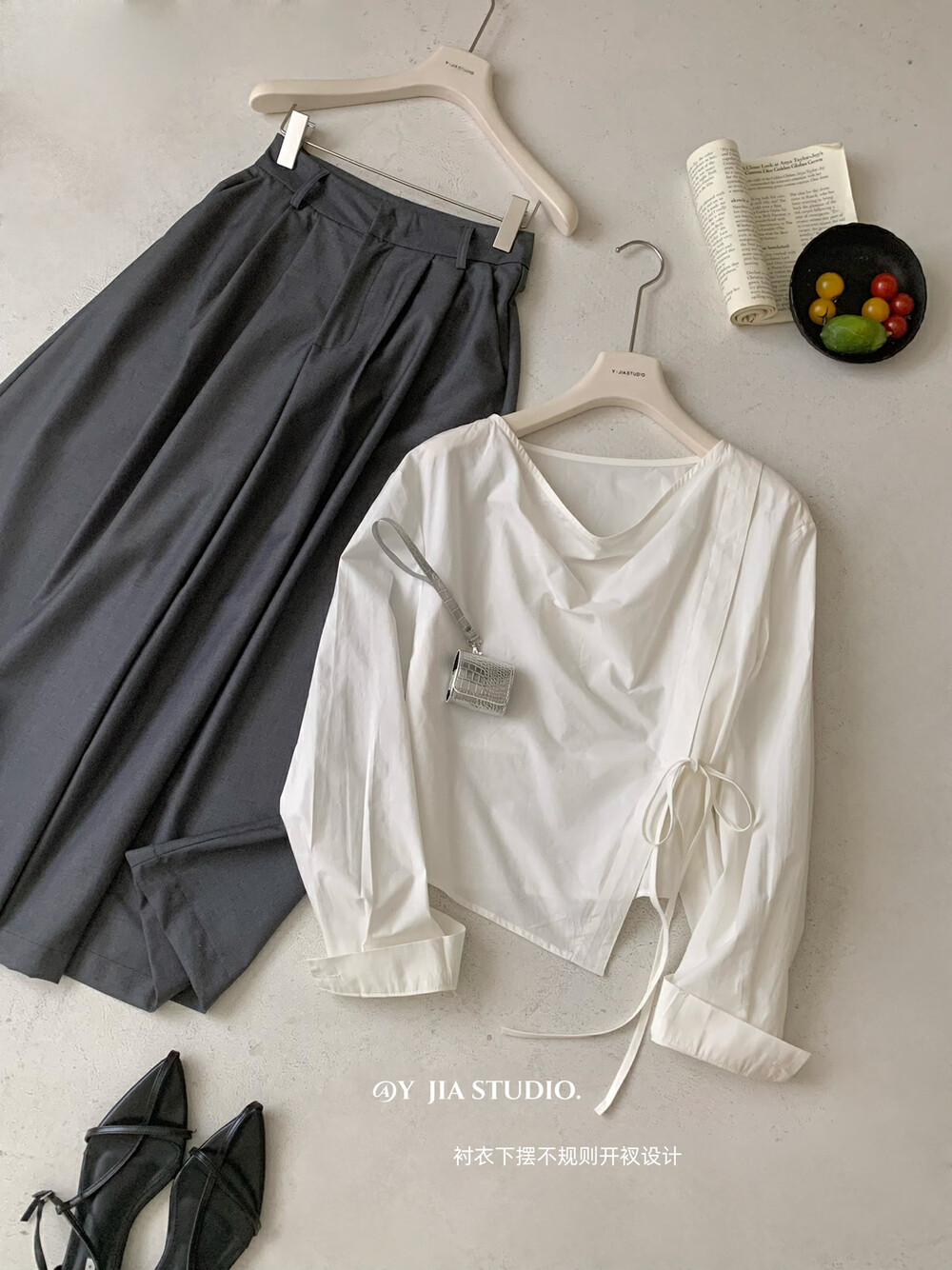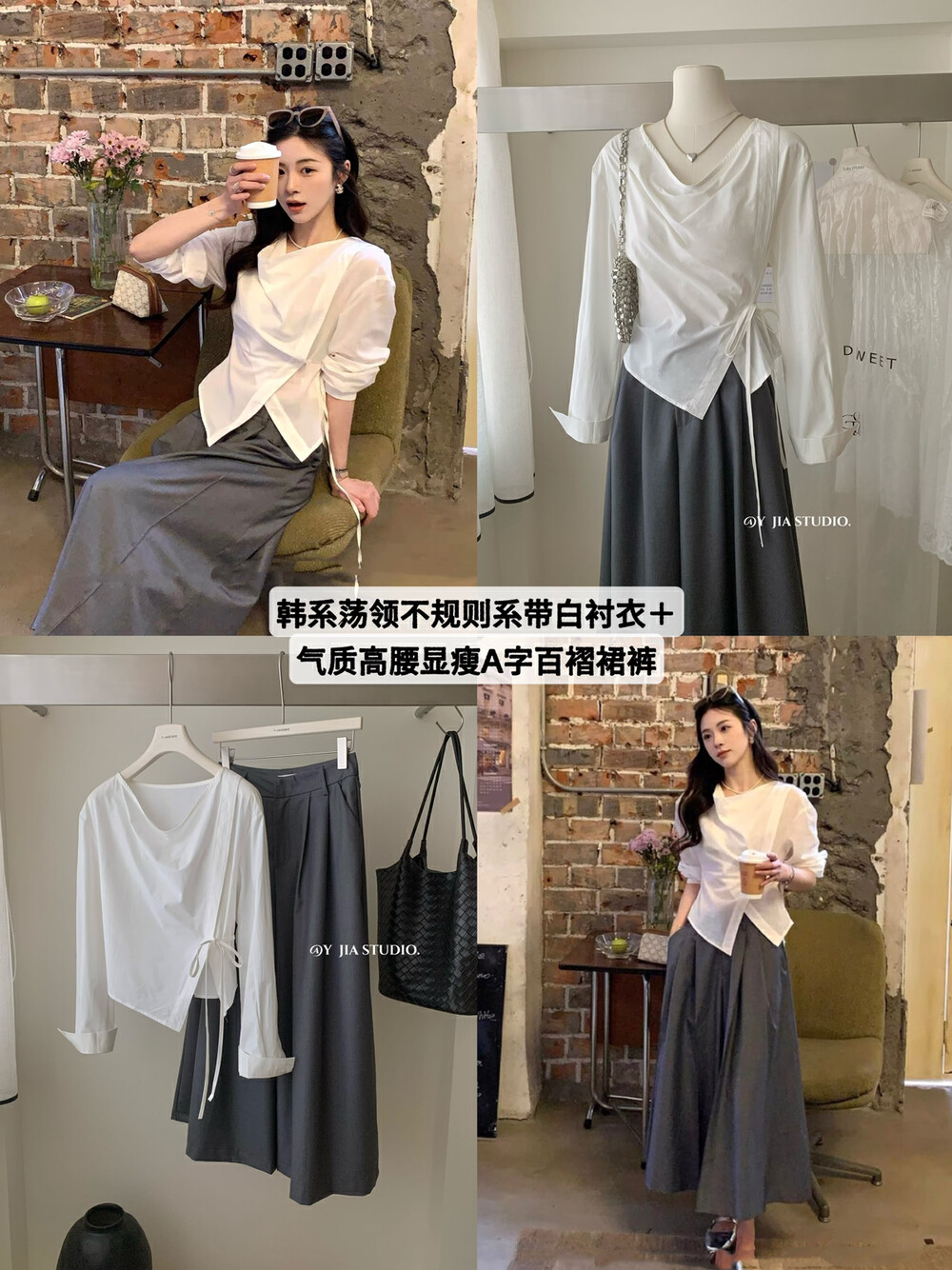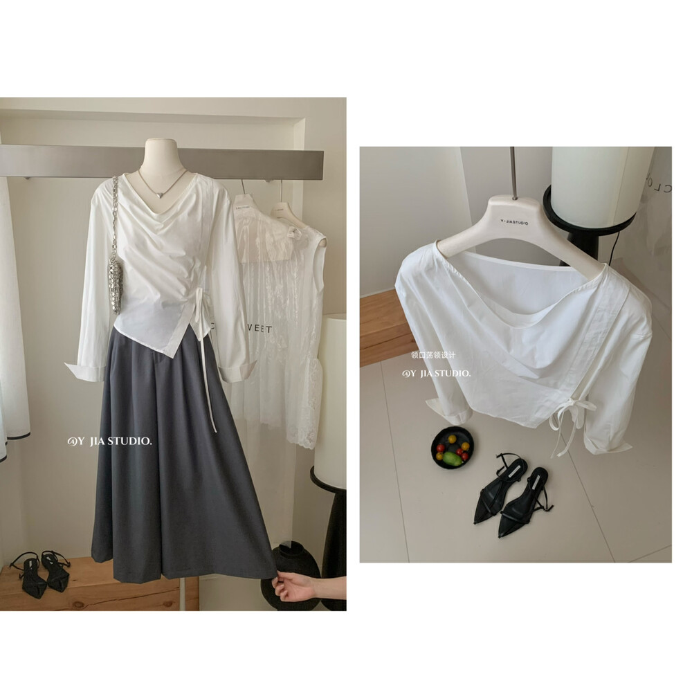【GZ】无忧购韩系荡领不规则系带白衬衣+气质高腰显瘦A字百褶裙裤套装8925-5(截单后7天发货)