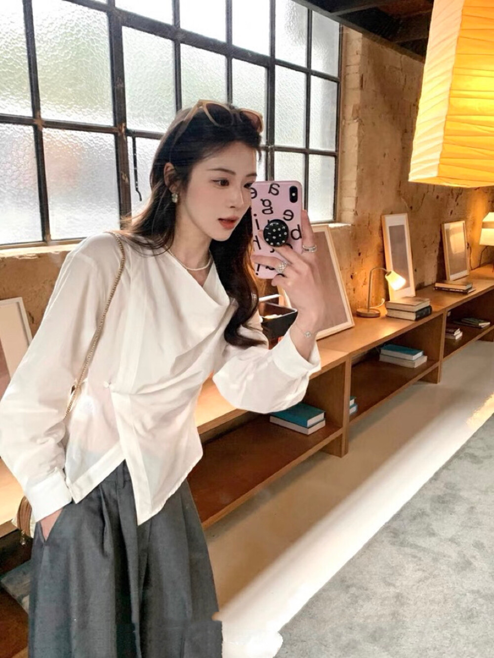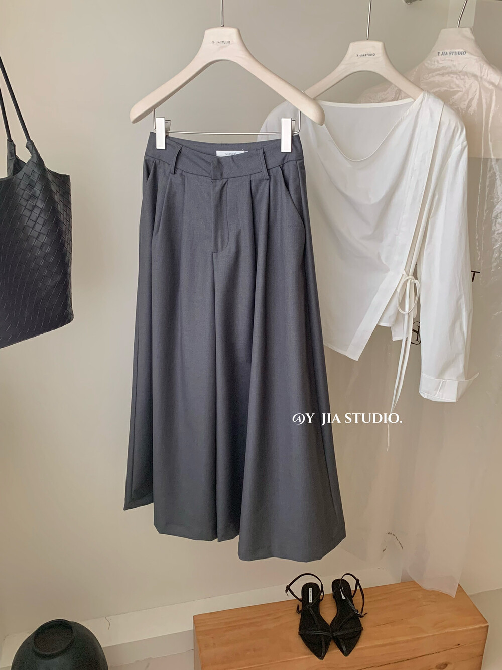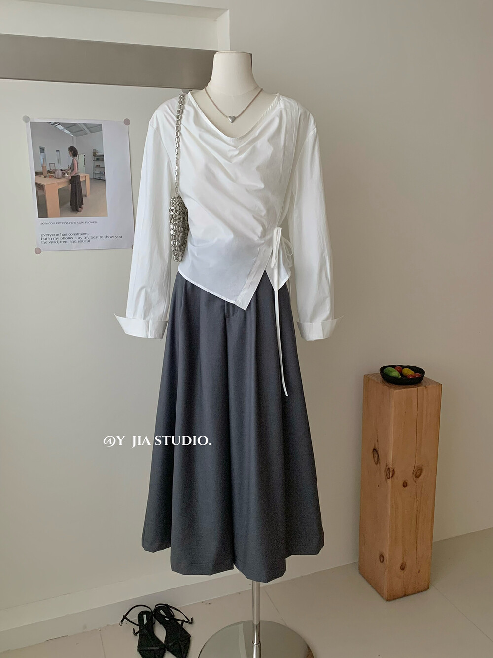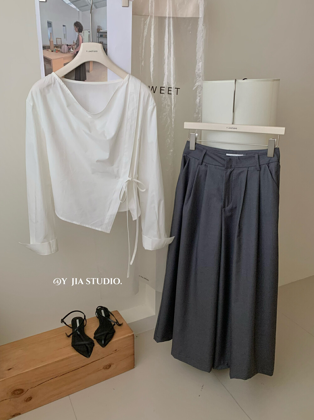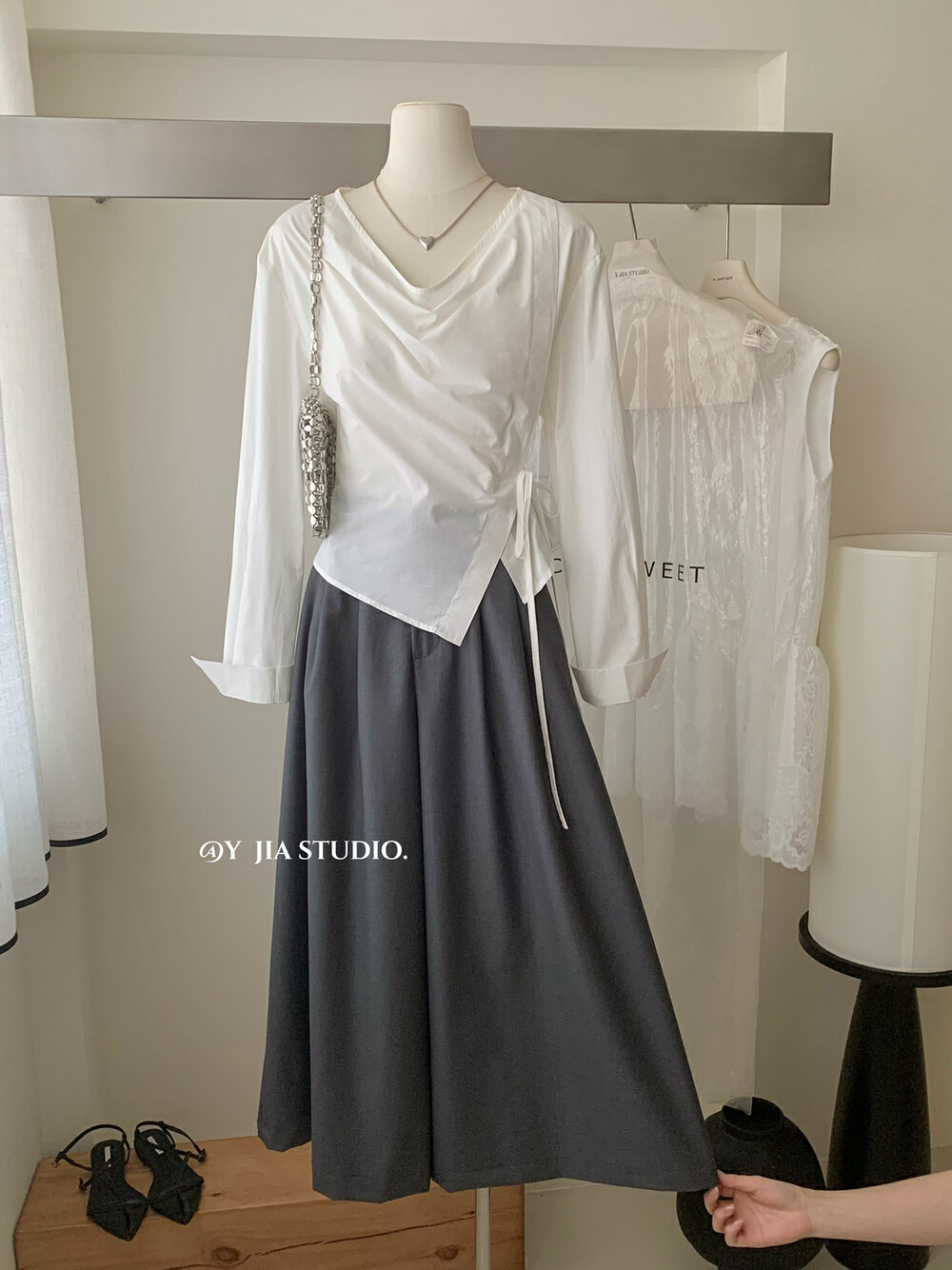 【GZ】无忧购韩系荡领不规则系带白衬衣+气质高腰显瘦A字百褶裙裤套装8925-5(截单后7天发货)