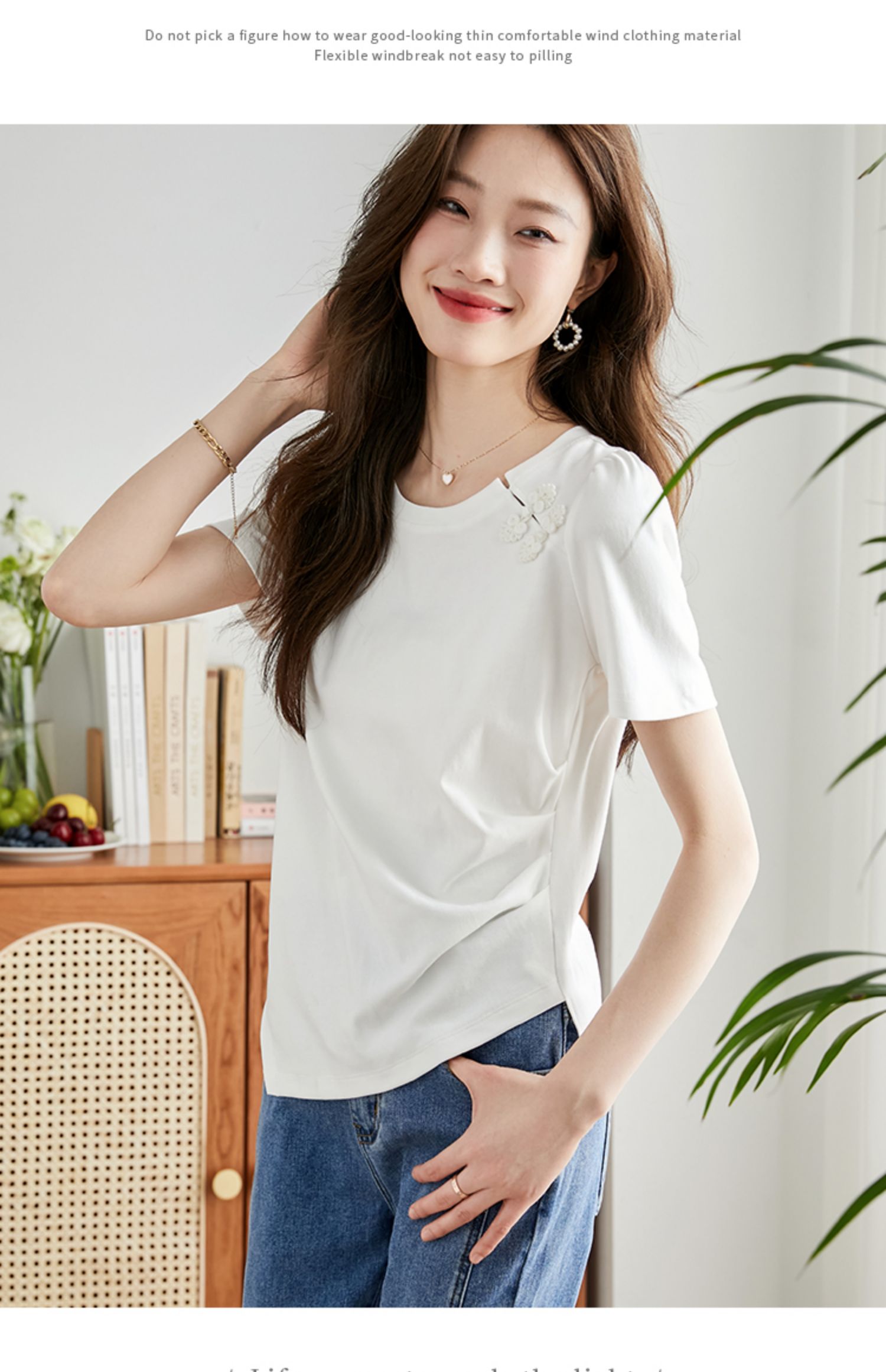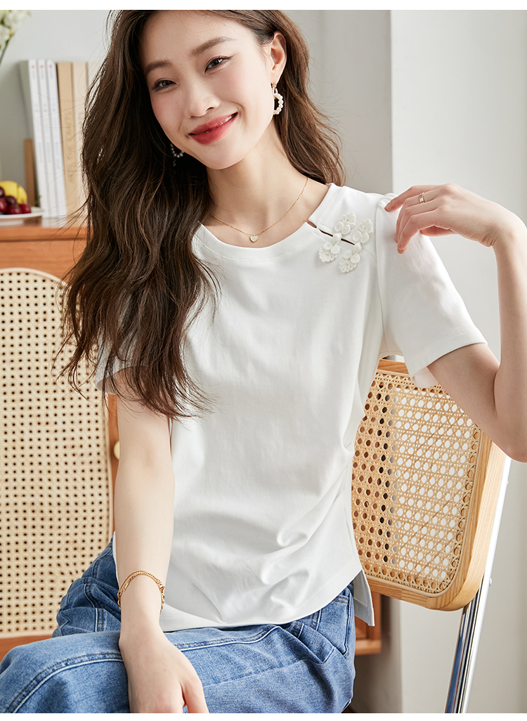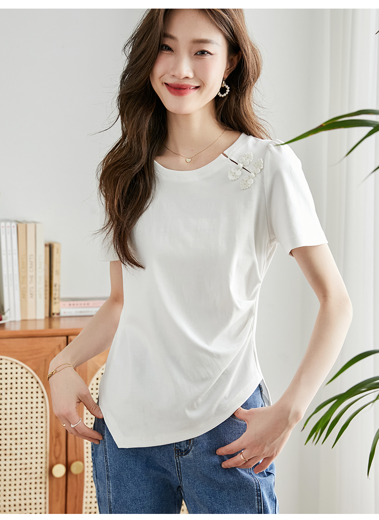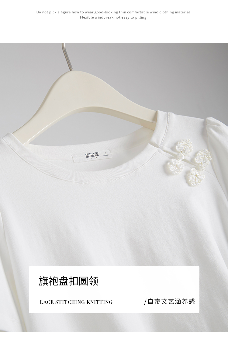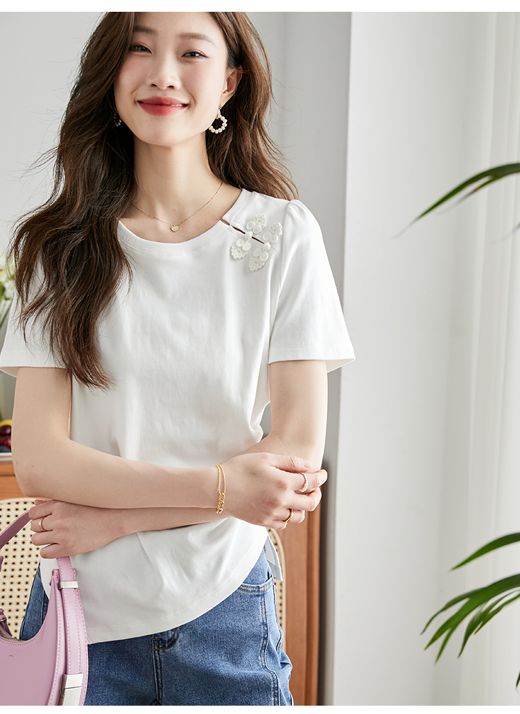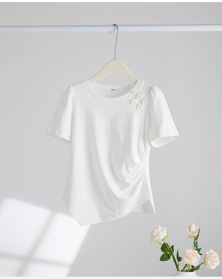 【专属特价】熙世界新国风盘扣设计白色T恤女短袖收腰显瘦圆领上衣2025夏新款