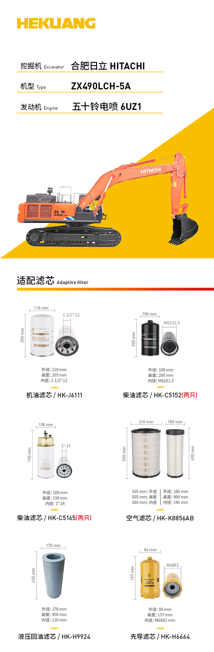 日立ZX490LCH-5A(五十铃电喷6UZ1)挖掘机滤芯 机油柴油空气滤芯 液压油先导滤芯