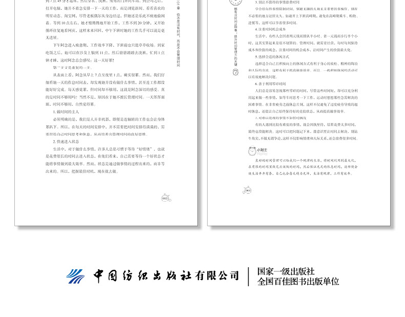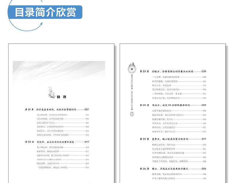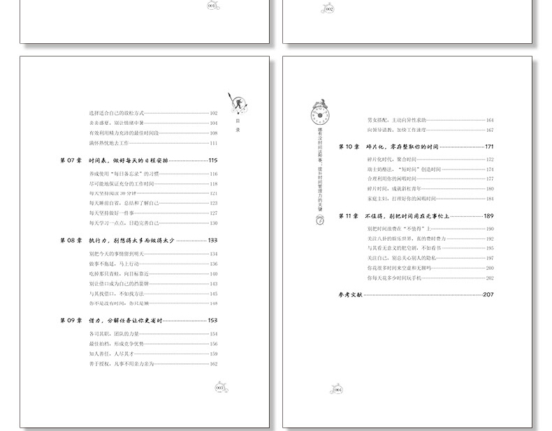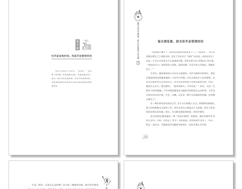 第01 章 你不是没有时间,而是不会管理时间 001每天感觉累,因为你不会管理时间 002过分的情绪,会令你疲惫不堪 005你每天都在忙些什么 007思前想后,让你浪费很多时间 0适时停止,人生才会加速前进 013思维方式很重要,不然再忙也是瞎忙 016第02 章 高效率,真正决定的是做事的速度 019奥卡姆定律,简约的做事风格 020蚁群效应,简化做事流程 022收拾好办公桌,建立良好的工作秩序 025高效率是以正确的方式做事 028精益求精,力求尽善尽美 030一次把事情做好,避免返工和重复 034哪有没时间这种事:提升时间管理力的关键第03 章 分配力,合理安排让时间化利用 039二八定律,先解决重要的事 040时间四象限,分清轻重缓急 042棘手之事,暂缓处理 045莫法特休息法,连续分段时间 048三分钟热情,只会让你一事无成 051有效行动计划,长短期相结合 054第04 章 专注力,设定25 分钟的番茄时间 059安排不被打扰的时间 060做好分内事,别让分外事干扰自己 063做感兴趣的事,更专注 066领导讲话,会听更要会记录 069番茄时间,注重劳逸结合 071从细节入手,提升专注力 074第05 章 竞争力,核心就是你努力的方向 077记录你的一周时间表 078列出你未完成的梦想清单 08130 秒电梯法则,简洁而高效的沟通 084选择做自己擅长的事 087平衡好工作时间、家庭时间、闲暇时间 090第06 章 精力,寻找活力与效率的平衡点 095拯救,保证充足的休息时间 096在真正感到疲倦之前休息 098选择适合自己的放松方式 2炎炎盛夏,别让情绪中暑 4有效利用精力充沛的时间段 8满怀热忱地去工作 111第07 章 时间表,做好每天的日程安排 115养成使用“每日备忘录”的习惯 116尽可能地保证充分的工作时间 118每天坚持阅读30 分钟 121每天睡前自省,总结和了解自己 123每天坚持做好一件事 127每天学习一点点,日趋完善自己 130第08 章 执行力,别想得太多而做得太少 133别把今天的事情留到明天 134做事不拖延,马上行动 136吃掉那只青蛙,向目标靠近 140别让借口成为自己的挡箭牌 143与其找借口,不如找方法 145你不是没有时间,你只是懒 148第09 章 借力,分解任务让你更省时 153各其职,团队的力量 154拍档,形成竞争优势 156知人善任,人尽其才 159善于授权,凡事不用亲力亲为 162哪有没时间这种事:提升时间管理力的关键男女搭配,主动向异性求助 164向领导请教,加快工作速度 167第 章 碎片化,零存整取你的时间 171碎片化时代,聚合时间 172瑞士奶酪法,“短时间”创造时间 174合理利用你的闲暇时间 177碎片时间,成就斜杠青年 180家庭主妇,打理好你的闲暇时间 184第11 章 不值得,别把时间用在无事忙上 189别把时间浪费在“不值得”上 190关注八卦的娱乐世界,真的费时费力 192与其看无意义的肥皂剧,不如看书 195关注自己,别总关心别人的隐私 197你花很多时间来空虚和无聊吗 200你每天花多少时间玩手机 202参考文献 207