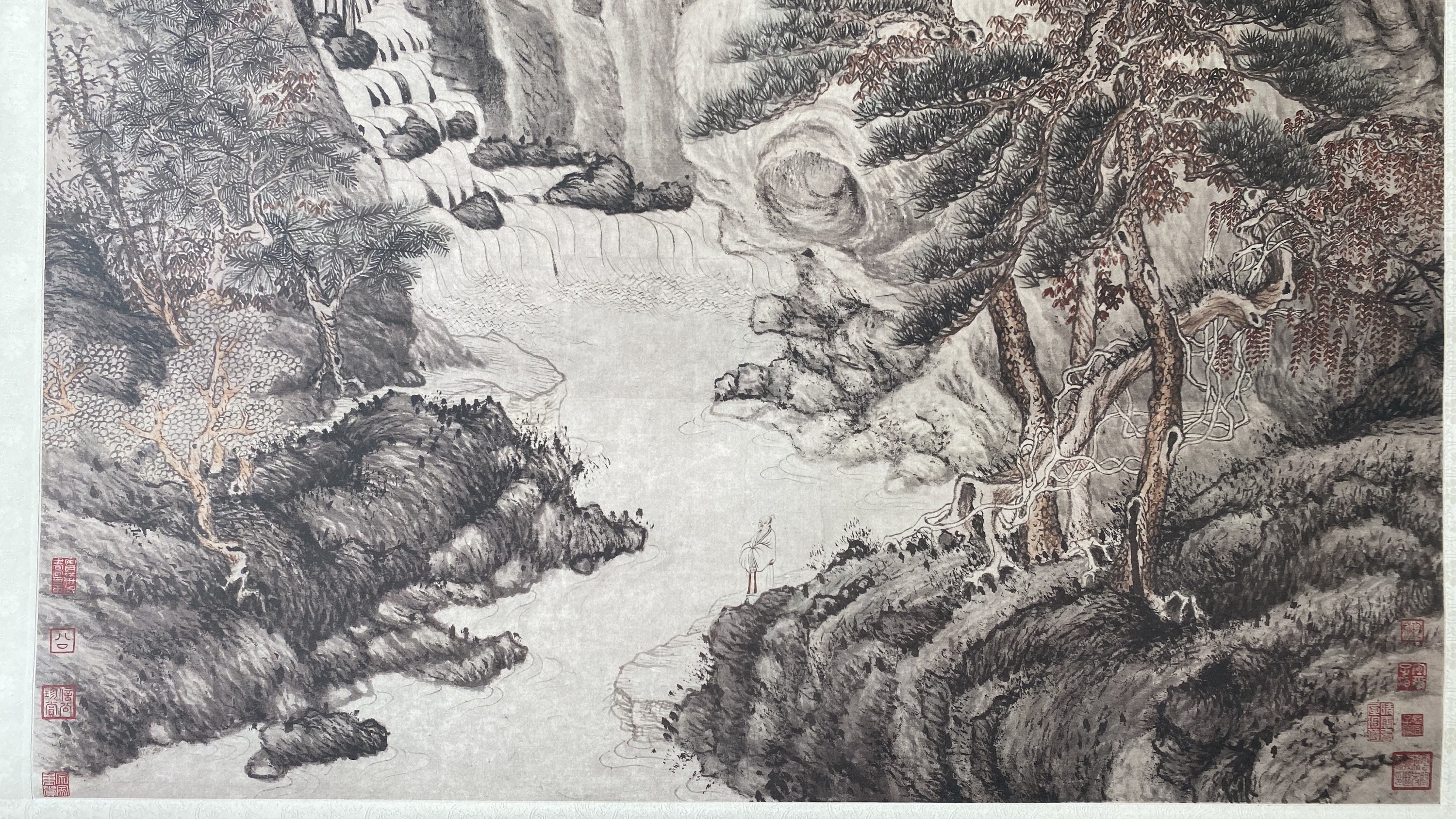 此图描绘的是庐山的景象,画中有白云、杂树、石阶、小路以及人物等。这幅图在技法上借鉴元代画家王蒙的笔意,笔法稳健,气势雄沉,具有强烈的节奏感和力量感。山峰多用解索皴,皴染厚重灵动;中段山峦则用折带皴,皴笔精细,墨色较淡,表现出崖壁的险峻。左边崖壁先匀后皴,墨色较重,并以焦墨密点,显得苍郁幽深。