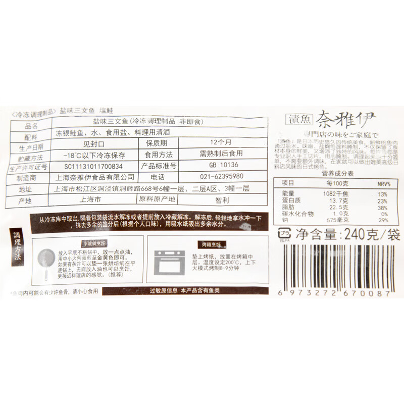 盐味三文鱼 240g/袋【冷冻】(轻盐腌制)