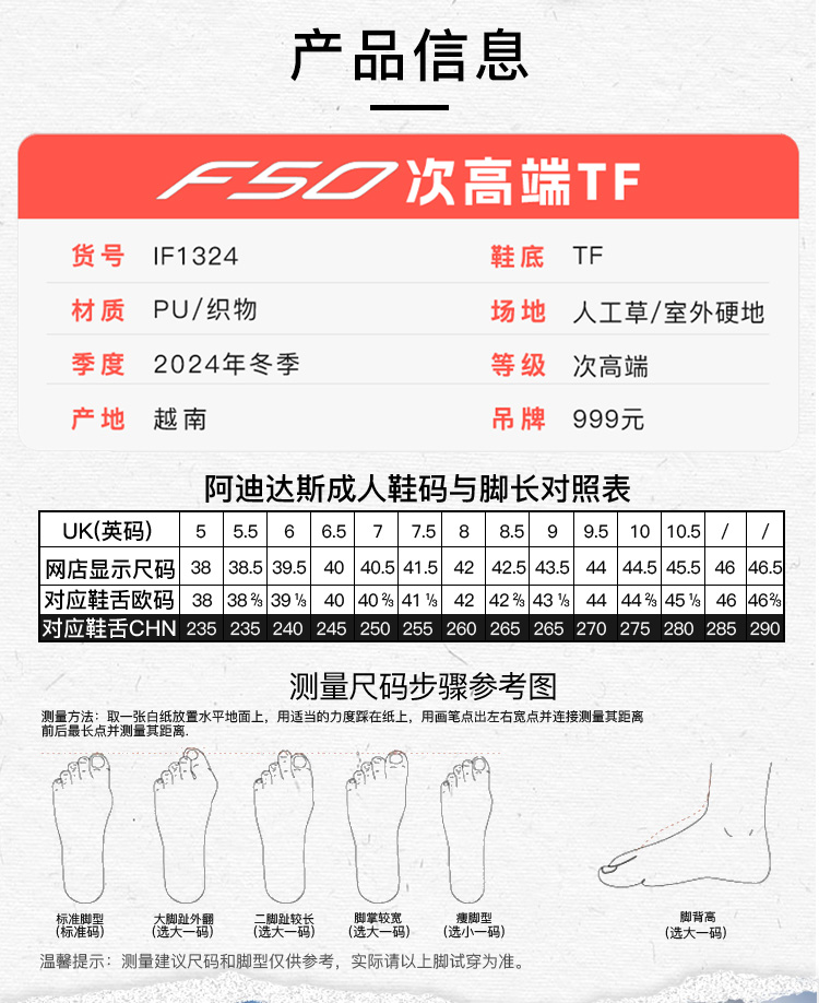 小李子ADIDAS阿迪达斯F50次高端TF碎钉成人足球鞋男IF1324