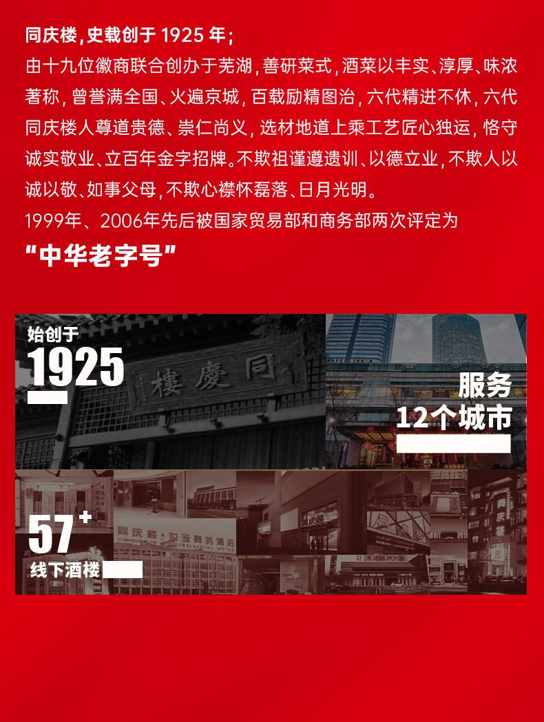 - 同庆楼品牌始创于1925年,是中华老字号,安徽和江苏两省餐饮龙头企业;是中国餐饮上市企业,百强企业,荣获多项荣誉,深受各方关注和好评,赢得海内外宾客广泛赞誉。