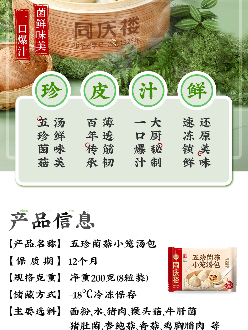 【任选6件59.9元,到手仅9.9元/袋】同庆楼五珍菌菇爆汁小笼汤包200g