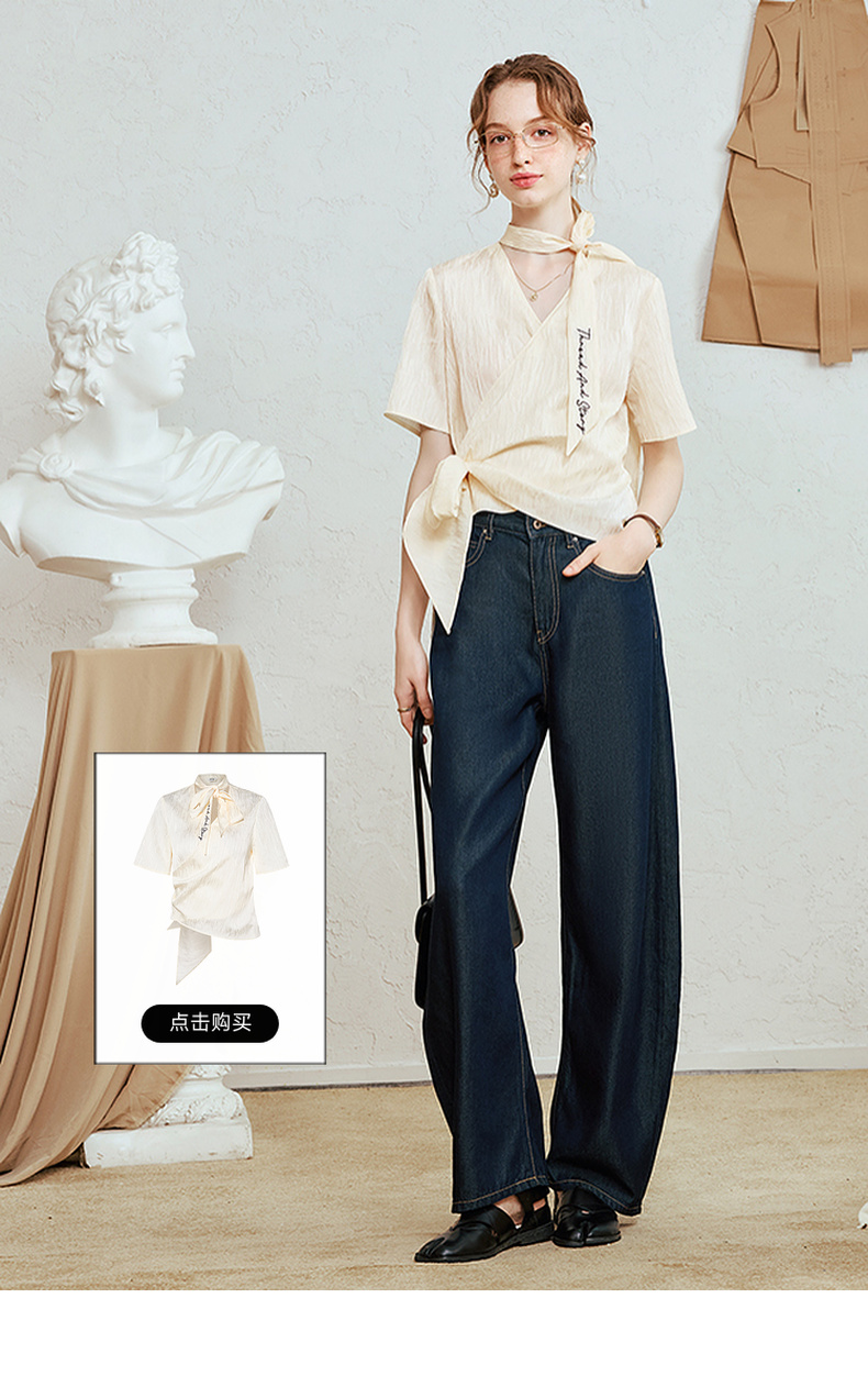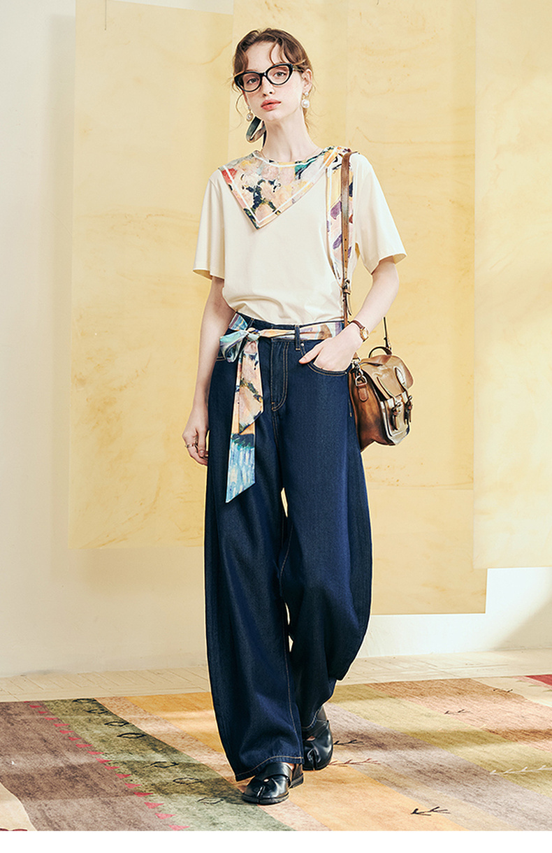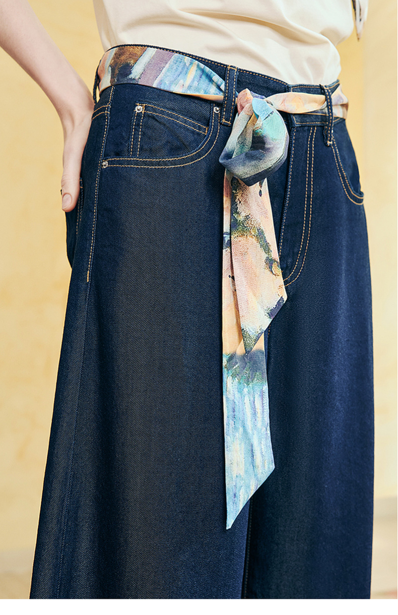 两三事哲思永续2025夏季新款时尚印花丝带装饰弯刀裤牛仔裤女宽松