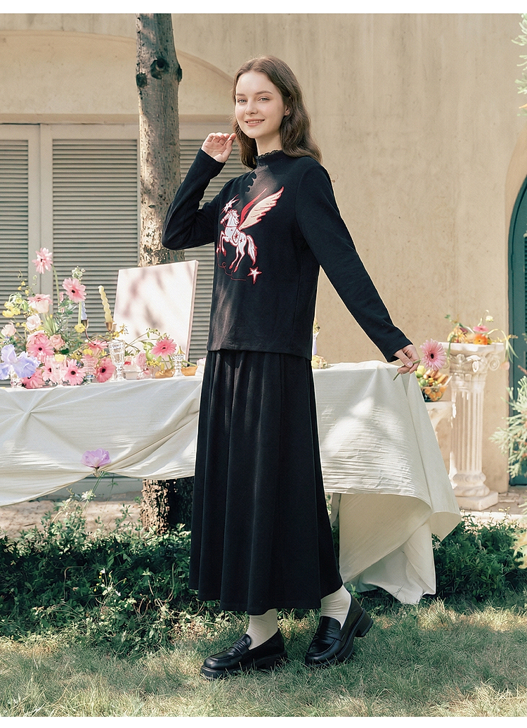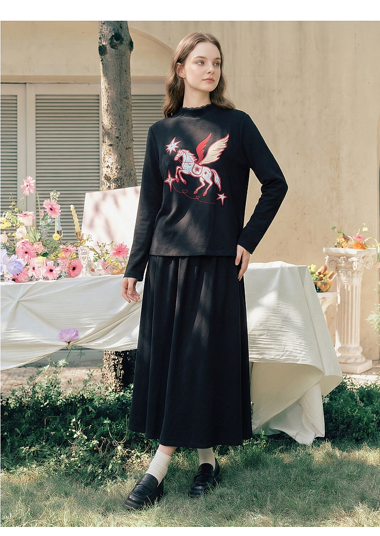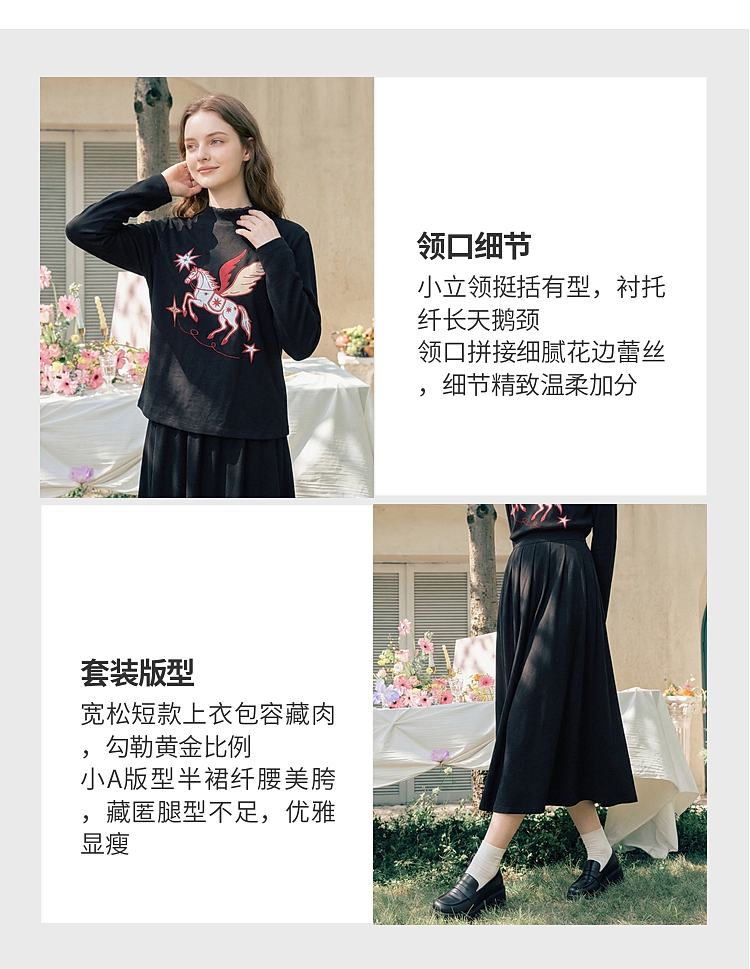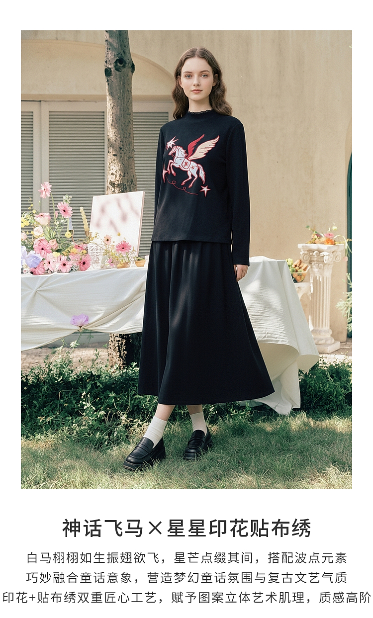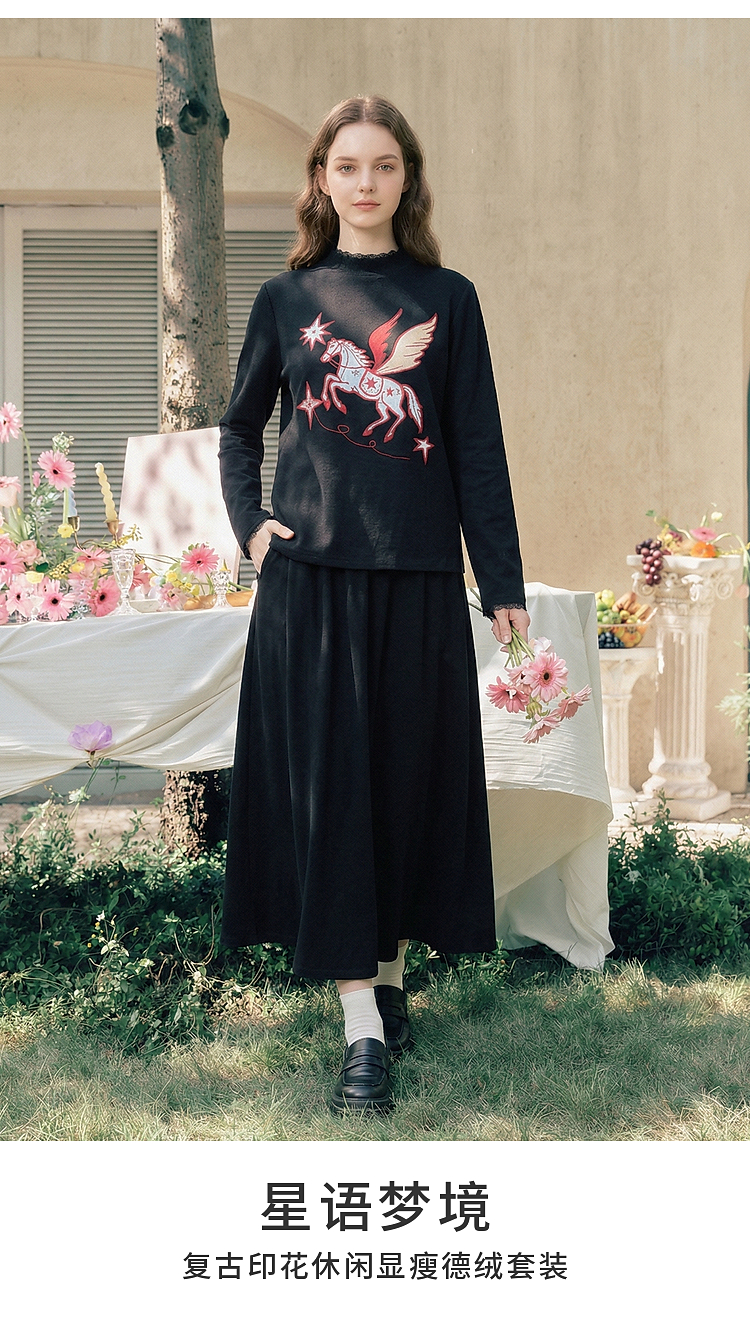 两三事星语梦境2026春季新款复古飞马印花贴布绣上衣半裙两件套女