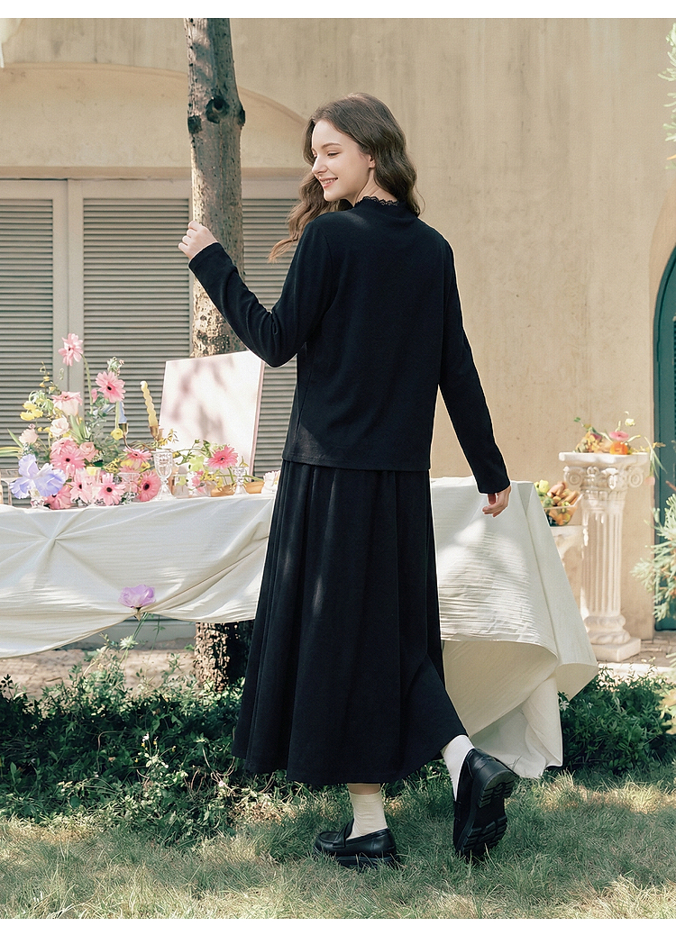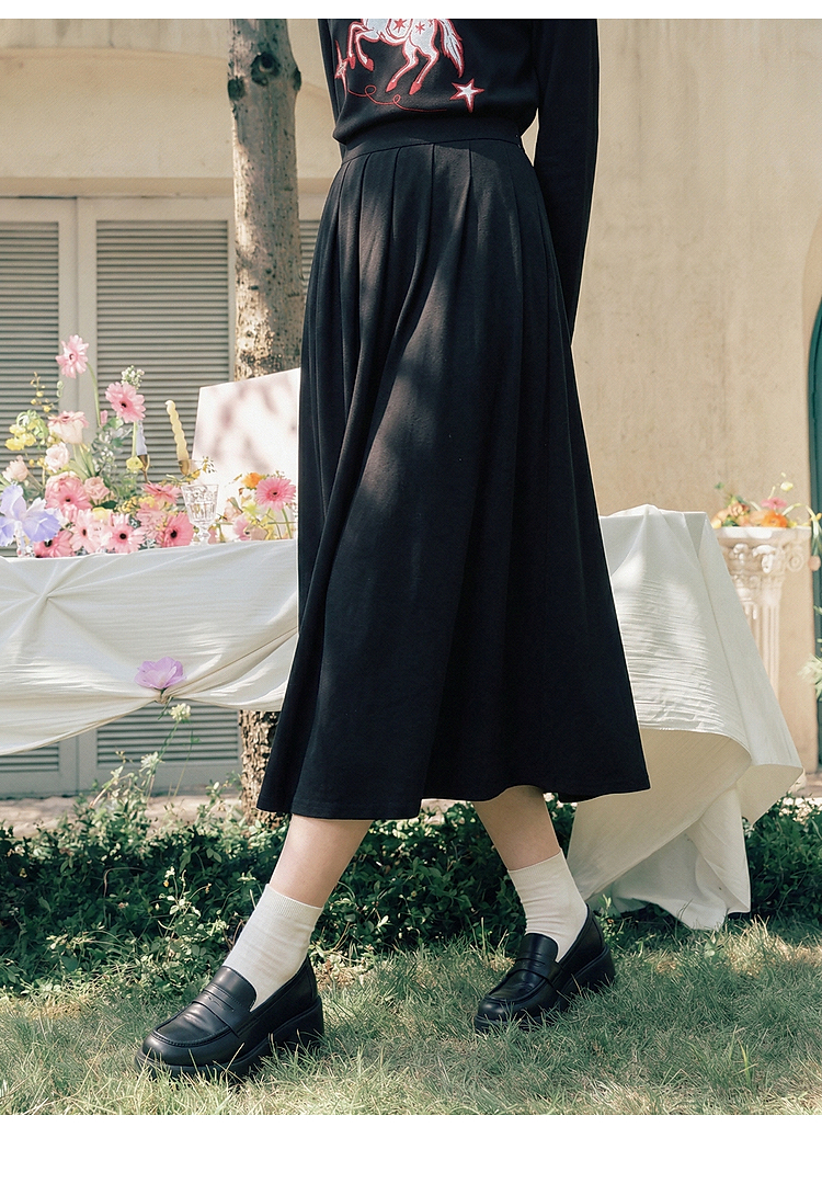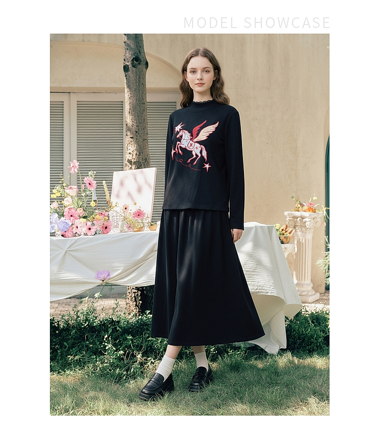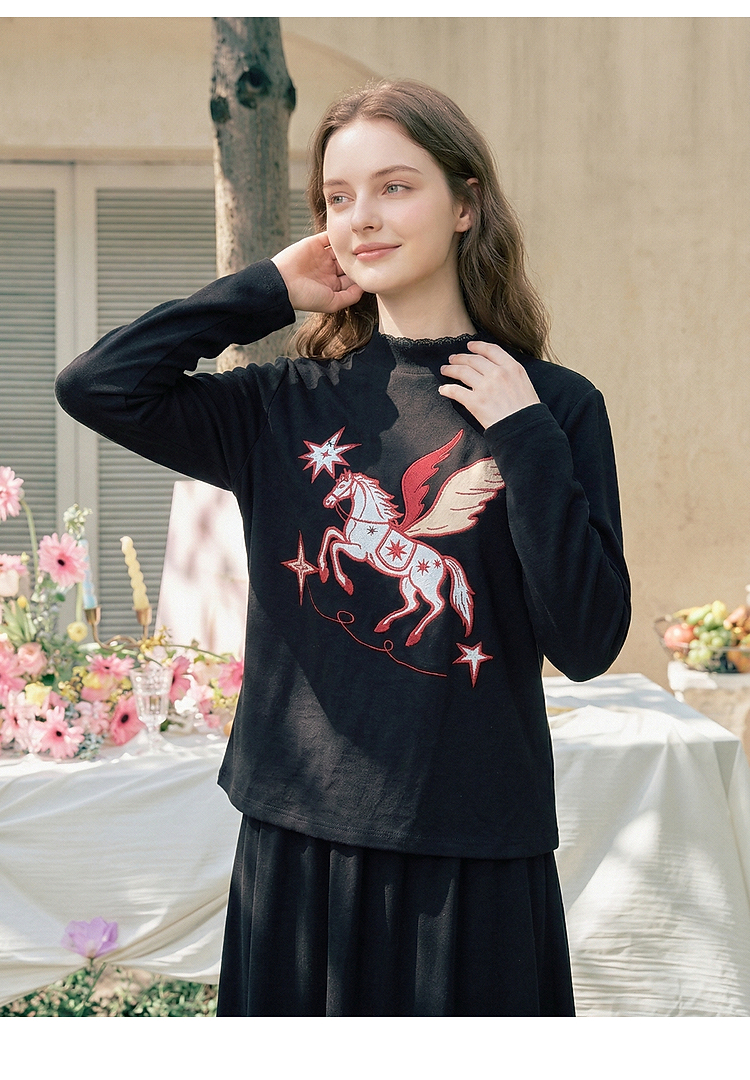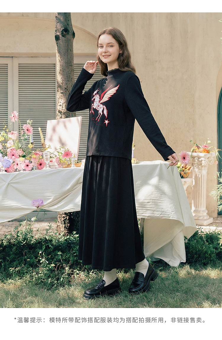 两三事星语梦境2026春季新款复古飞马印花贴布绣上衣半裙两件套女