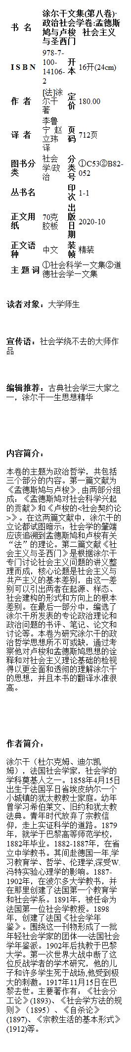 涂尔干文集(第八卷)·政治社会学卷:孟德斯鸠与卢梭 社会主义与圣西门 商务印书馆