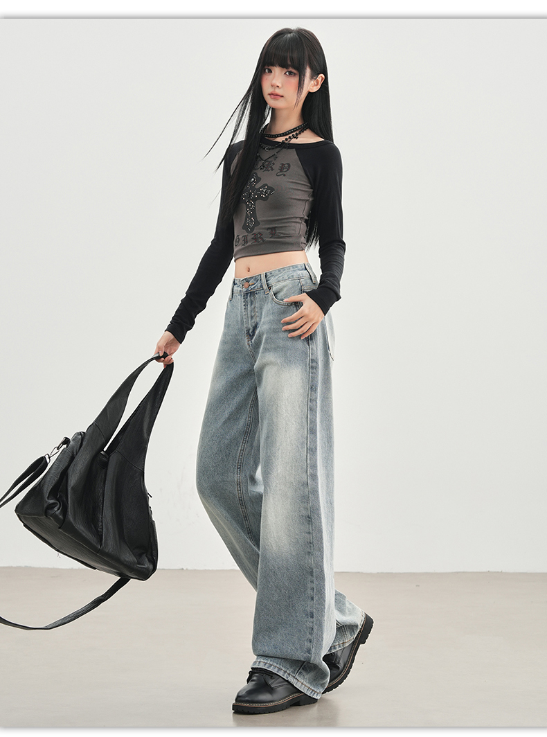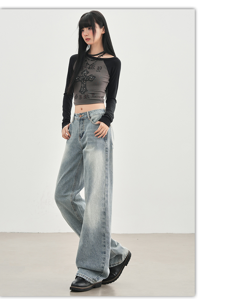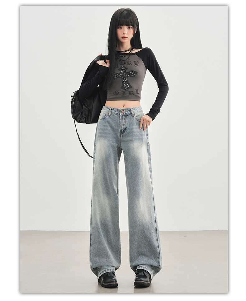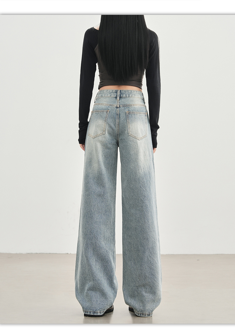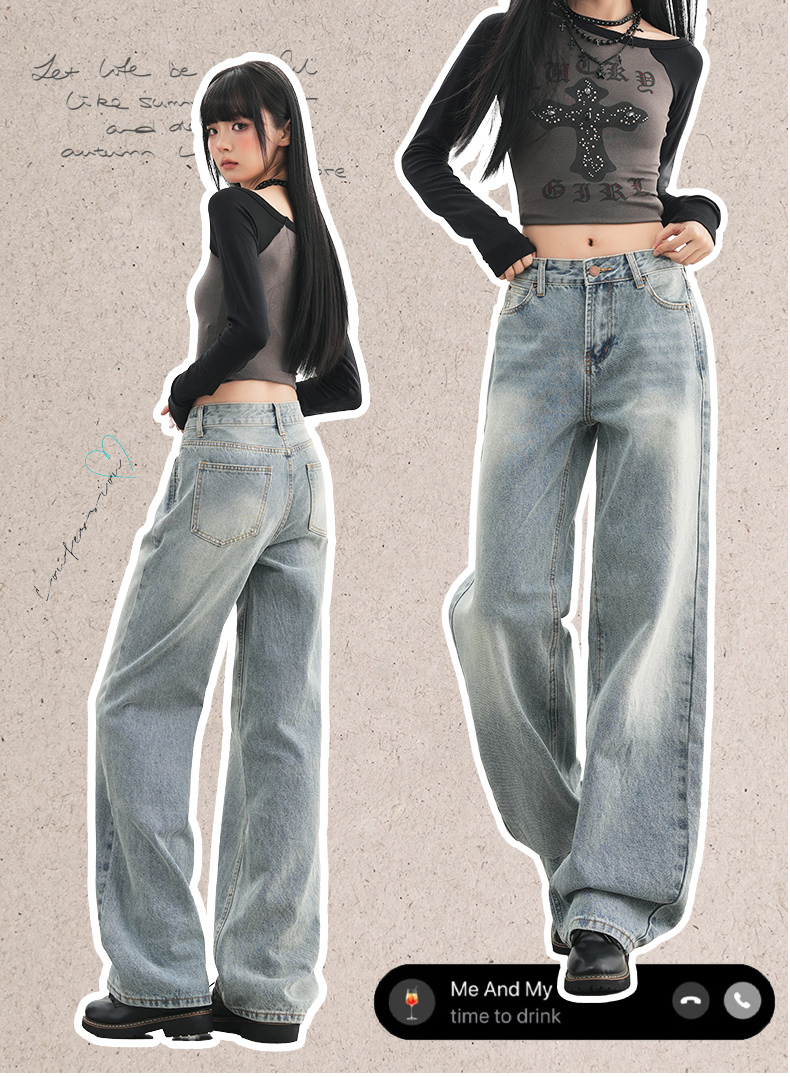 罗蒙秋冬窄版浅色牛仔裤女士复古美式直筒裤宽松显瘦阔腿拖地长裤子