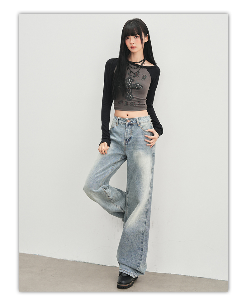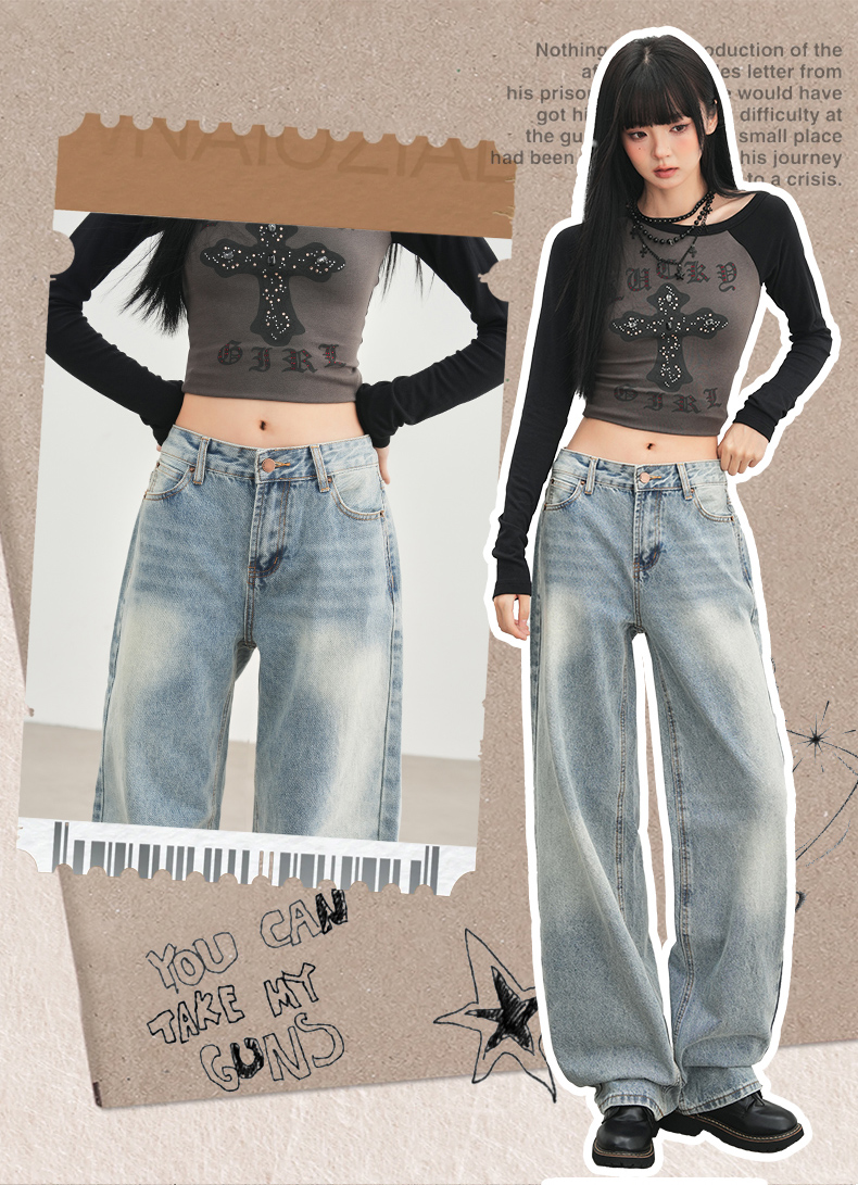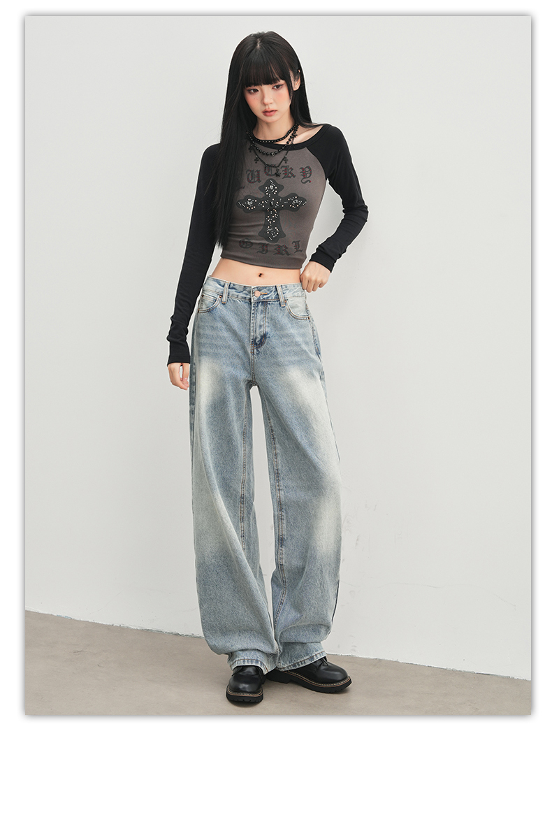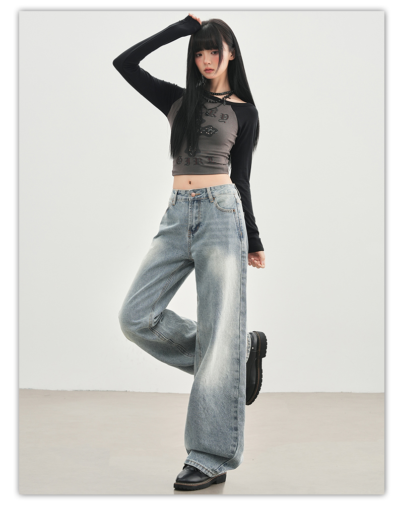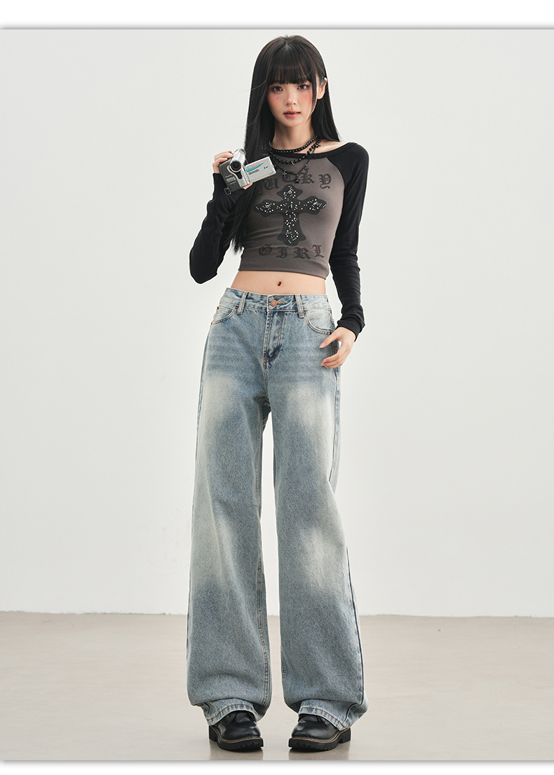罗蒙秋冬窄版浅色牛仔裤女士复古美式直筒裤宽松显瘦阔腿拖地长裤子