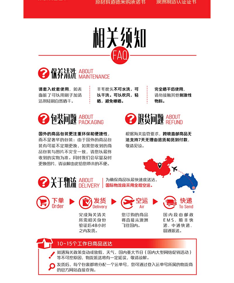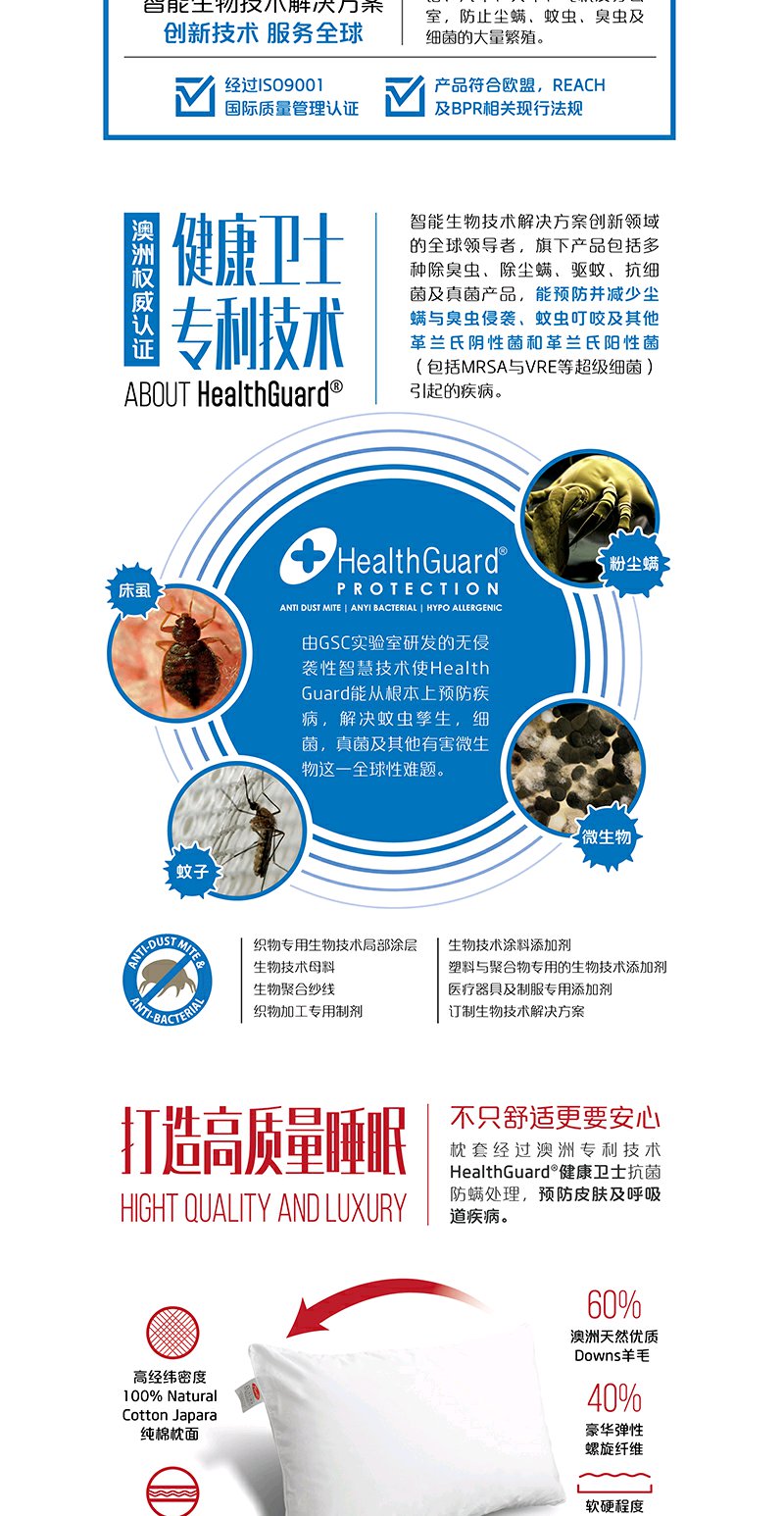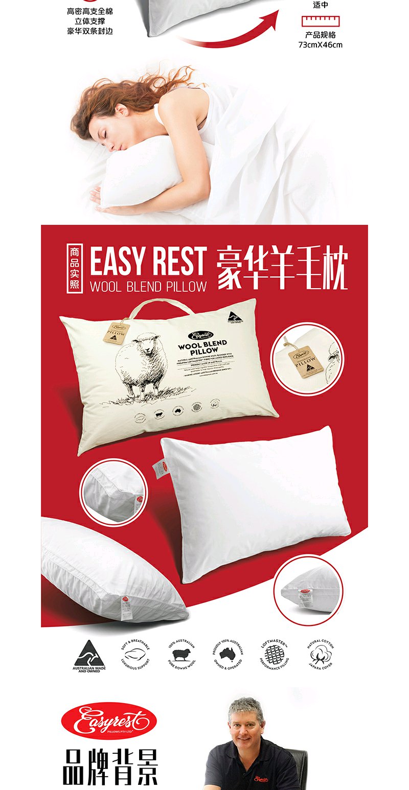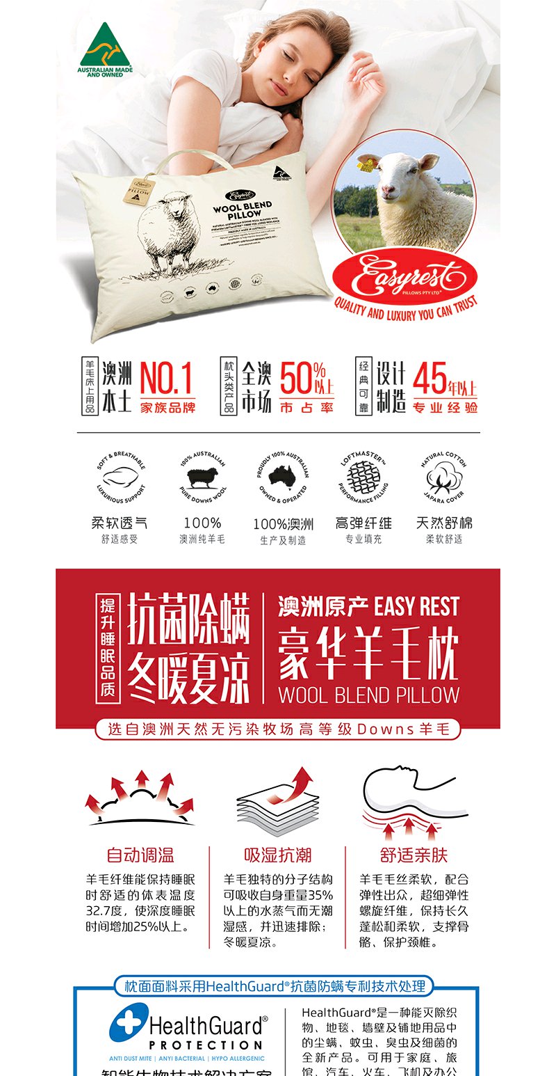 原装进口-澳洲EasyRest成人羊毛枕头健康卫士技术高密全棉面料羊毛枕芯保护颈椎深度睡眠