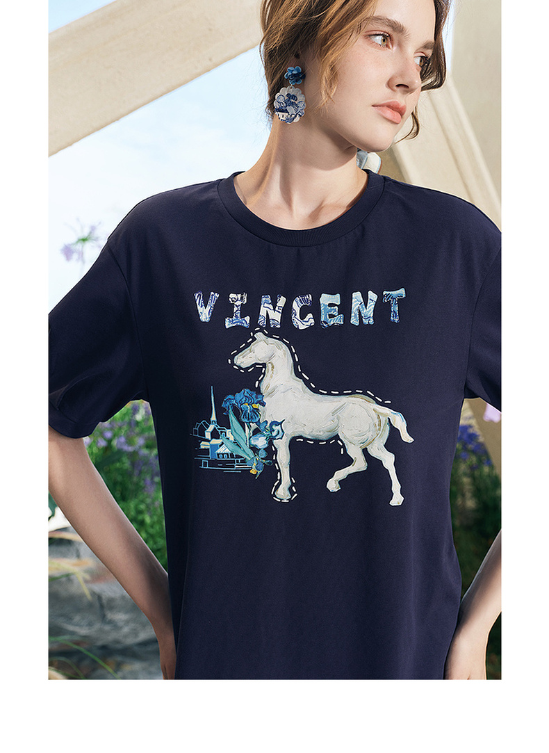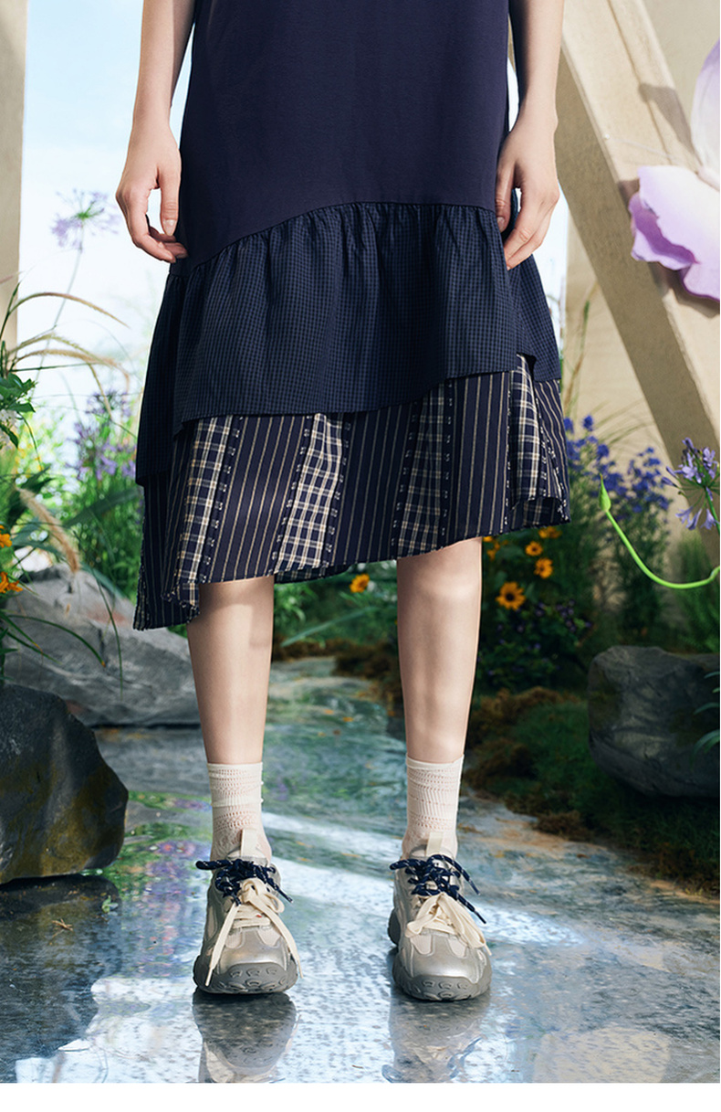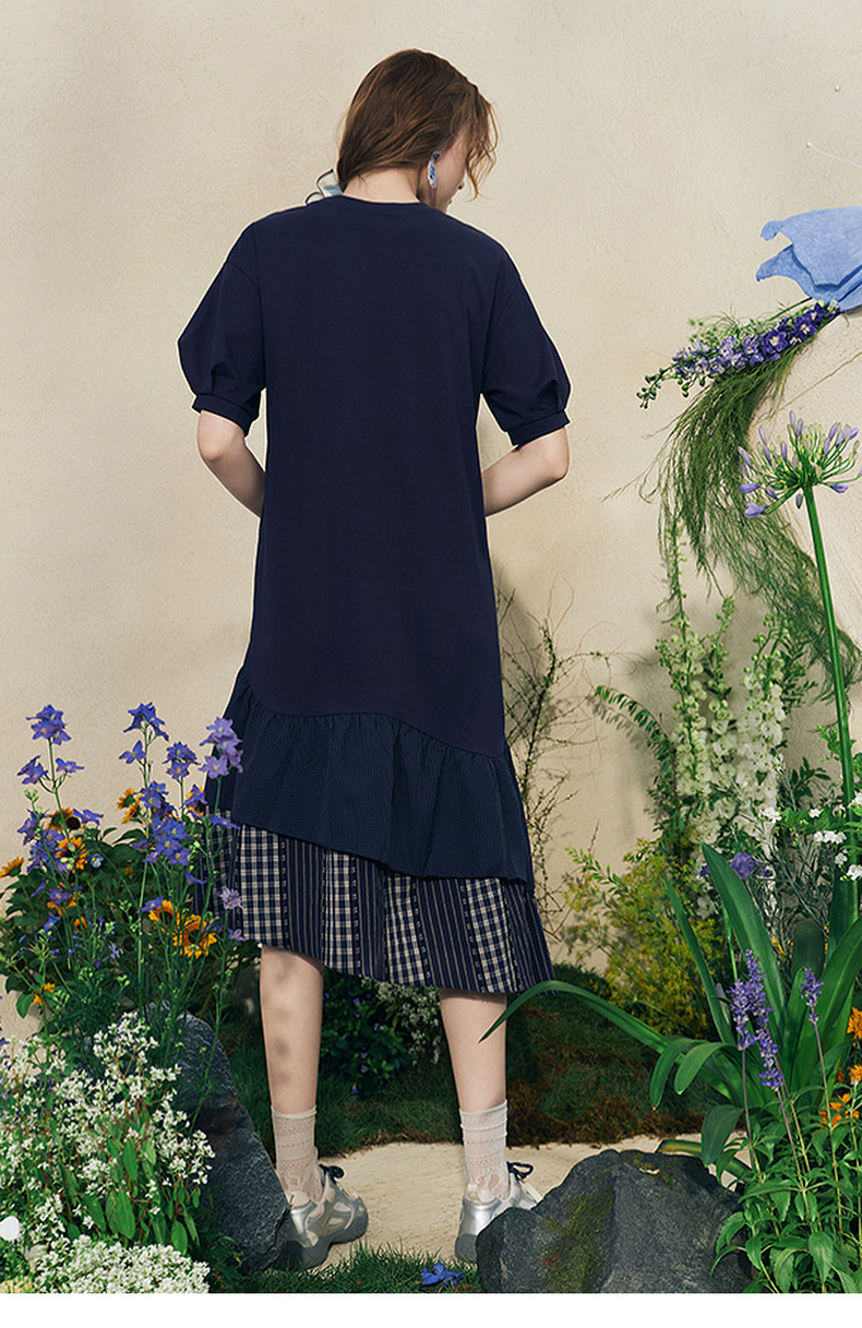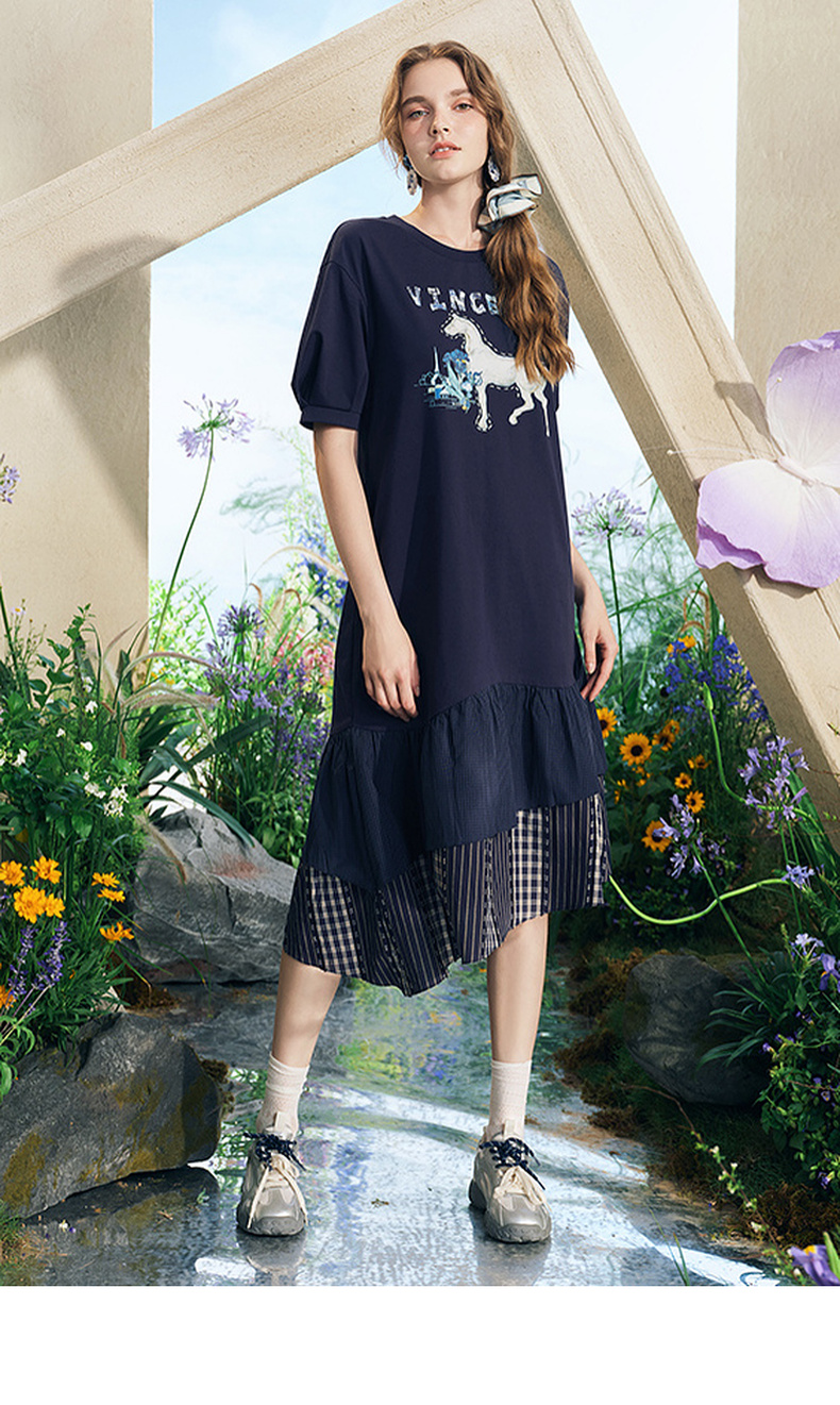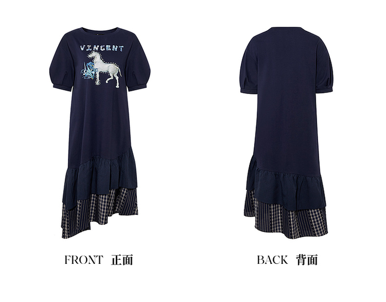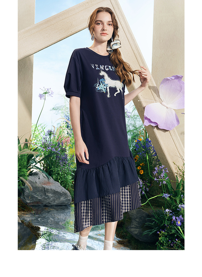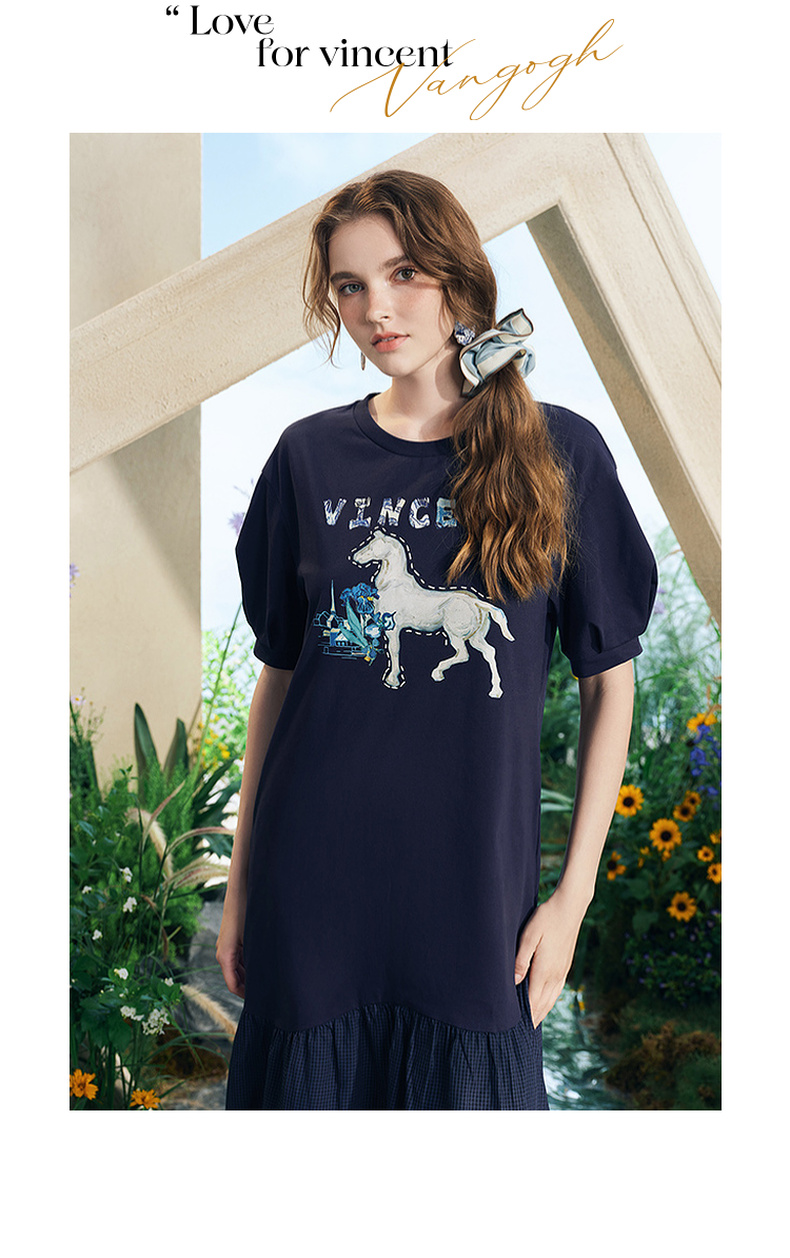 两三事梵高文艺星域骑士2025夏季新款甜美动物印花格子拼接连衣裙