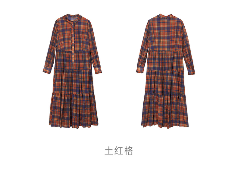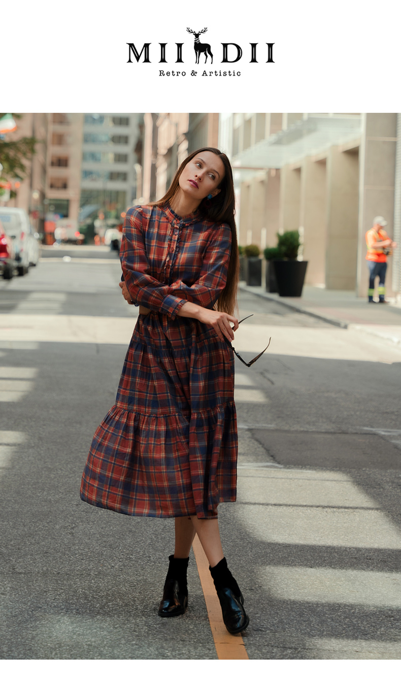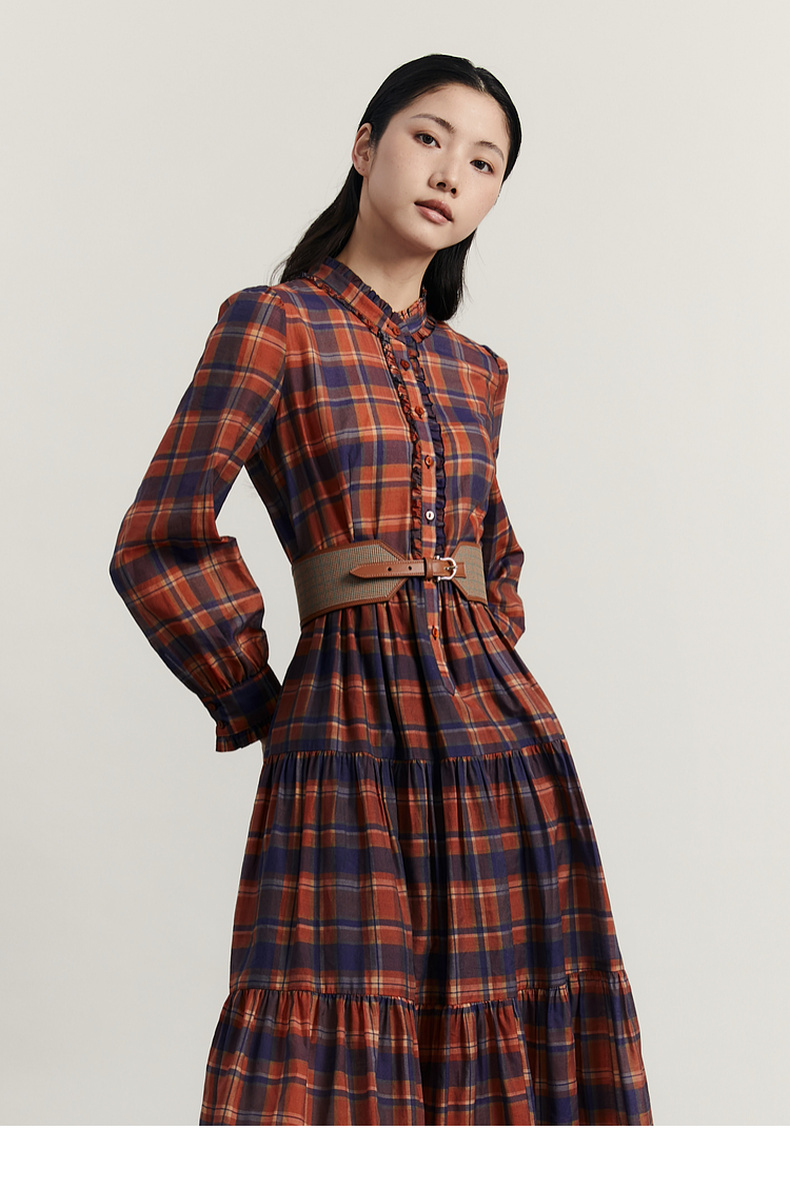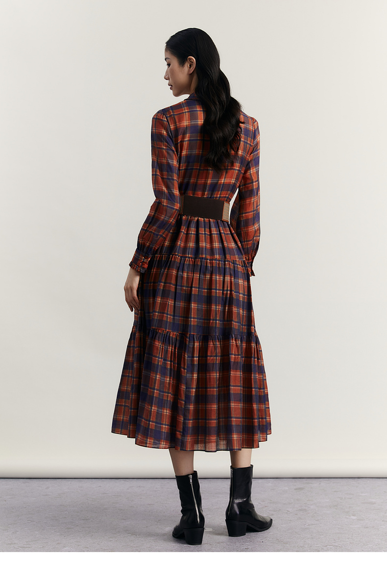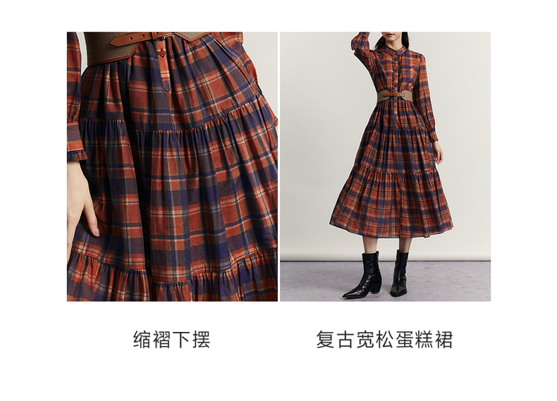 谜底格子连衣裙长袖2023冬季新品复古浪漫大摆型长裙女234ML1566