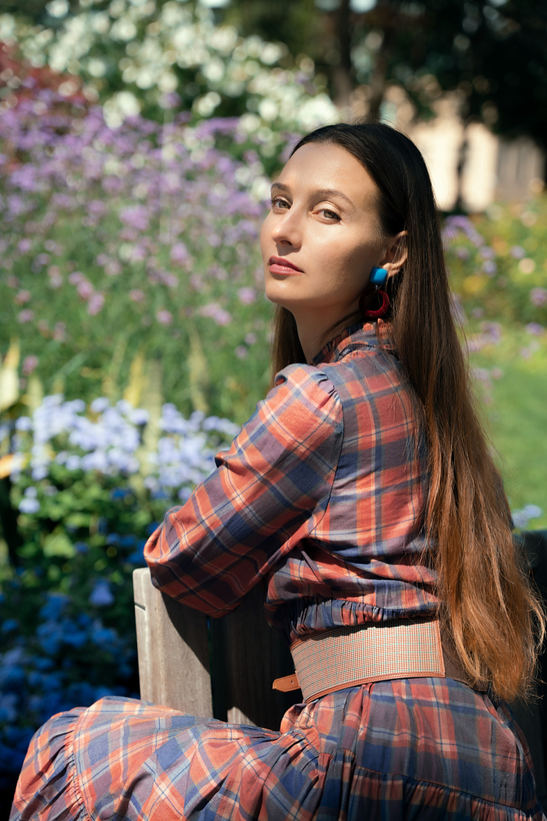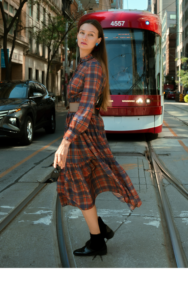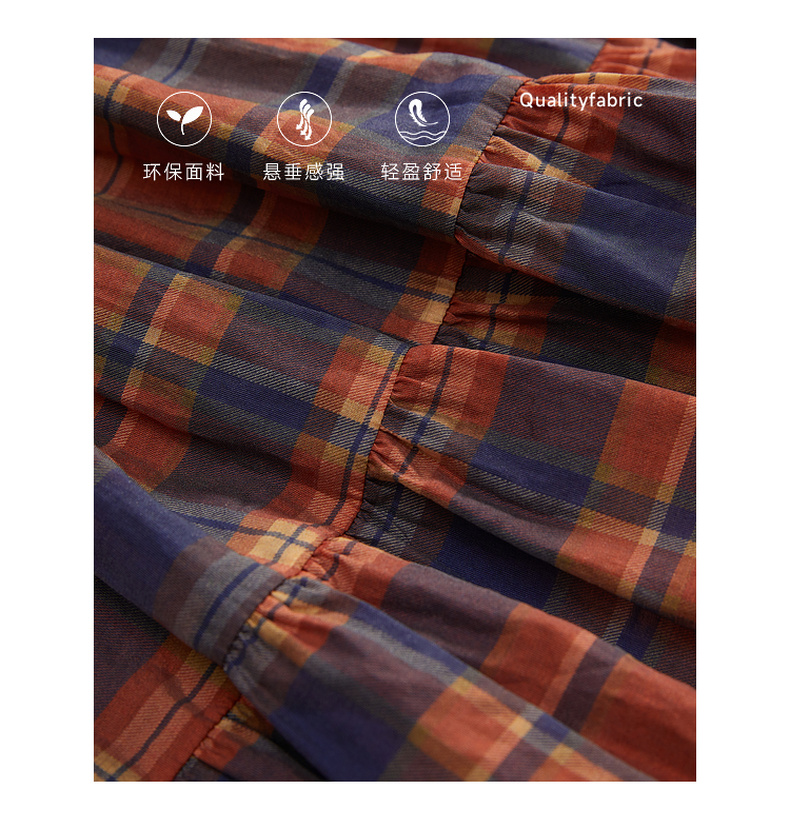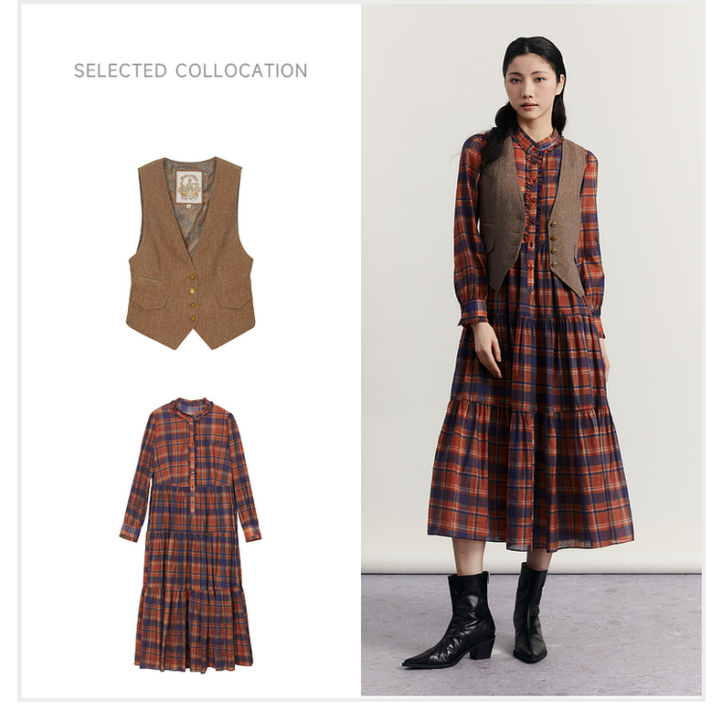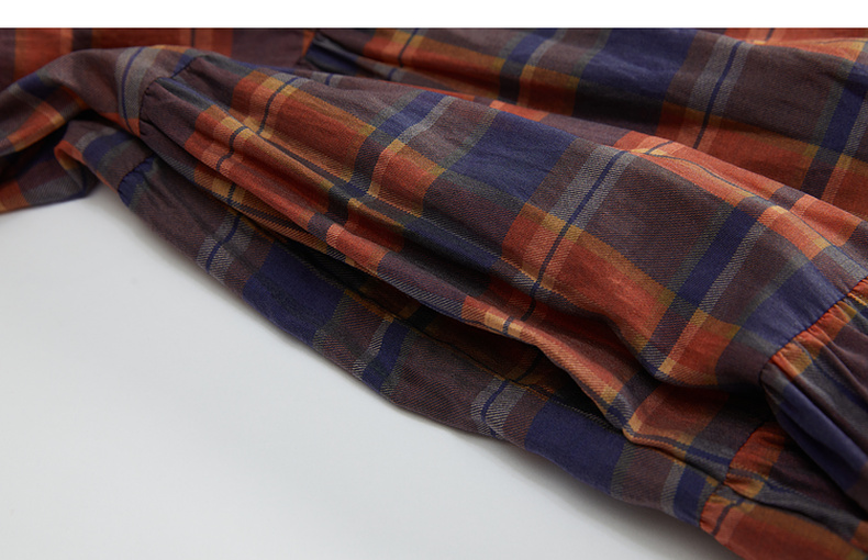 谜底格子连衣裙长袖2023冬季新品复古浪漫大摆型长裙女234ML1566