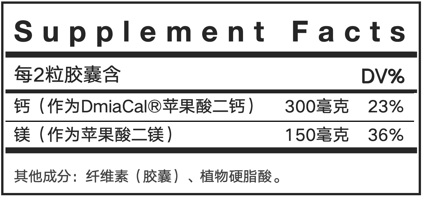 氨基酸螯合形式的2:1比例钙镁配方,以支持骨骼、肌肉、心血管健康。