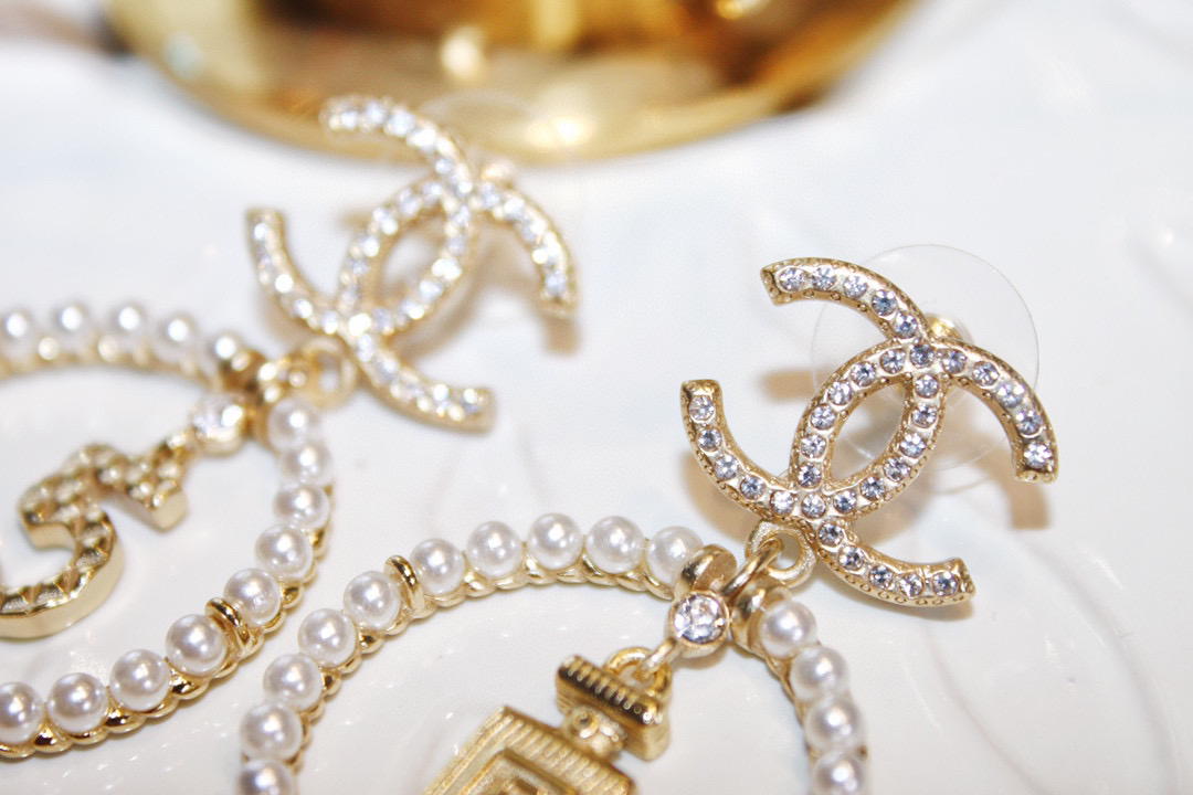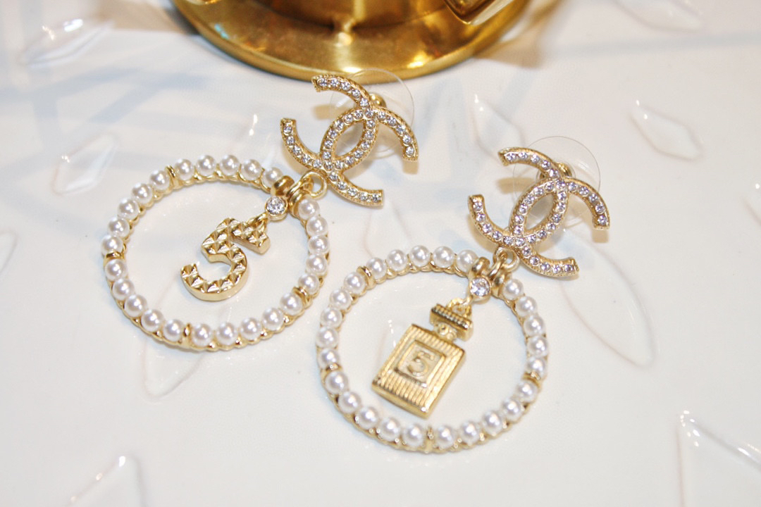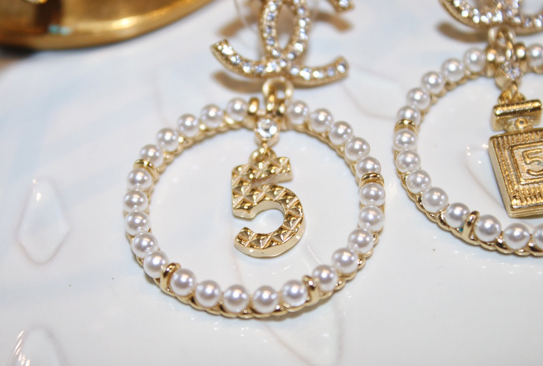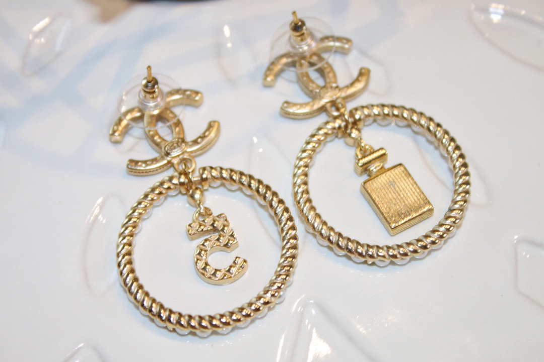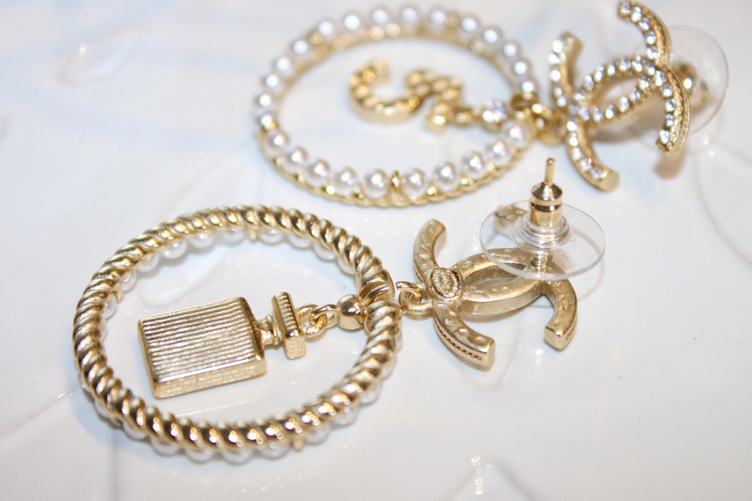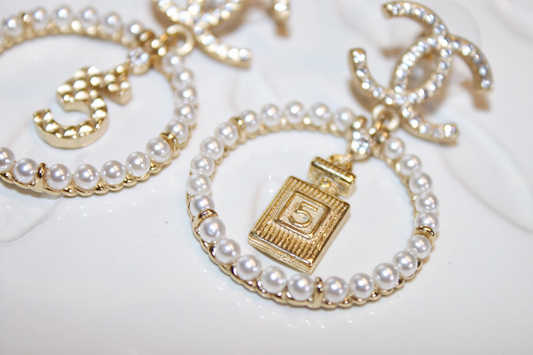 CHANEL香奈儿金色圆形双c珍珠 5号香水瓶 耳钉耳环