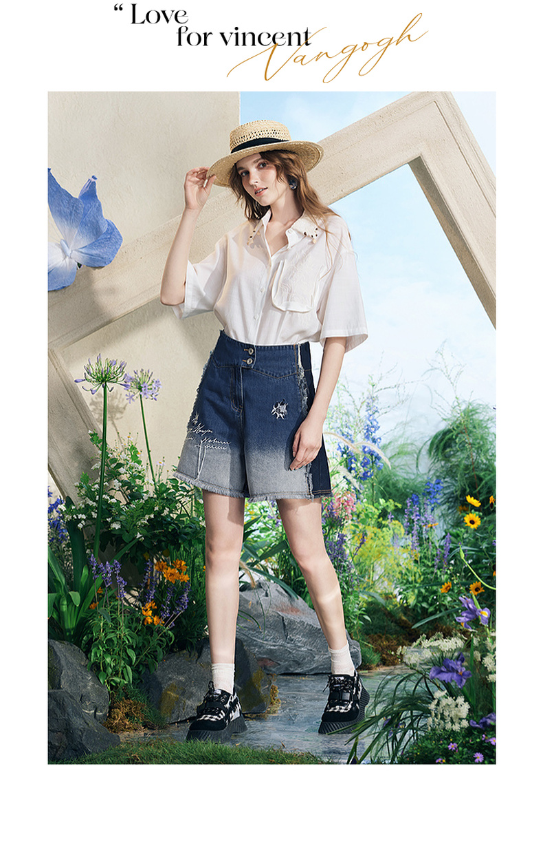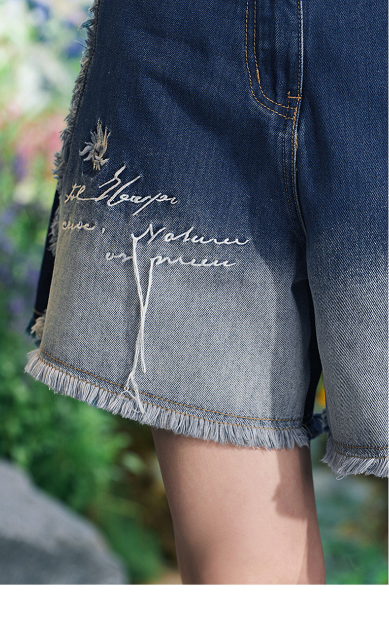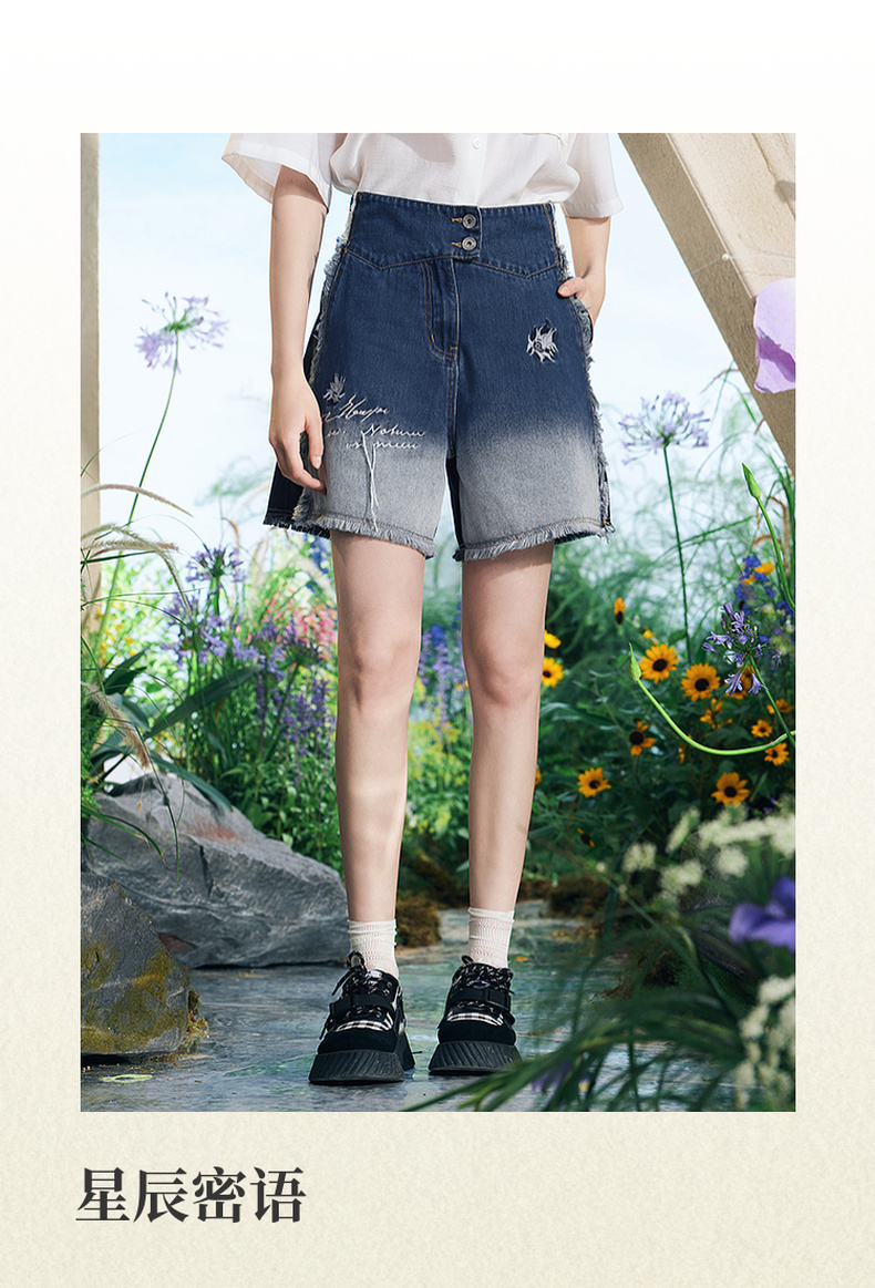 两三事梵高文艺星辰密语2025夏新款毛边裤脚口渐变刺绣牛仔裤女