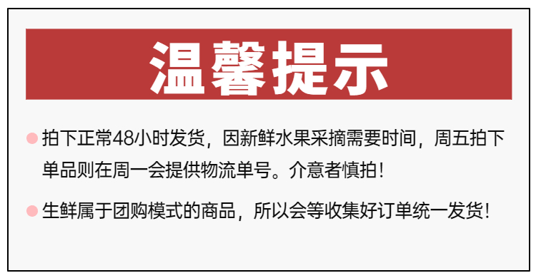 3.此产品为生鲜,不支持7天无理由退换货。收到 货有任何问题,12小时内坏果拍照+订单信息+快递面单,联系客服赔偿处理